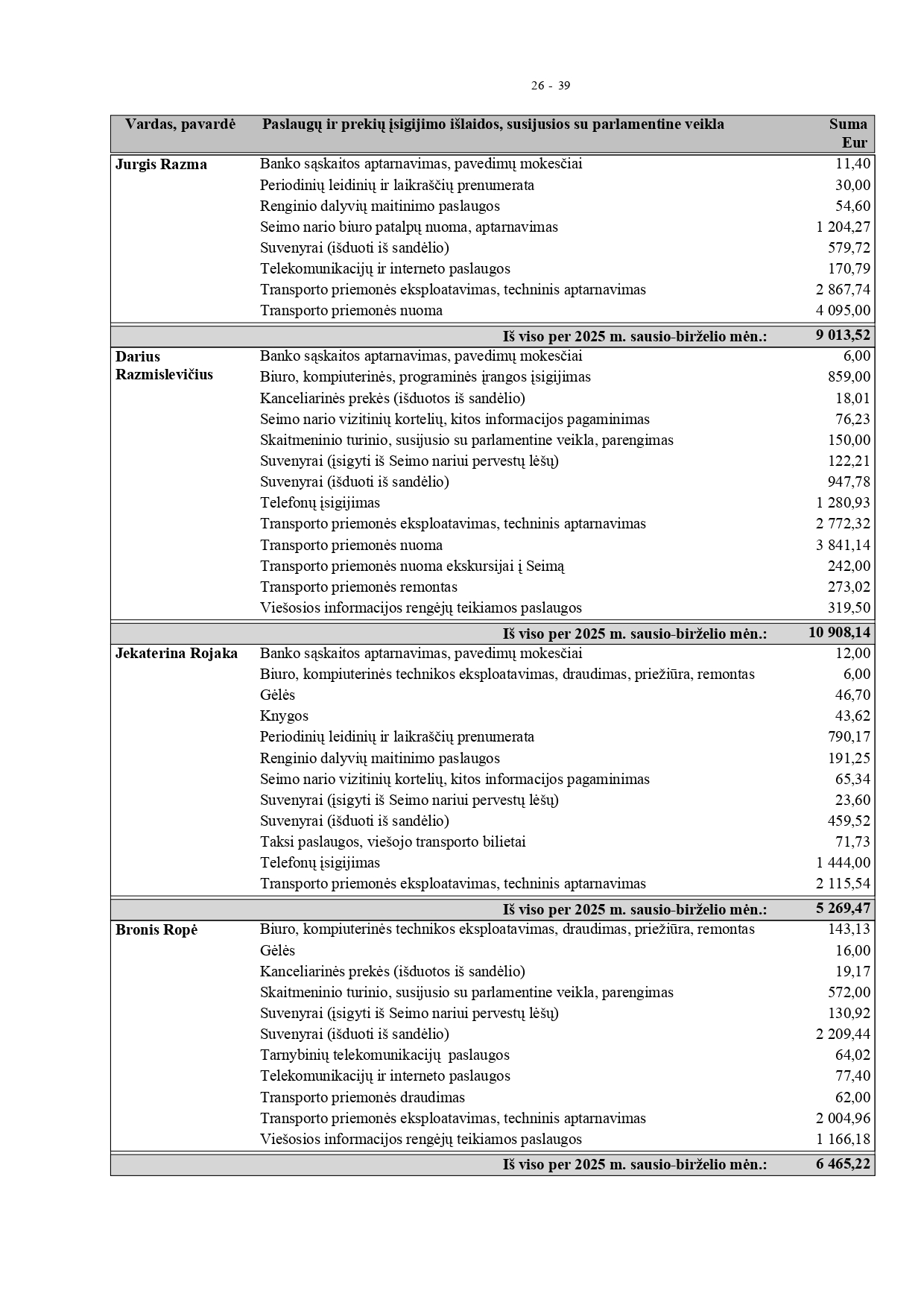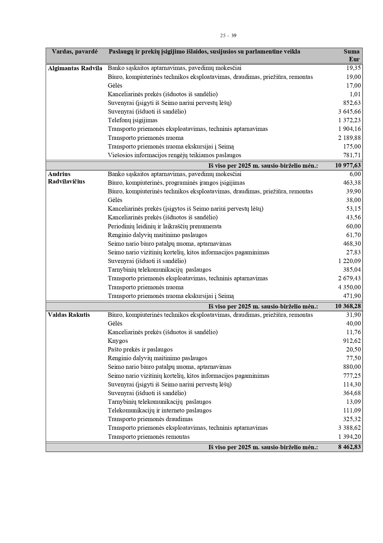 „Čia išnagrinėtos pirmojo pusmečio išlaidos“, – sakė Tadas Barauskas. Jo teigimu, išlaidų kaip Seimo narys jis patyrė nemažai: teko „paleisti į darbą“ tris kabinetus Vilniuje, Zarasuose ir Rokiškyje, supirkti darbo priemones. „Be to, Zarasuose ir Rokiškyje yra penkios sklaidos priemonės, nė vienos neignoruoju, visose skelbiu informaciją. Nuomojuosi dešimties metų senumo automobilį „VW Passat“ už 550 eurų. Ta pati pradžia limitams buvo imli“, – komentavo Seimo narys.
