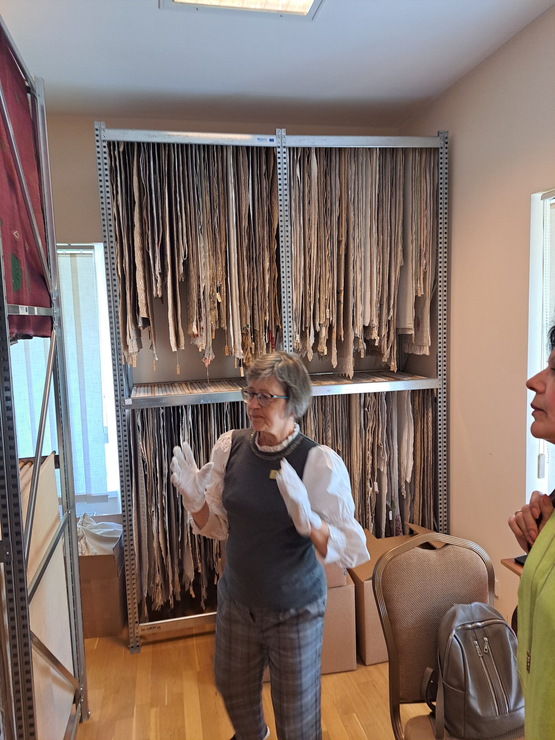 Tekstilės saugykloje gražiai sukabintos senųjų audėjų drobės: rankšluosčiai su kruopščiai išaustais audėjų inicialais ar vardais, spalvingos lovatiesės. Seniausi eksponatai, pasak muziejininkės-rinkinių saugotojos Giedrės Spundzevičienės, iš XIX amžiaus vidurio, bet yra ir vos 20–30 metų senumo tautodailininkių darbų. Įvairūs raštai, audimo technikos, spalvos, ornamentika, medžiagos. Tarp seniausių audinių – dabar jau egzotiškos lovatiesės iš kanapių, kanapių ir vilnos, kanapių ir linų pluoštų. Kanapių pluoštas gerokai kietesnis, daugiausia naudotas virvėms vyti, o ne audimui, todėl šie darbai vieni vertingiausių. Tekstilės saugykloje dar pakankamai vietos ir naujiems eksponatams, kurių darbščios mūsų krašto audėjos, tikėkimės, nepagailės.