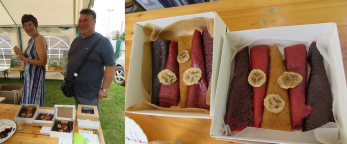 Vita Urbietienė: „Imam kokias norime uogas ar vaisius, sutriname vaisių ir daržovių trintuvu, pridedame šiek tiek medaus ir būtinai bananų. Paragaujam, ar atitinka mūsų skonį. Džioviname orkaitėje arba džiovyklėje (aš turiu tam pritaikytą). Bananai reikalingi, kad masė įgautų tąsumo, nes kitaip saldainių nesusuksime. Kokiu santykiu jų dedama? Tai individualu, priklauso nuo vaisių ar uogų. Tikslių proporcijų nėra, reikia tiesiog bandyti. Treti metai šitaip pasidarome saldainių, tad jau žinome, kurioms uogoms reikia to lipnumo. Labai sunkiai limpa juodieji serbentai, nes jie turi daug pektinų. Juodųjų serbentų galima tiesiog įmesti į kitokių uogų masę. Mums labai patinka rabarbarų saldainiai (mes taip vadiname, nors iš tikrųjų tai vaisinės lazdelės). Trintuvu sutriname rabarbarus (negali būti peraugę, nes tokie turi daug „siūlų“), dedame medaus ir bananų. Skonį labai pagerina braškės.