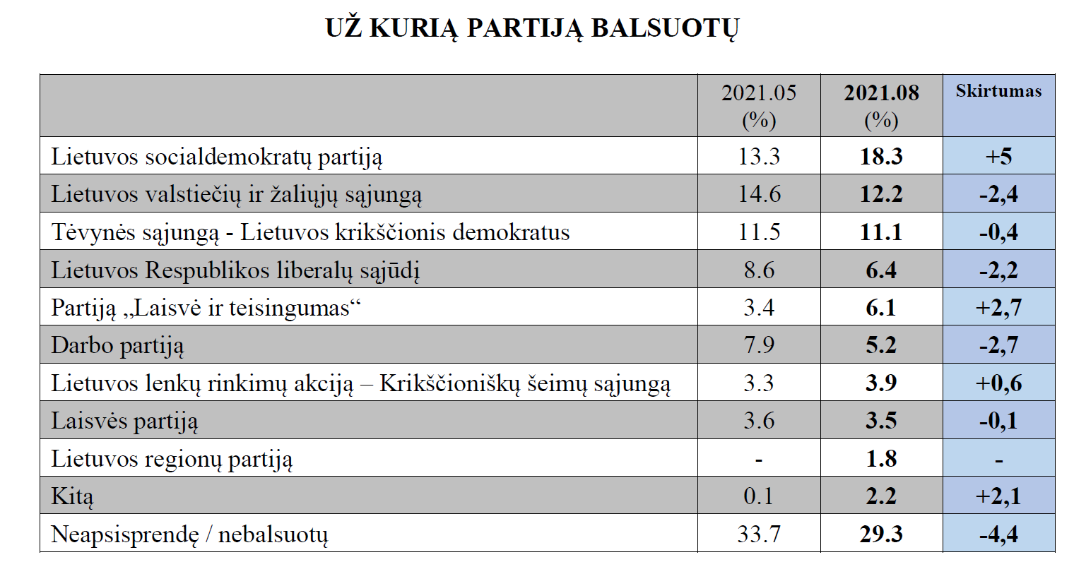 Naujienų agentūros ELTA užsakymu rugpjūčio 20–31 dienomis atliktos „Baltijos tyrimų“ apklausos duomenimis, jei artimiausiu metu vyktų Seimo rinkimai, didžiausią gyventojų palaikymą turėtų Vilijos Blinkevičiūtės vadovaujama Lietuvos socialdemokratų partija (LSDP) (18,3 proc.). Lyginant šiuos rezultatus su dar pavasarį atlikto tyrimo duomenimis, kairiosios politinės jėgos populiarumas augo intensyviausiai – 5 procentiniais punktais. Gegužės mėnesį socialdemokratus rėmė 13,3 proc. gyventojų.