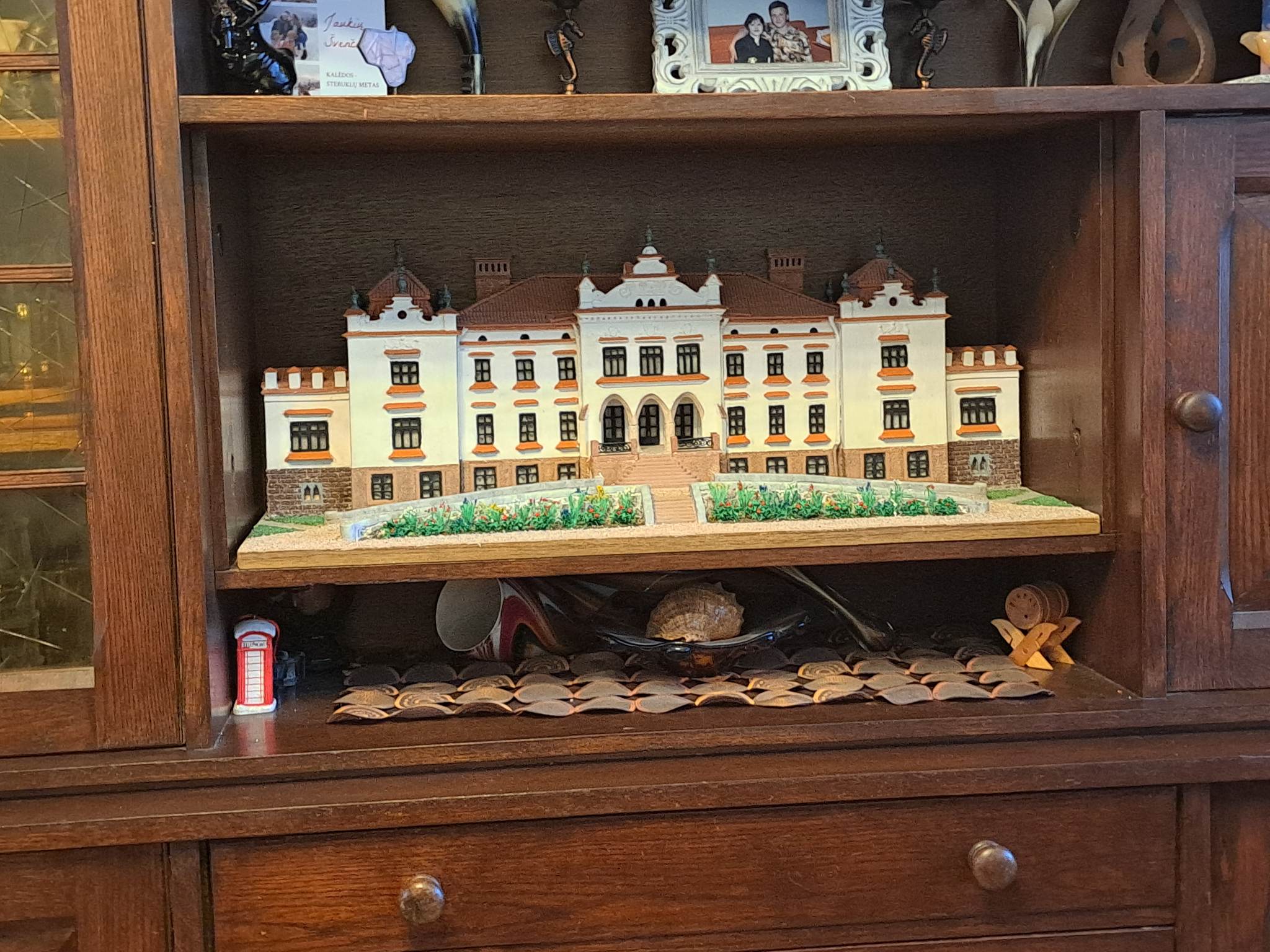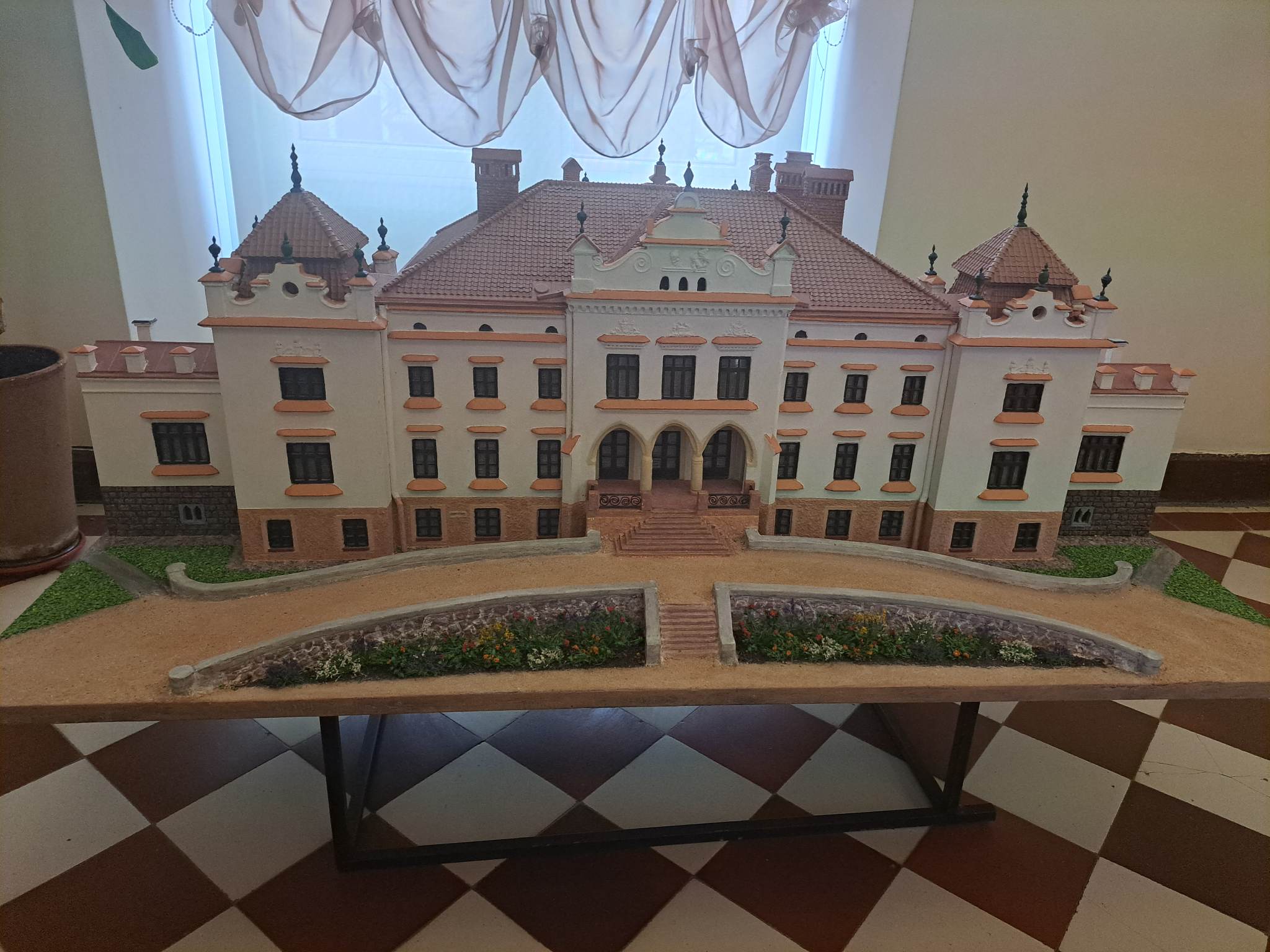 Dabar muziejuje eksponuojamas maketas, kurio ilgis – 120 cm, plotis – 80 cm, aukštis – 40 cm. Pasak autoriaus, šiuos „rūmus“ jam nebūtų lengva nešti – jų svoris apie 20 kg. Mažasis maketas atsidūrė jam skirtoje vietoje – namų sekcijos lentynoje. Tik iš pirmo žvilgsnio maketas gali atrodyti didelis, vientisas kūrinys. Iš tiesų tai juvelyrinio kruopštumo reikalaujantis darbas. Pavyzdžiui, stogo detales A. Masteika pagamino iš plastikinių pakuočių nuo tortų bei sausainių. Palangės – iš ledų pagaliukų. Visas fasadas – iš įvairaus pločio faneros. Na, o dekoracijos (pvz., laiptų turėklai) padaryti iš vielučių, augalai – iš papurentų lininių virvučių, grindinys priešais įėjimą – tai glaistas, medžio pjuvenos, smulkūs akmenukai…