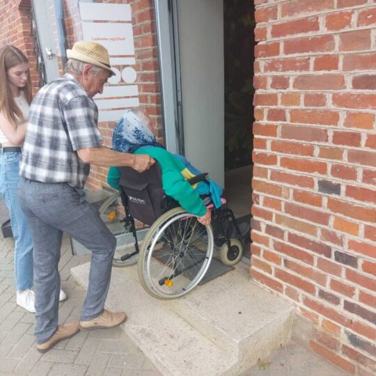 Į „Gimtojo...“ redakciją atbėgęs Rokiškio neįgaliųjų draugijos pirmininkas Algis Veikšys emocingai pakvietė pažiūrėti į neįtikėtiną šiais laikais reiškinį – kaip vežimėlyje sėdintį neįgalų žmogų tenka įkelti į SWEDBANK Rokiškio skyriaus patalpas.