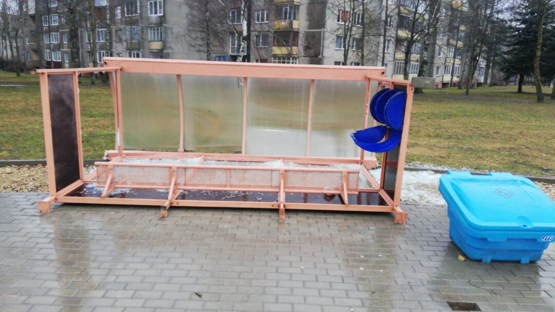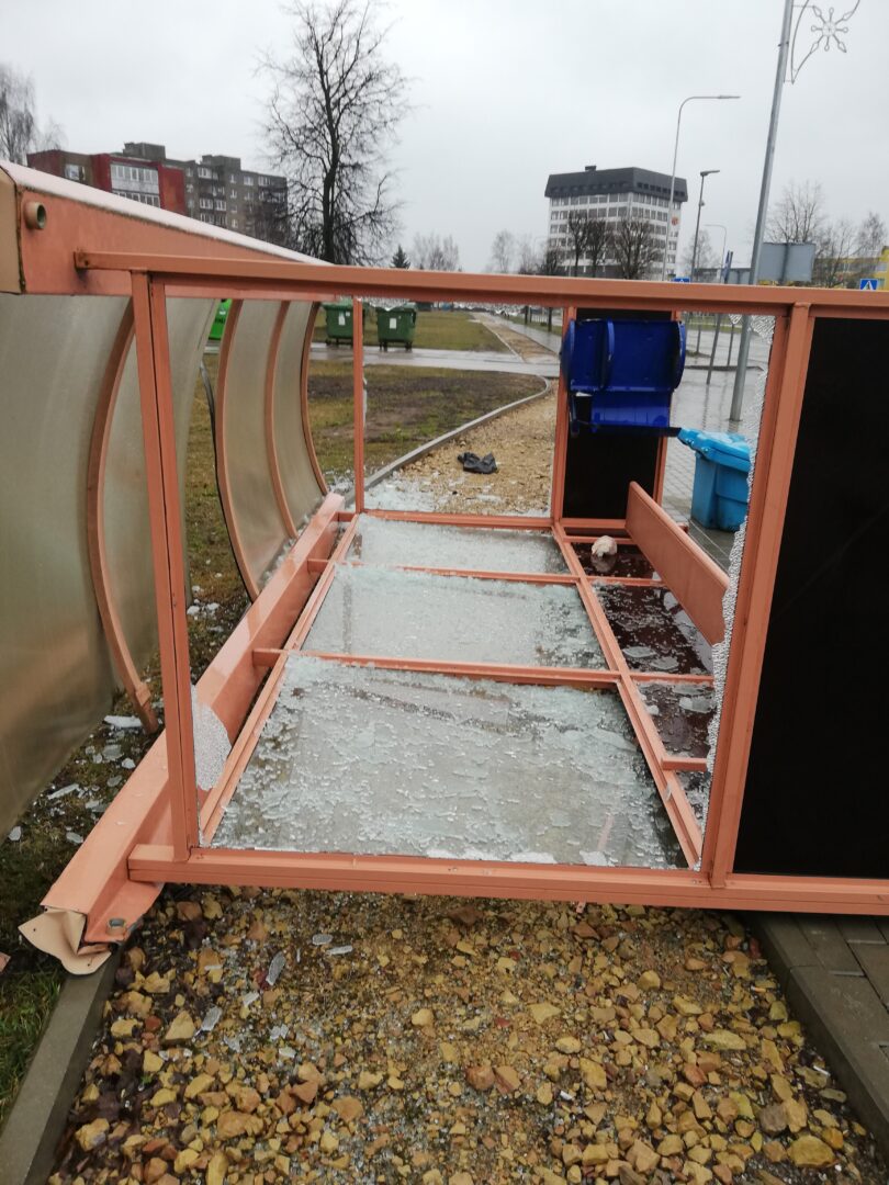 Šeštadienį siautėjęs stiprus vėjas pridarė nuostolių – paguldė ant šono Panevėžio gatvės autobusų stotelės pastogę ir išdaužė langus.