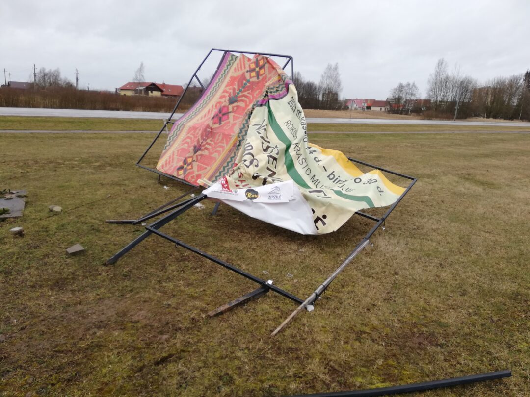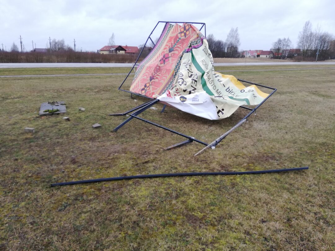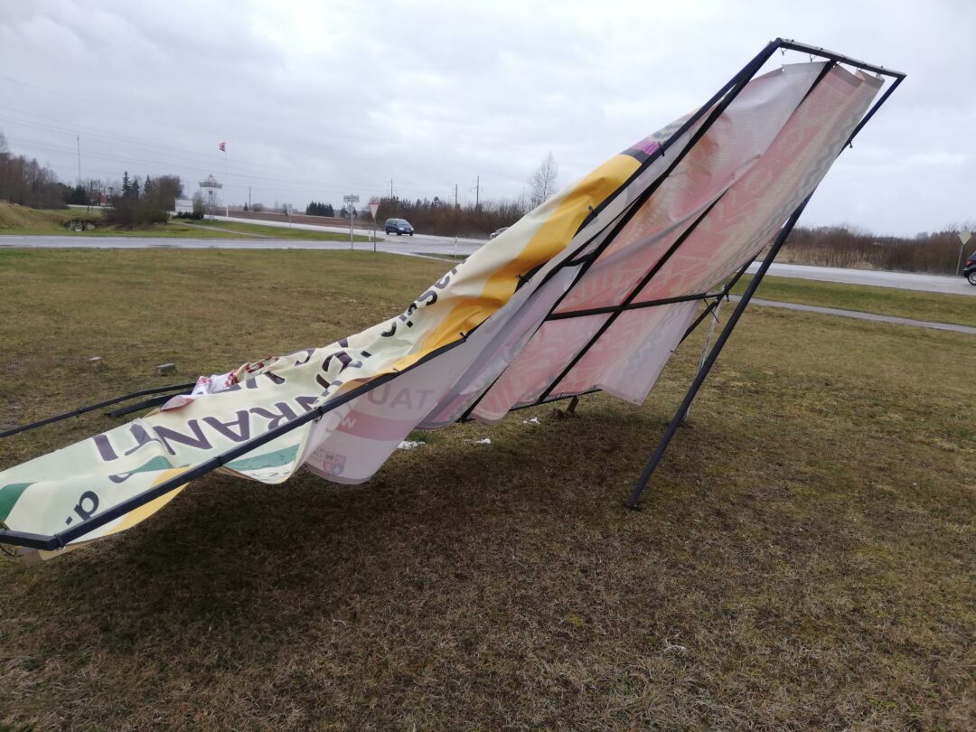 Siautulingo vėjo neatlaikė ir reklama prie miesto įvažiavimo. Tentą laikanti konstrukcija sulūžo.