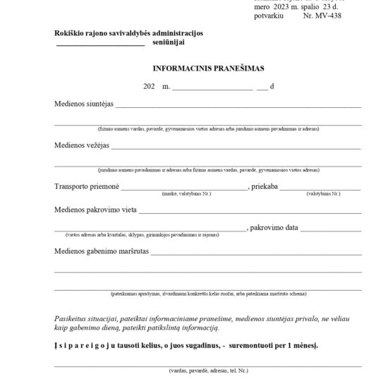 Rokiškio rajono savivaldybės mero potvarkiu „Dėl apvalios medienos gabenimo ir eismo ribojimo“, nustatoma, kad nuo 2025 m. lapkričio 19 d., gabenant apvaliąją medieną Rokiškio rajono savivaldybės teritorijoje esančiais vietinės reikšmės keliais, siekiant apsaugoti juos nuo sugadinimo, medienos siuntėjas privalo pateikti Rokiškio rajono savivaldybės administracijos seniūnijoms užpildytą formą (pridedama).