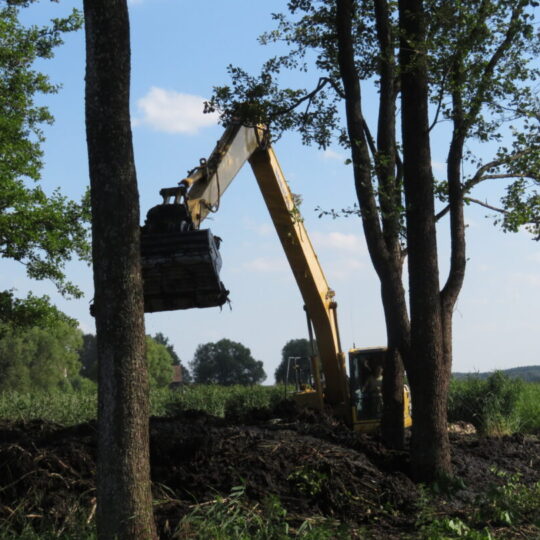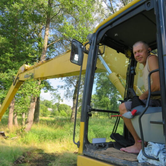 „Čia liūnas su dviem dugnais. Viršuje nendrės atitrūkusios nuo pagrindinio dugno plūduriuoja, o apačioje – jau tikrasis gruntas“, – padėtį aiškino ekskavatorininkas  Vytautas Šaltenis. Galingas ekskavatorius, kurio strėlė siekia 15 metrų, juda klodamas sau taką iš stambių rąstų. Tik taip jis gali pasiekti ežerą. Iškuopęs dumblą, vėl grįžta į krantą perdėliodamas rąstus kitam važiavimui.