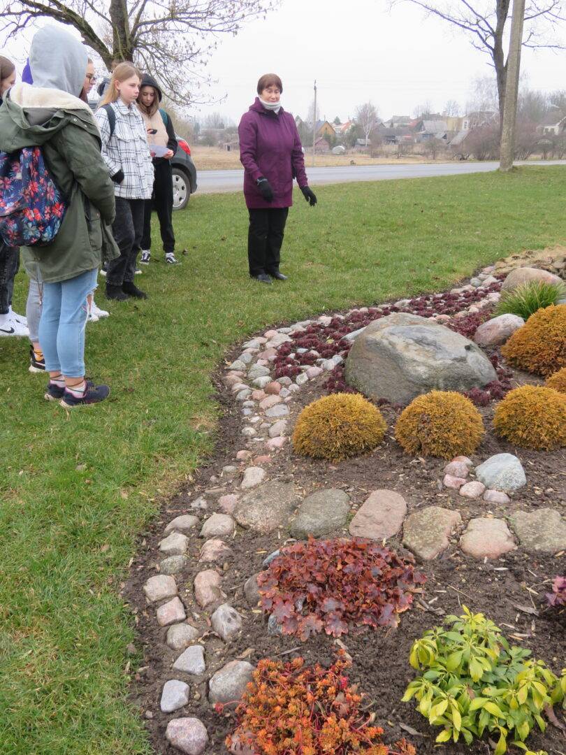 Jau keletą metų stebina nuolat besikeičiantis Pandėlio parkas. Jame apsilankę mokiniai susitiko su augalų mylėtoja ir prižiūrėtoja Ramute Pipikiene. Ji neatlygintinai daug metų darbuojasi miesto parke gražindama aplinką, akį traukia jos ir kolegės sukomponuoti alpinariumai. R. Pipikienė papasakojo apie prižiūrimus augalus, pamokė, kaip juos komponuoti. Mokinius domino, ar šis pomėgis susijęs su jos profesija, kiek laiko užtrunka įkurti alpinariumą, kas parenka augalus, kaip prižiūrėti levandas ir šalčio nebijančius kaktusus.