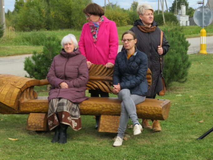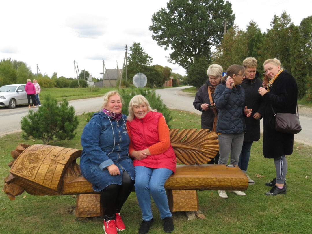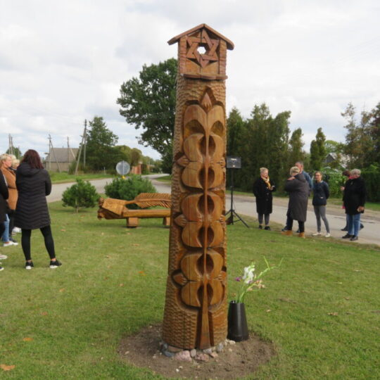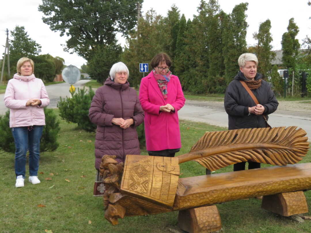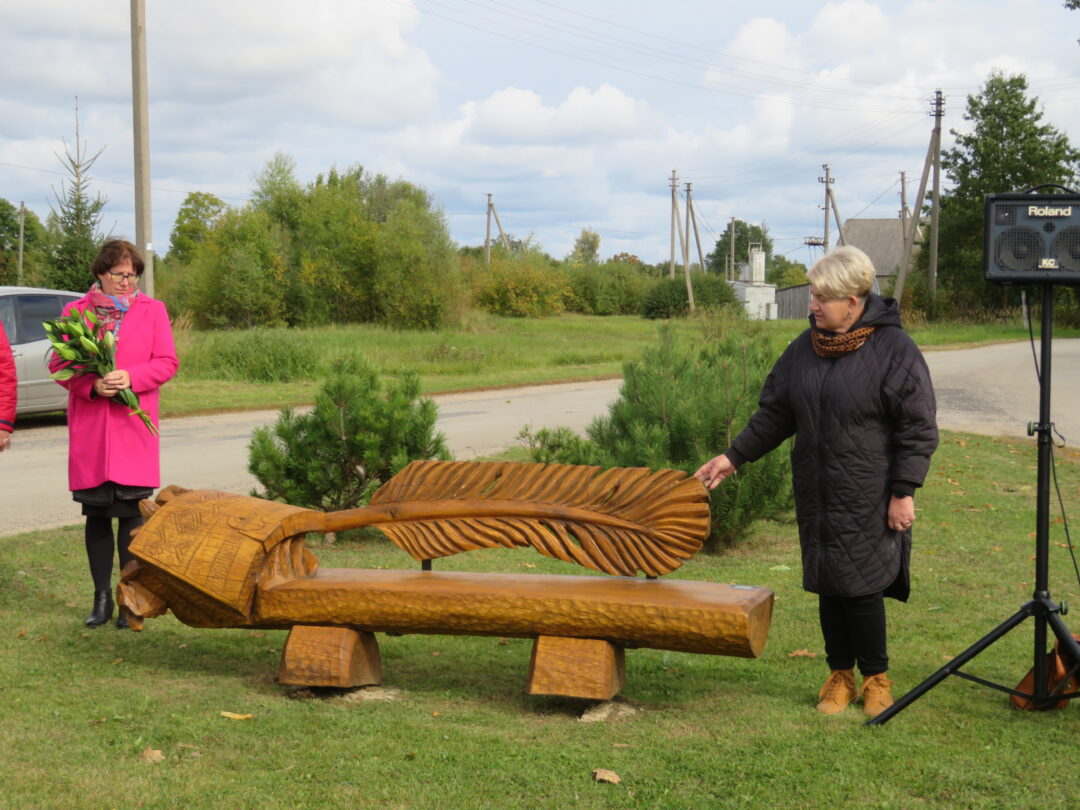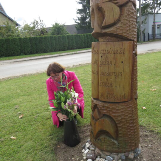 Gyvenvietės centrą jau nuo vasaros puošia du šiai poetei skirti medžio drožiniai – koplytstulpis ir suolelis, sukurti medžio skulptorių Vidmanto Zakarkos (Panemunėlis) bei Edvardo Tito (Panevėžio r.).