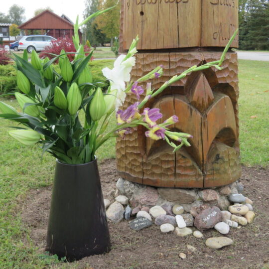 Prie koplytstulpio padėta M. Olkinaitės mylimų baltų lelijų ir akmenėlis su jos vardu.
