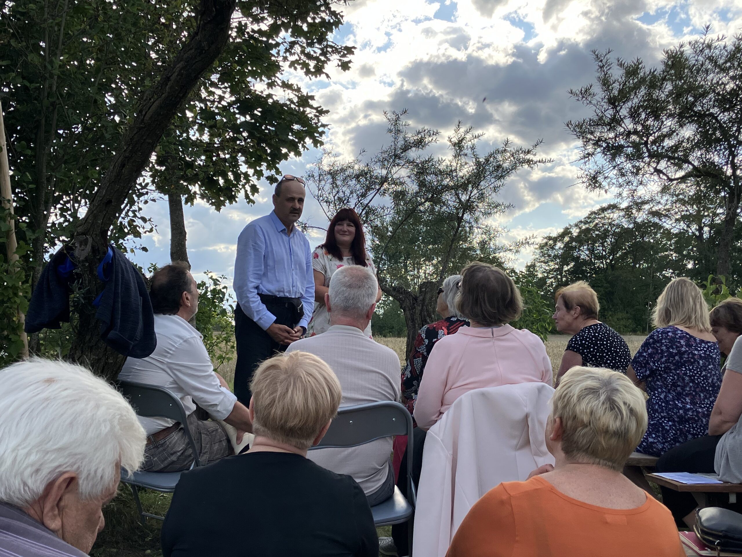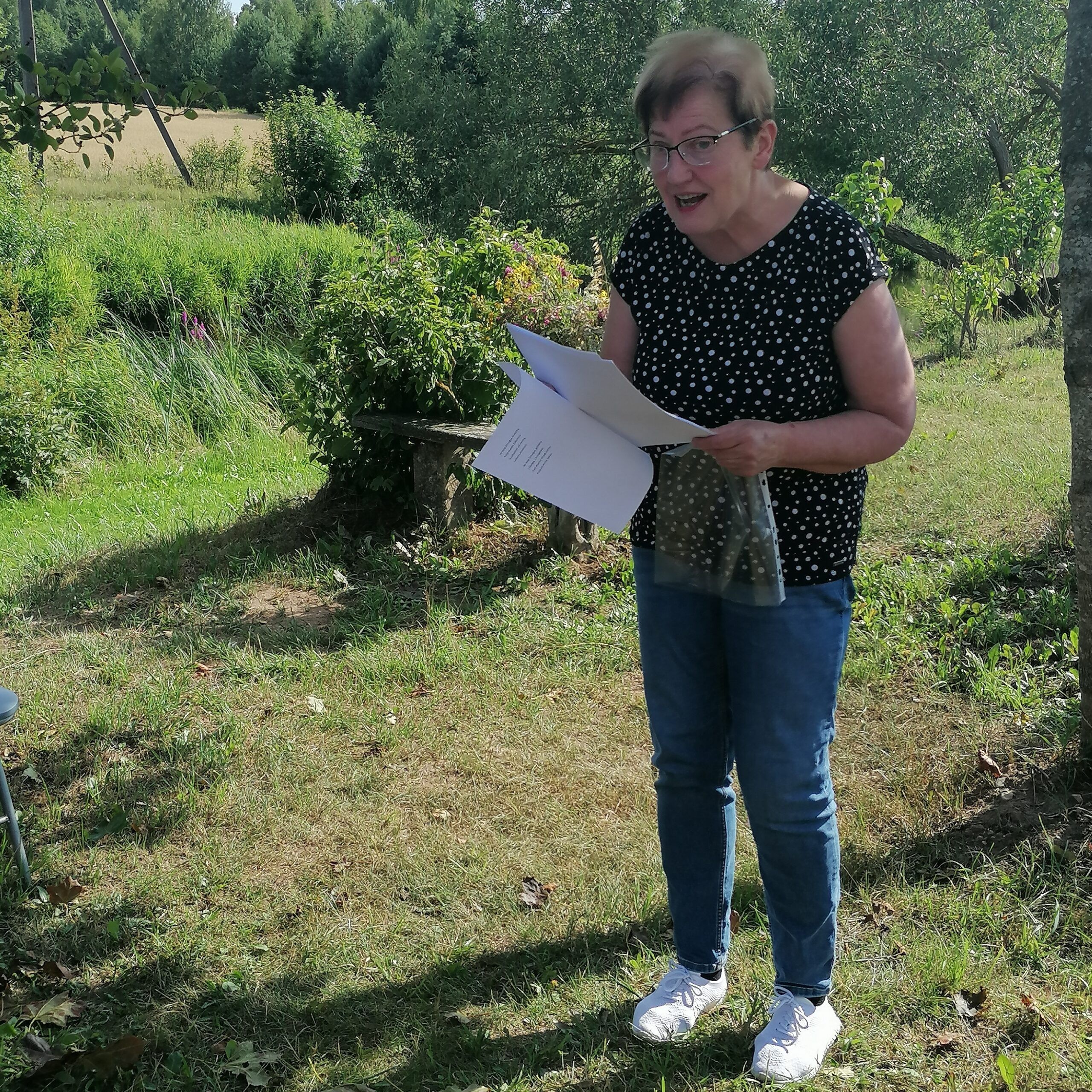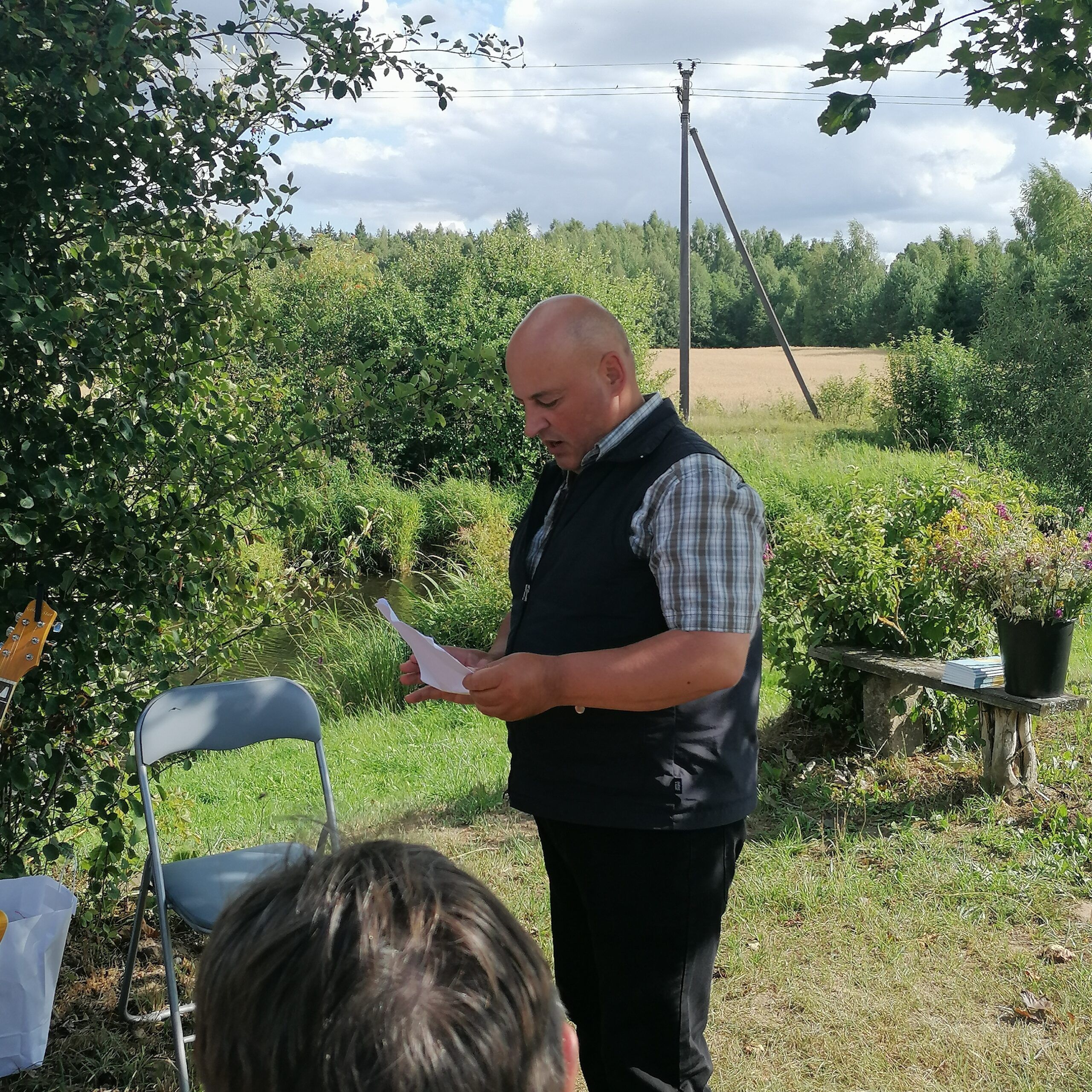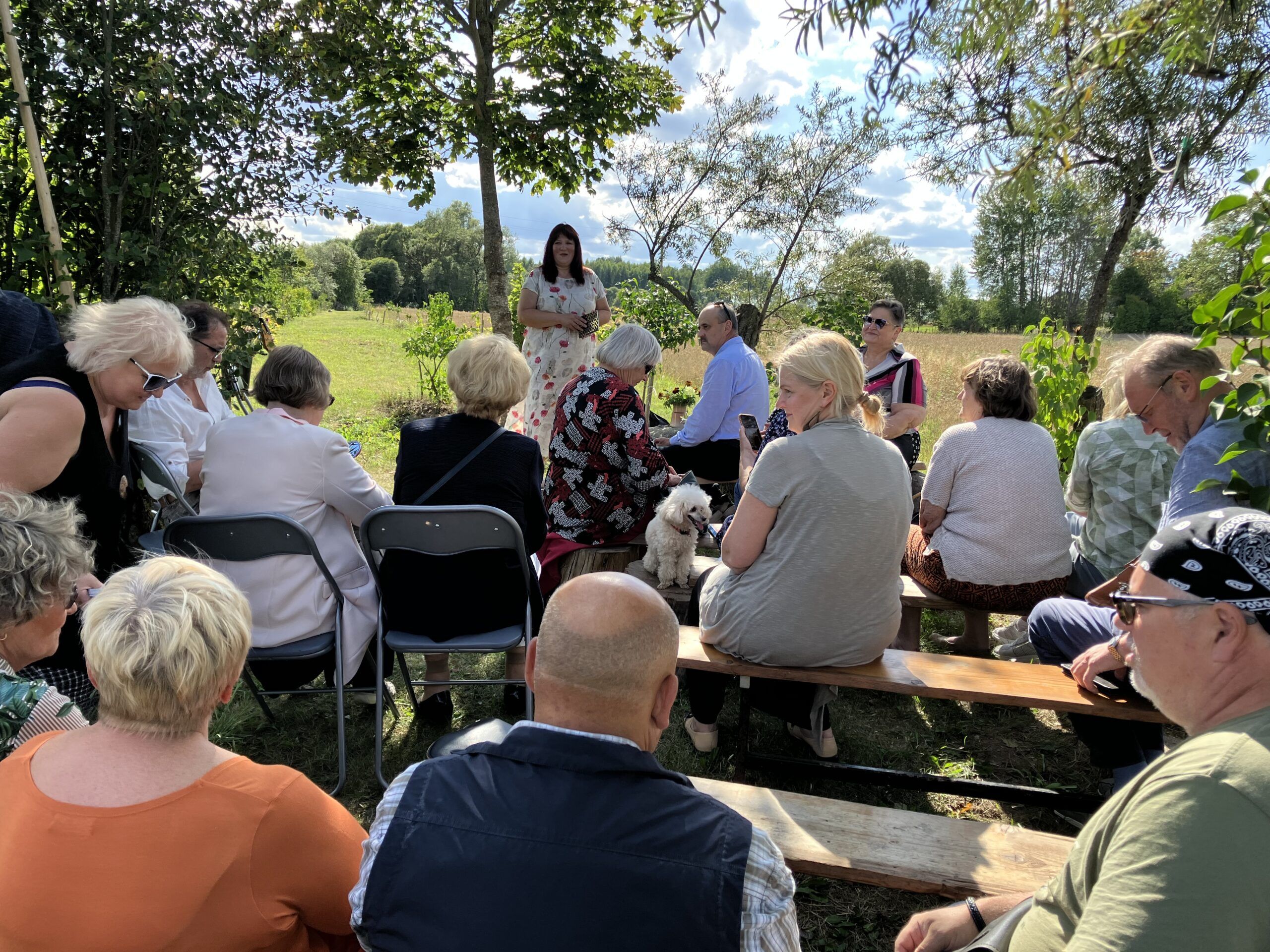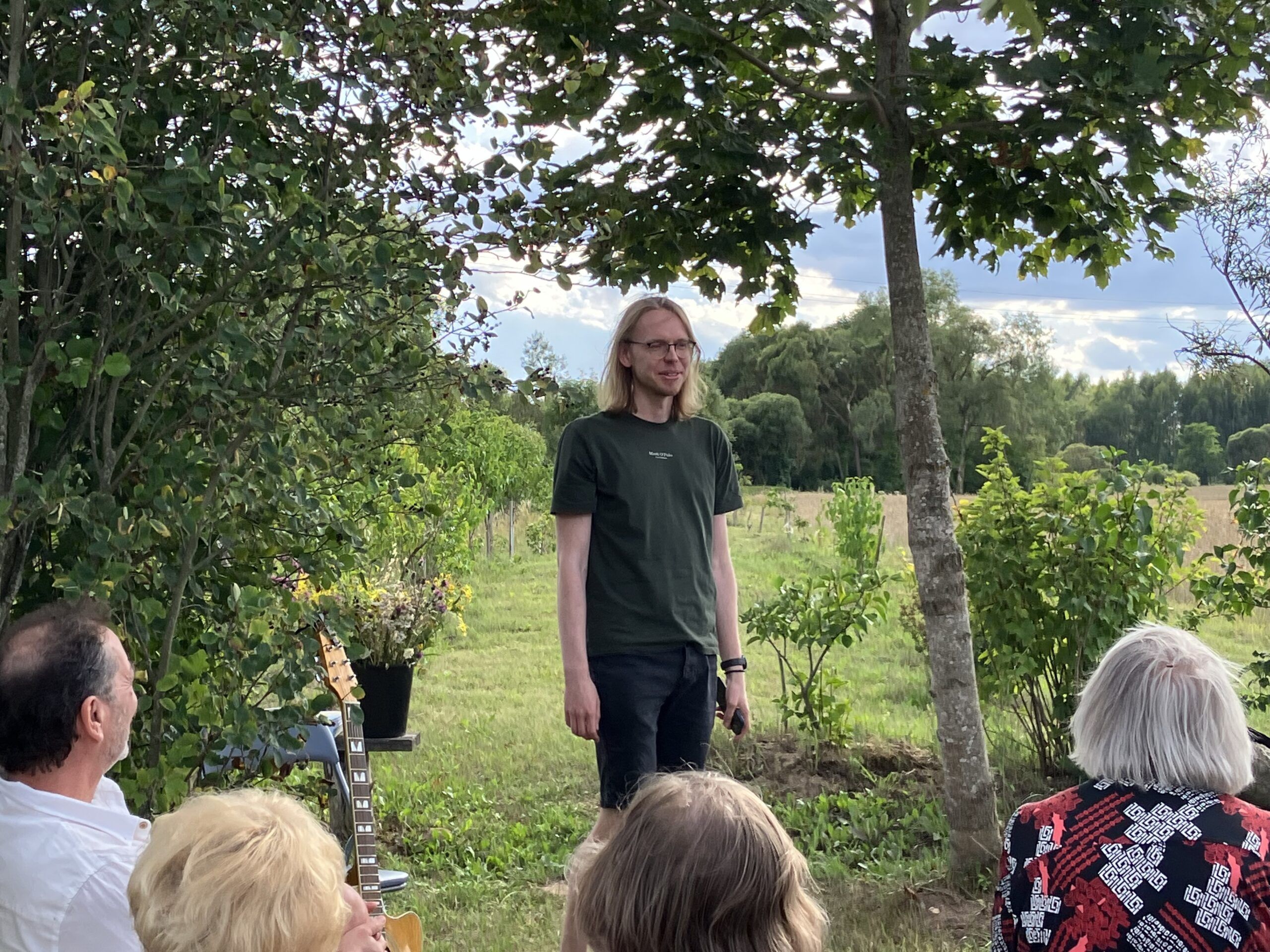 Poetams artimą aplinką, nukeliančią į svajų pasaulį, sukūrė jauki žaluma prie upės, akmenys, papuošti lauko gėlių ir senovinių darželių puokštėmis. Poezijos horizontus iliustravo suolai, permesti per kelmus, svyrantys medžiai, alyvų alėja… Na, o po poezijos posmų vynininkas Raimundas Nagelė surengė savo vynų degustaciją. Netrūko ir kitokių vaišių, subūrusių eiliuotojus tą liepos šeštadienį. Žinoma, visam tam šurmuliui pritarė ir kvietime į renginį paminėti žiogai smuikininkai.