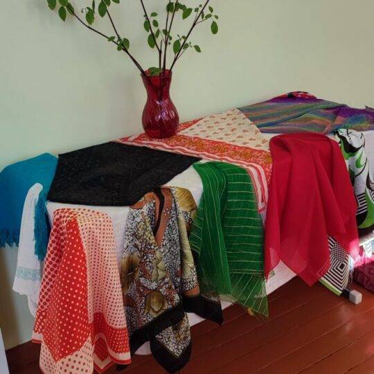 Šiandien skarelė tarnauja kaip aksesuaras, o parodoje jų spalvų, atspalvių, raštų vingrybių gausa leidžia prisiminti mamas, močiutes ir sugrįžti į vaikystę.