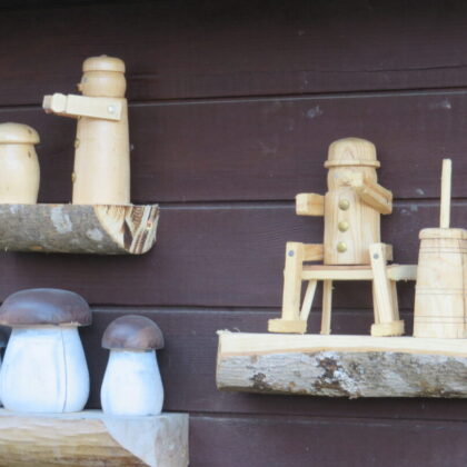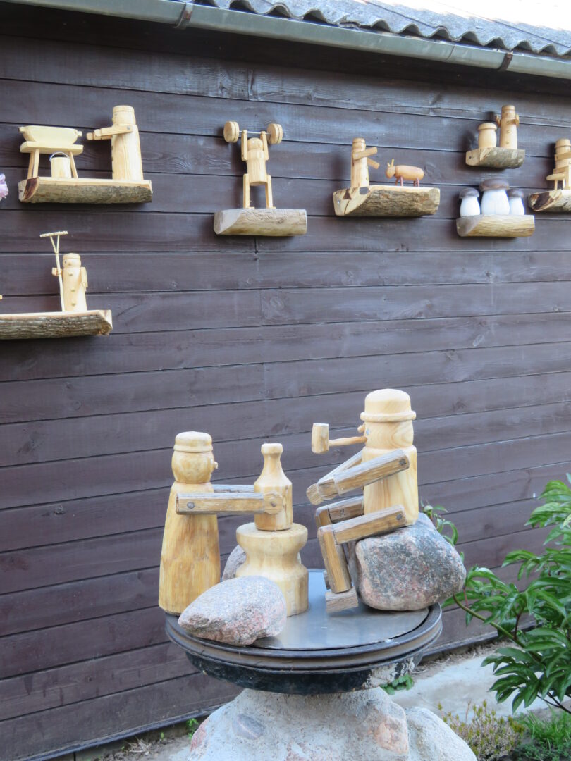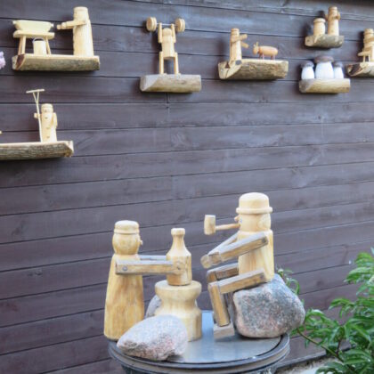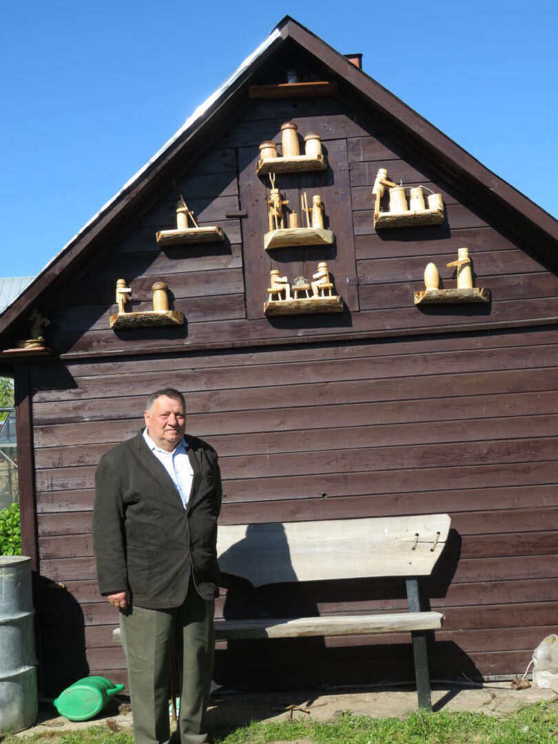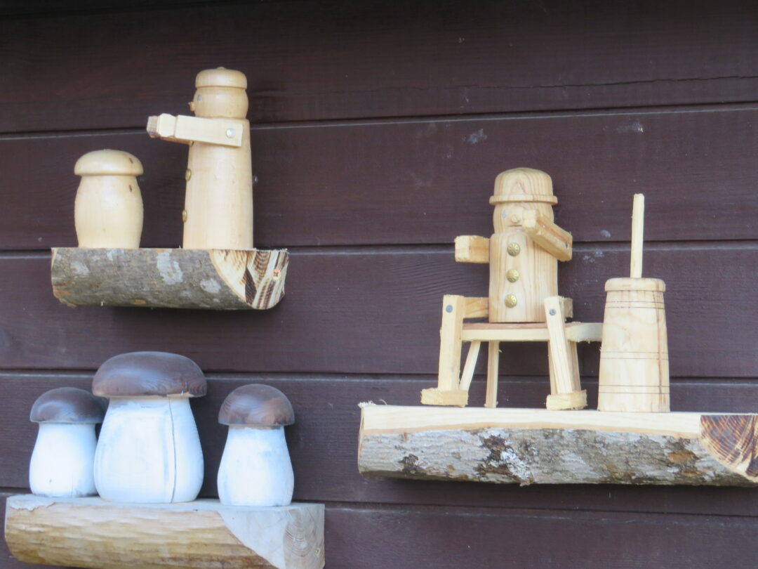 Rokiškėno Juozo Rimanto Kairio kieme stovinti pirtis ir garažas su malkine apkabinėti lentynėlėmis, pagamintomis iš nudailintų pliauskų. Matydamas, kas ant jų, negali nesišypsoti. Ant kiekvienos išdėlioti paties šeimininko išdrožti, ištekinti medinukai. Po vieną, po du ar keletą. Visi jie vaizduoja tam tikras istorijas. Žodžio kišenėje neieškantis J. R. Kairys pristatinėja: „Čia grybautojas surado baravyką, čia gimtojo kaimo svirtis, kaimiški darbai, meškeriojantis kaimynas, patranka iš pasakos, kurioje kariavo žirniai su grybais.“