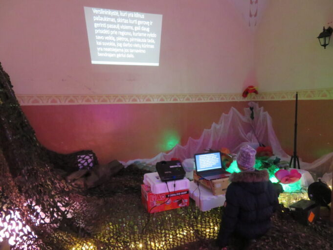 Kamajų bažnyčios prakartėlės centre – tvarką ir harmoniją atspindinti tradicinė medinė prakartėlė, kurią iš savo ekspozicijos paskolino Rokiškio krašto muziejus. Aplinkui ją rikiuojasi šimtai tuščių stiklainių, šovinių gilzių, šviesą sugeria kariuomenės maskuojamasis tinklas, čia pat raudoniu tviska masyvios, dirbtinės, chaotiškai sumestos rožės, pakuotės, plastiko likučiai…
