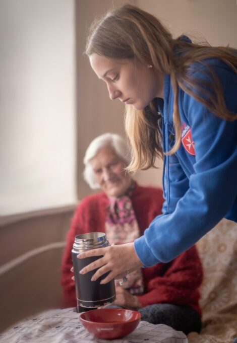 Maltiečiai skurdžiai gyvenančiais senoliais rūpinasi visus metus, su sriuba, su pagalba lanko juos kelis kartus per savaitę ir žiemą, ir vasarą, o metų pabaigoje skelbdami akciją „Maltiečių sriuba“ siekia priminti visuomenei apie senų žmonių skurdą – ir fizinį, ir emocinį.