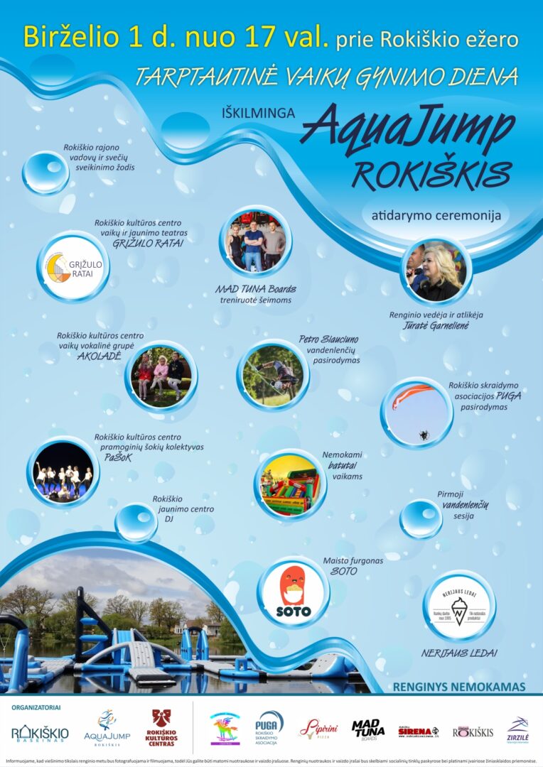 Vandens pramogų parko atidarymo šventė vyks birželio 1-ąją 17 val. Tądien minima Tarptautinė vaikų gynimo diena, tad miestiečių laukia daugybė pramogų: pradedant įvairiais šokių kolektyvais, vaikų ir jaunimo teatrais, Rokiškio jaunimo centro DJ pasirodymu, baigiant nemokamais batutais vaikams, pirmąja WAKE-INN Rokiškio vandeslydžio sesija ir skraidymo asociacijos „Puga“ pasirodymu. Renginys nemokamas.