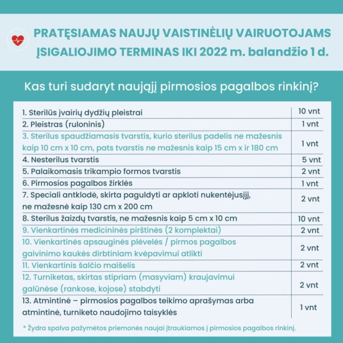 SAM atkreipia dėmesį, kad vairuotojai, turintys pirmosios pagalbos rinkinius, atnaujintus po 2019 m. sausio 1 d., turi tik pasipildyti savo vaistinėlių rinkinį 2 turniketais. Jei vaistinėlės rinkinys pirktas anksčiau minėtosios datos, vairuotojas privalo įsigyti naują rinkinį. Atmintinę kaip naudotis turniketais galite rasti ČIA.