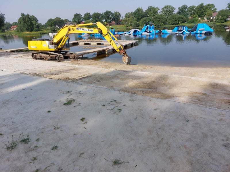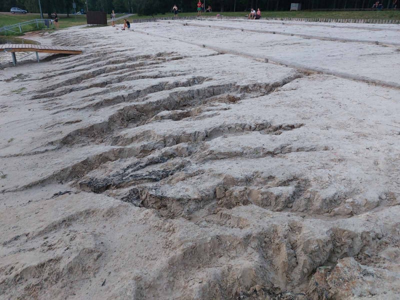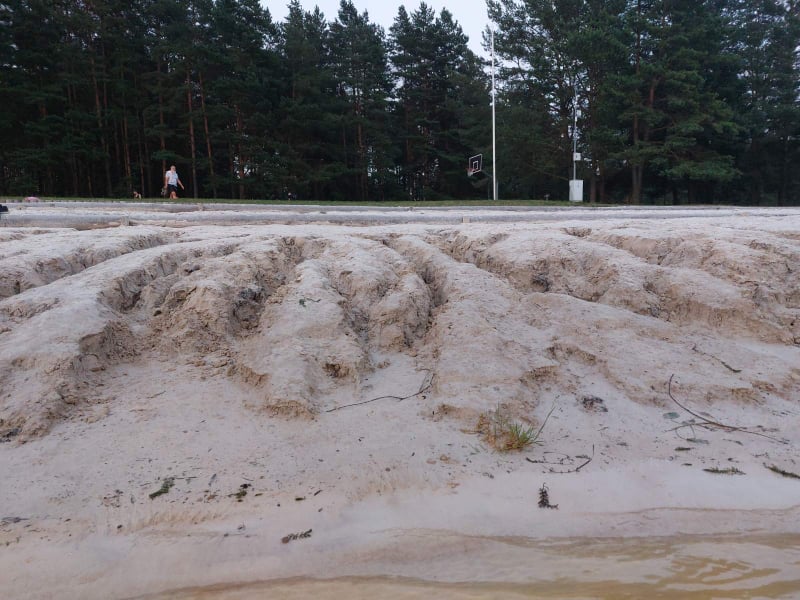 Trečiadienį užklupęs smarkus lietus praplovė kvarcinį smėlį, supiltą pliaže prie Rokiškio ežero. Šalimais „AquaJump Rokiškis“ batutų parko buvo matyti gilios duobės, tačiau ne ilgam – jau penktadienio rytą suvažiavusi technika tvarkė padarytą žalą.
