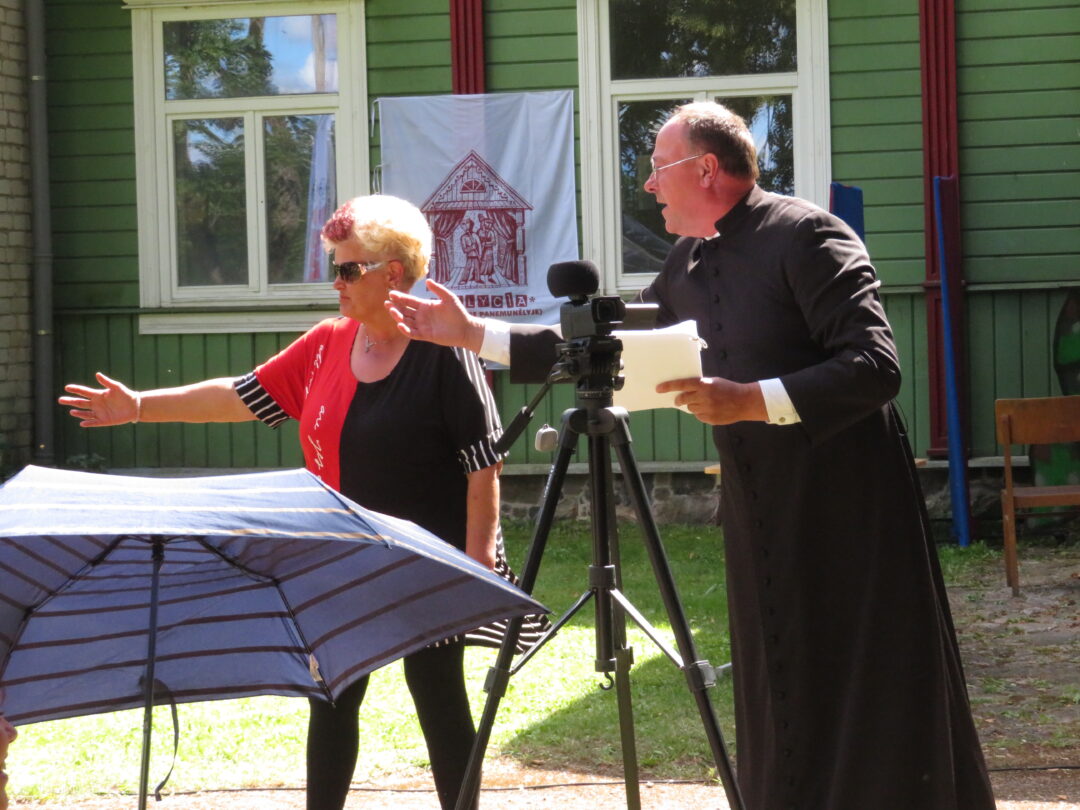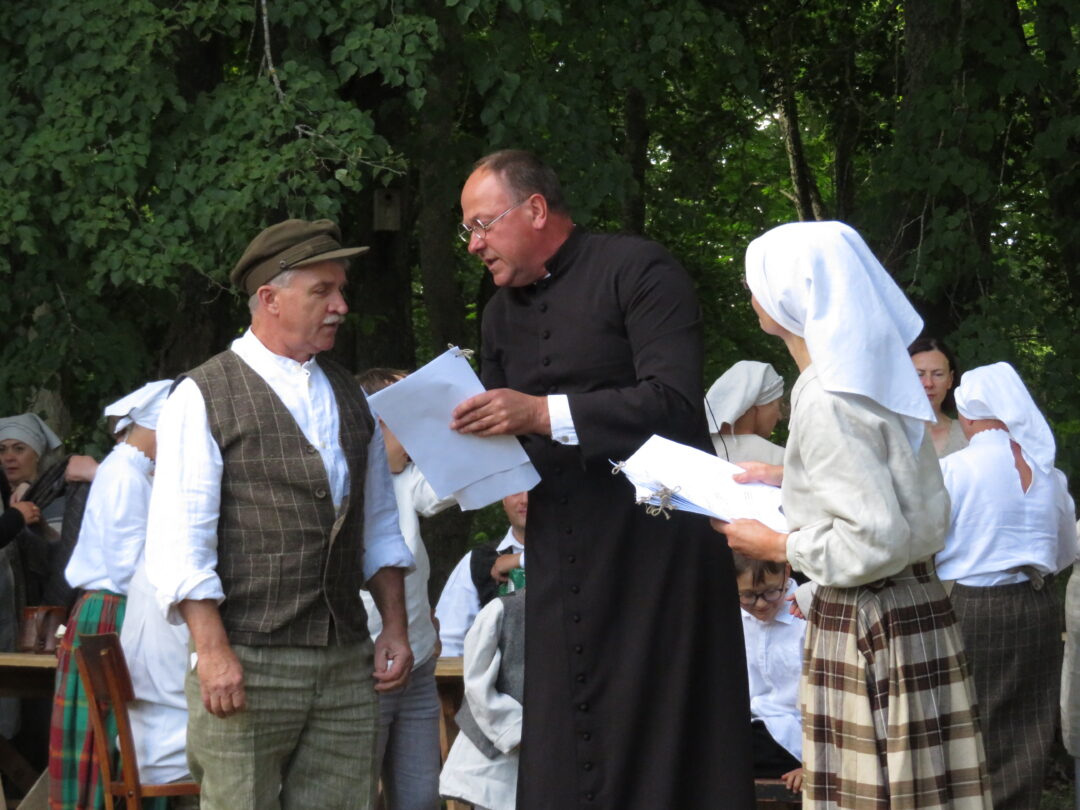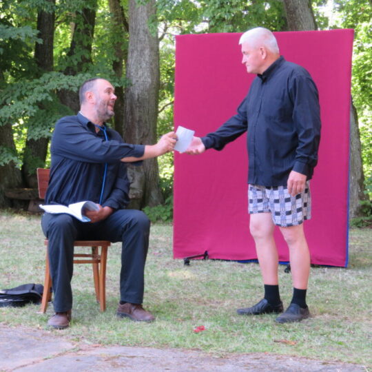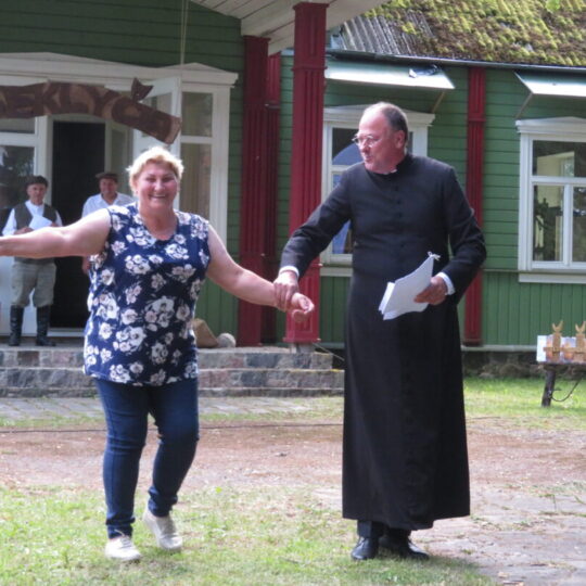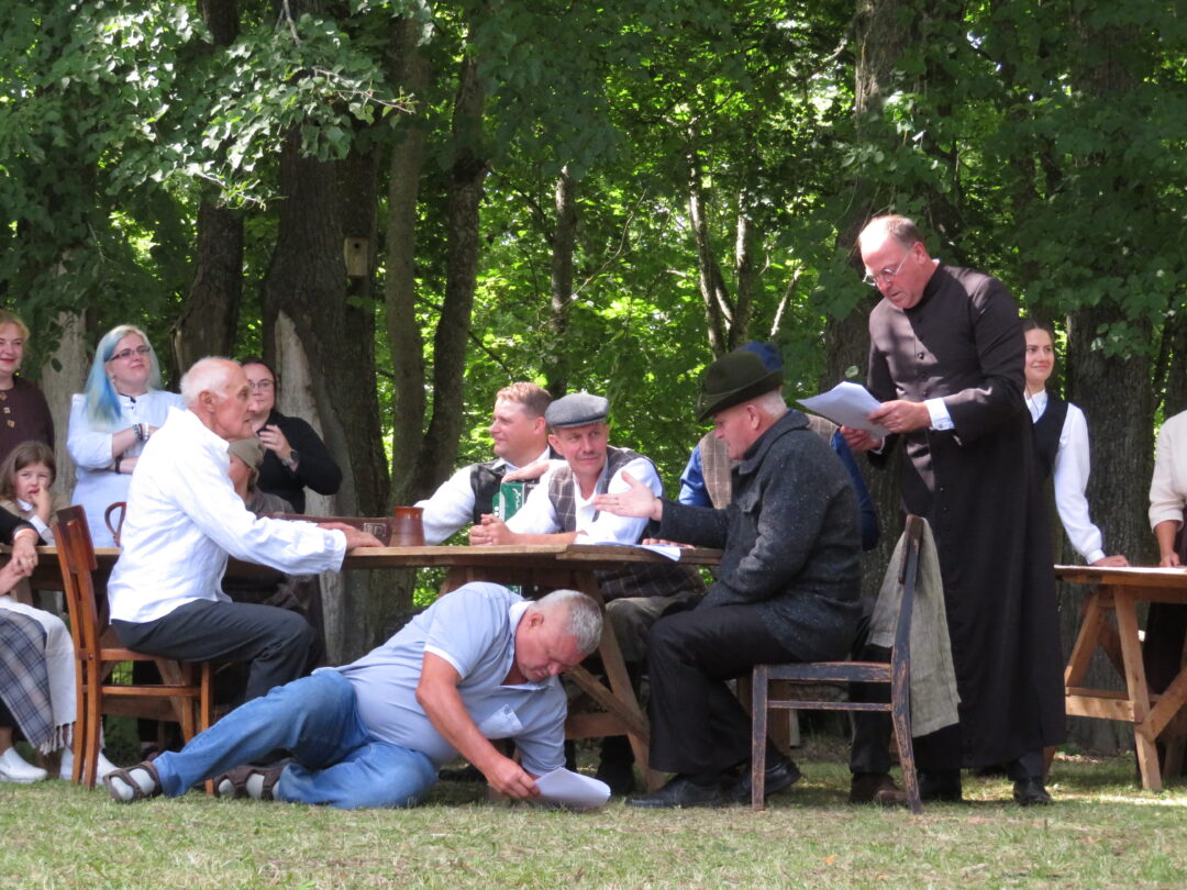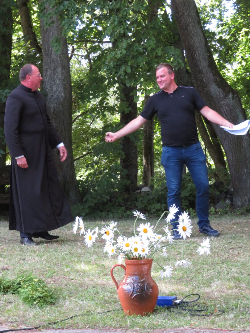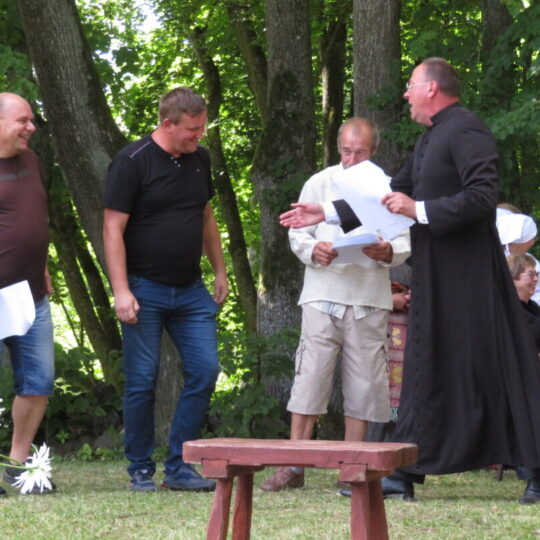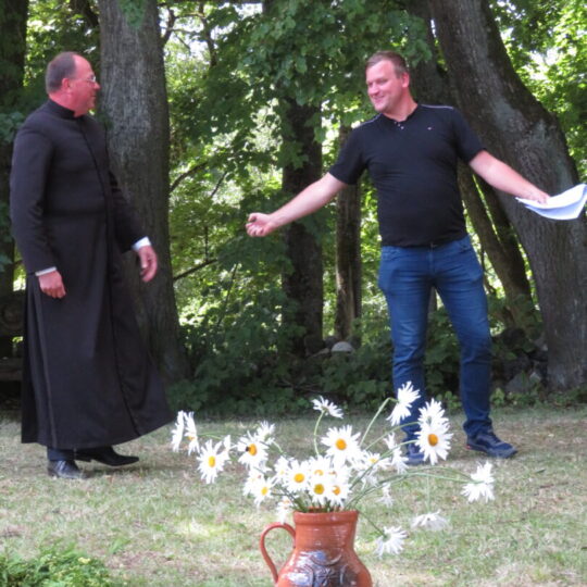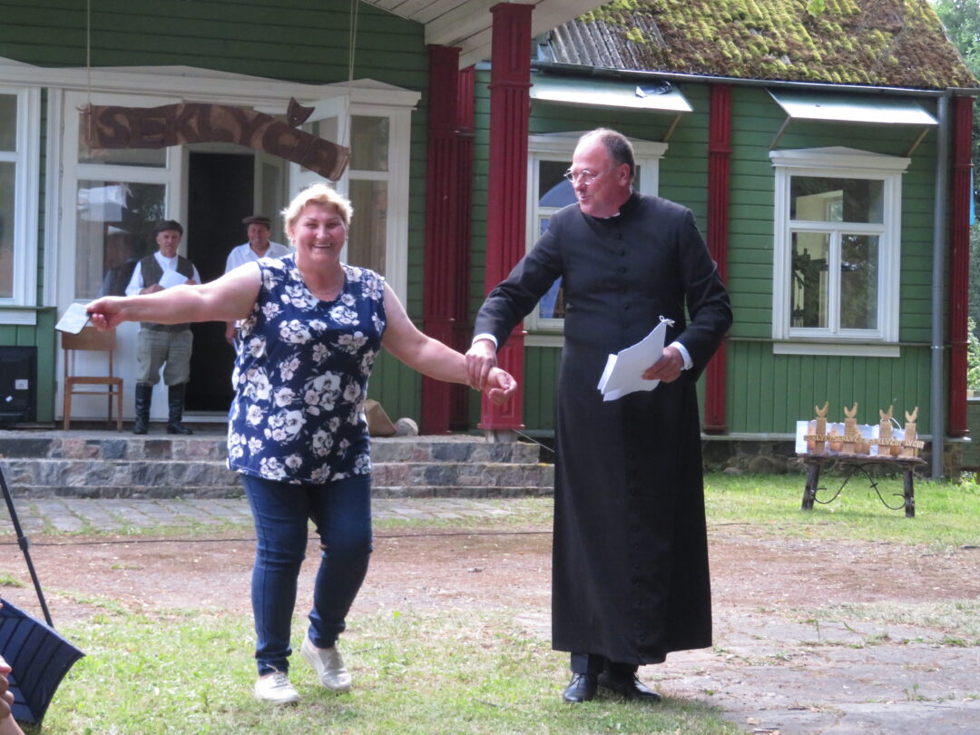 Atsitiktinis praeivis, šeštadienį užsukęs prie Panemunėlio miestelio bažnyčios, būtų sutrikęs – kokie nematyti du kunigai lūkuriuoja tarp senų liepų? Tik akylesnis būtų įžvelgęs stulbinantį vieno sutaną vilkinčio žmogaus panašumą į gerai žinomą panemunėlietį muzikantą Giedrių Viduolį. Nieko nuostabaus, nes šeštadienį Panemunėlyje, prie senosios klebonijos, prasidėjo XVIII Rokiškio rajono kaimo mėgėjų teatrų festivalis „Seklyčia“, o teatralizuotoje kompozicijoje „Lietuviško teatro lopšys“ G. Viduoliui teko vaidinti kunigą, rašytoją J. Tumą-Vaižgantą, kuris Panemunėlyje kažkada iš tikrųjų vedė vieną teatro repeticiją. Buvo daug improvizacijos ir skanaus juoko, kadangi G. Viduolis kai kuriuos aktorius pasirinko iš žiūrovų.