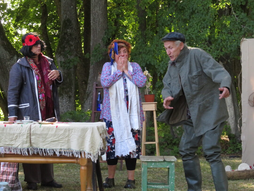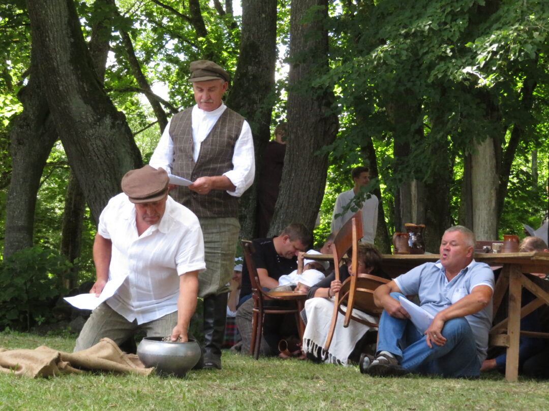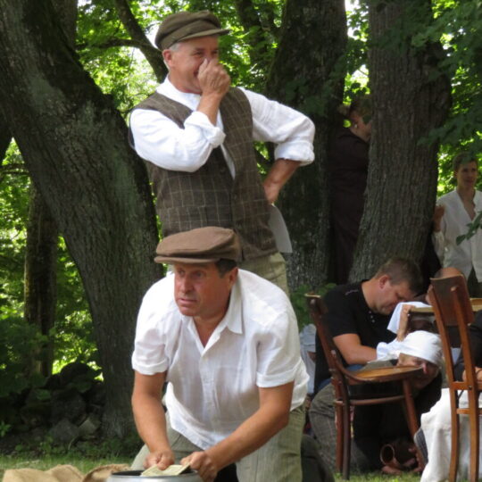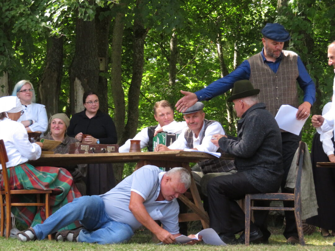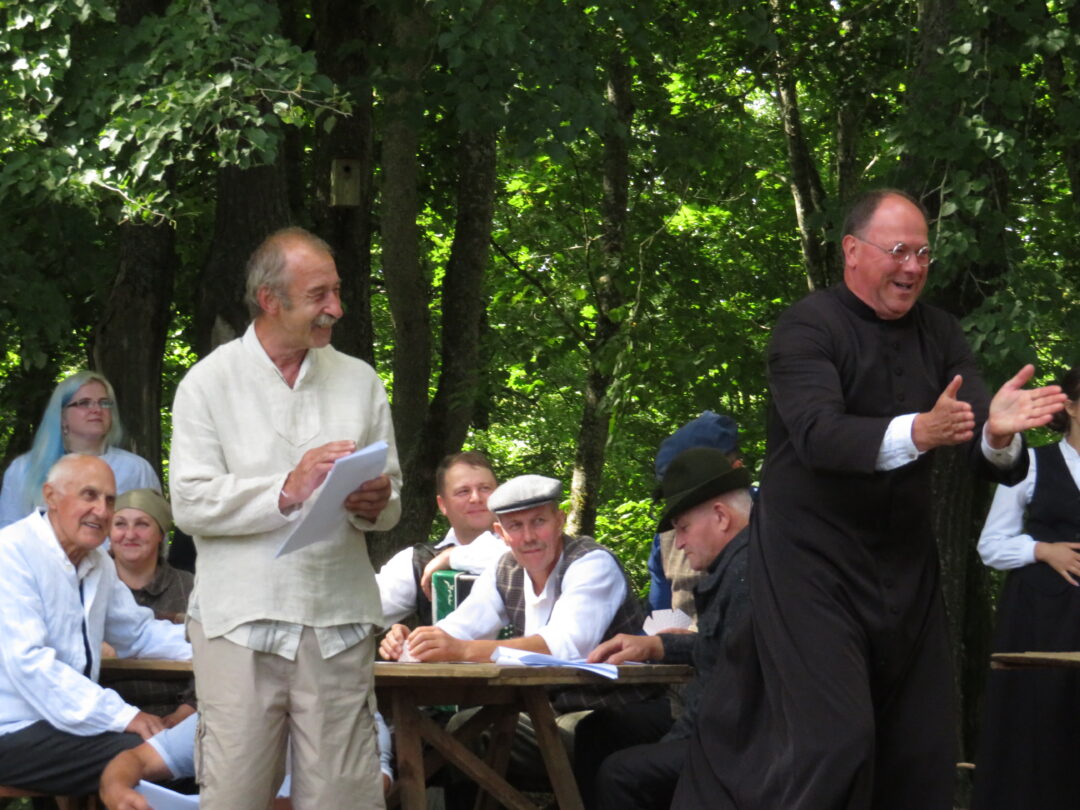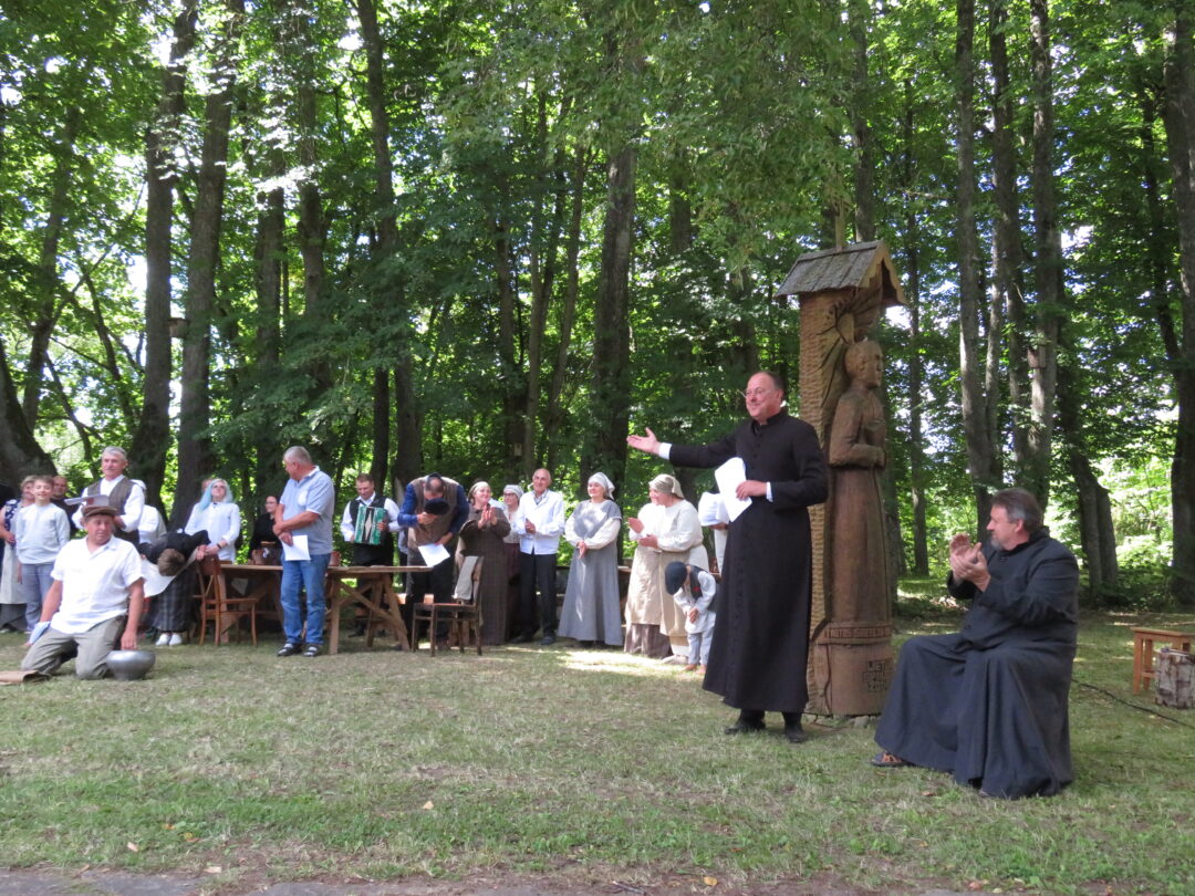 Atsitiktinis praeivis, šeštadienį užsukęs prie Panemunėlio miestelio bažnyčios, būtų sutrikęs – kokie nematyti du kunigai lūkuriuoja tarp senų liepų? Tik akylesnis būtų įžvelgęs stulbinantį vieno sutaną vilkinčio žmogaus panašumą į gerai žinomą panemunėlietį muzikantą Giedrių Viduolį. Nieko nuostabaus, nes šeštadienį Panemunėlyje, prie senosios klebonijos, prasidėjo XVIII Rokiškio rajono kaimo mėgėjų teatrų festivalis „Seklyčia“, o teatralizuotoje kompozicijoje „Lietuviško teatro lopšys“ G. Viduoliui teko vaidinti kunigą, rašytoją J. Tumą-Vaižgantą, kuris Panemunėlyje kažkada iš tikrųjų vedė vieną teatro repeticiją. Buvo daug improvizacijos ir skanaus juoko, kadangi G. Viduolis kai kuriuos aktorius pasirinko iš žiūrovų.