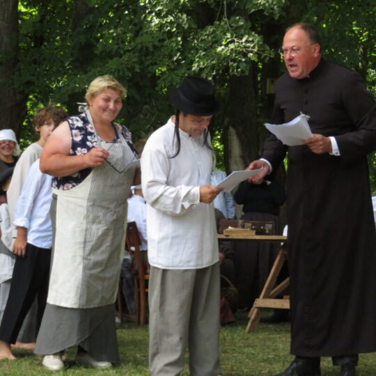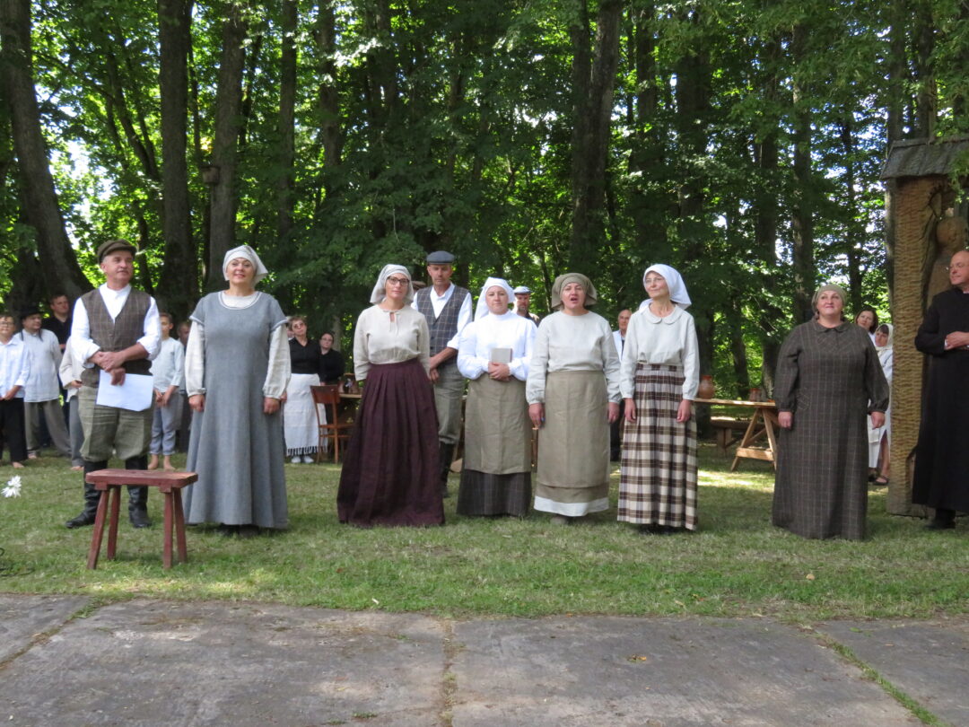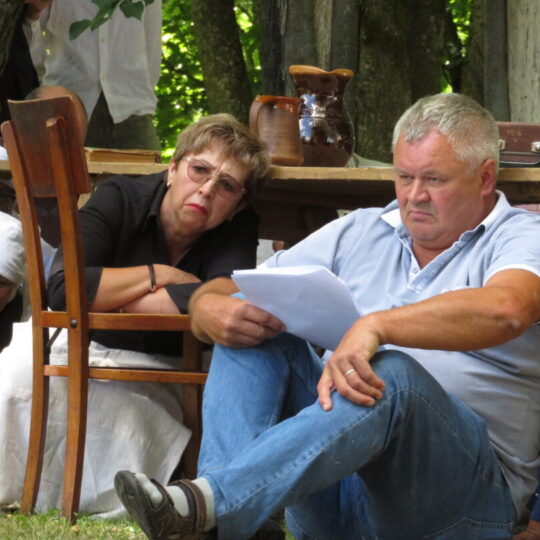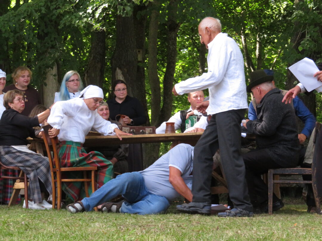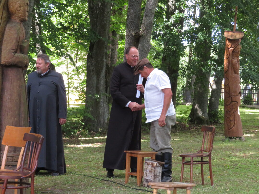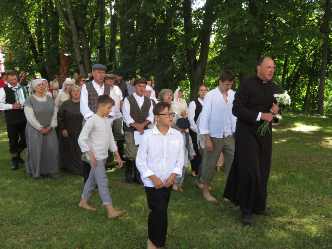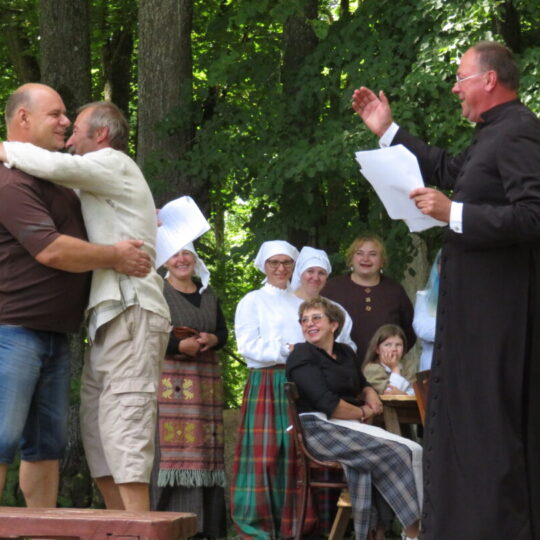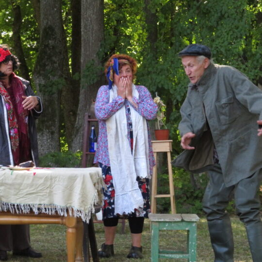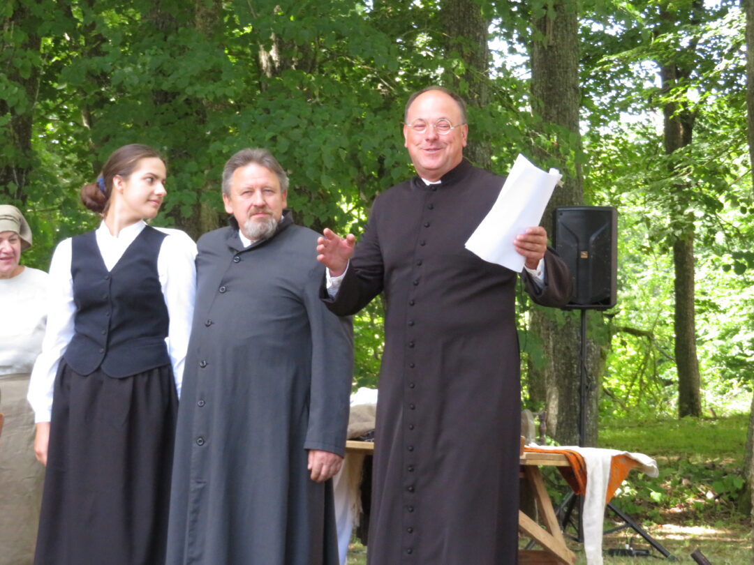 Atsitiktinis praeivis, šeštadienį užsukęs prie Panemunėlio miestelio bažnyčios, būtų sutrikęs – kokie nematyti du kunigai lūkuriuoja tarp senų liepų? Tik akylesnis būtų įžvelgęs stulbinantį vieno sutaną vilkinčio žmogaus panašumą į gerai žinomą panemunėlietį muzikantą Giedrių Viduolį. Nieko nuostabaus, nes šeštadienį Panemunėlyje, prie senosios klebonijos, prasidėjo XVIII Rokiškio rajono kaimo mėgėjų teatrų festivalis „Seklyčia“, o teatralizuotoje kompozicijoje „Lietuviško teatro lopšys“ G. Viduoliui teko vaidinti kunigą, rašytoją J. Tumą-Vaižgantą, kuris Panemunėlyje kažkada iš tikrųjų vedė vieną teatro repeticiją. Buvo daug improvizacijos ir skanaus juoko, kadangi G. Viduolis kai kuriuos aktorius pasirinko iš žiūrovų.