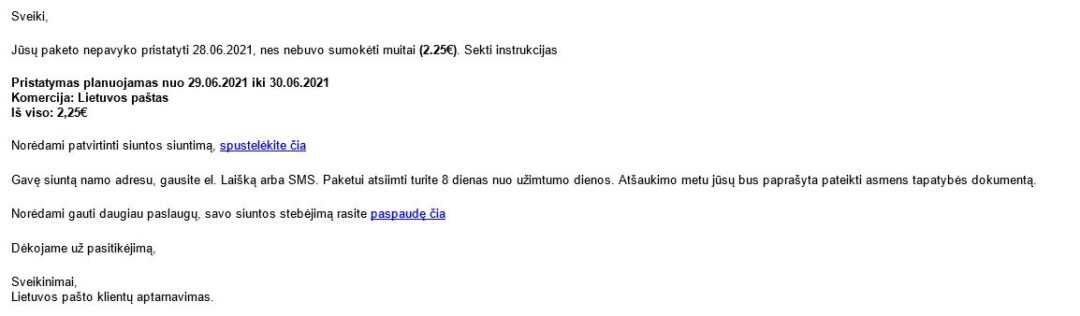Laiške yra kelios aktyvios nuorodos. Gavę tokį laišką, jokiais būdais nespauskite nuorodų, įspėja Lietuvos paštas. Taip pat patariama visada pasižiūrėti, iš kokio el. pašto siunčiamas laiškas – Lietuvos pašto siunčiami laiškai iš adreso, kuris baigiasi post.lt.