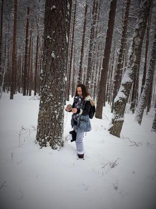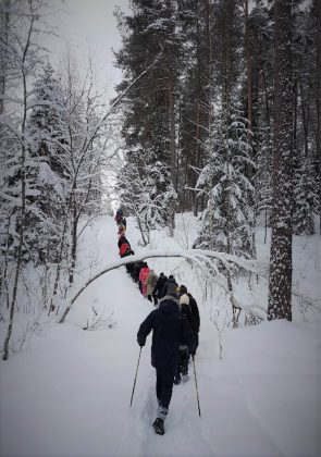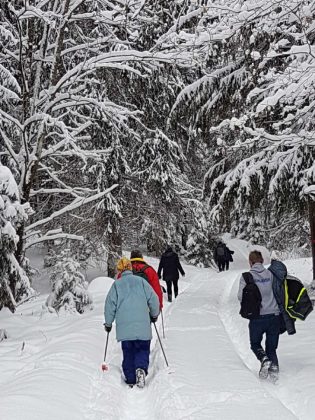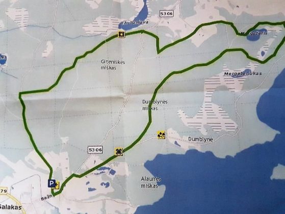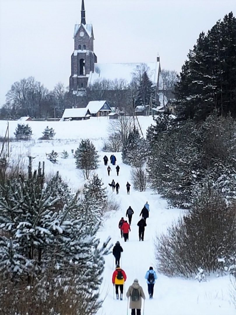 Kaip tyčia naktį prieš šeštadienio žygį gausiai snigo, todėl iš Rokiškio pasiekti Salaką vingiuotais ir kalnuotais keliais buvo tikras iššūkis. Galvojau, gal ir žygeivių bus vienas kitas, jeigu apskritai jų bus. Nieko panašaus – matyti, kad patogios sofutės sindromas iš tautos gyvenimo dingsta. Susirinko 40 žygeivių, tarp jų daug jaunimo, iš Zarasų, Visagino, Salako, Utenos ir mes, iš Rokiškio. O mūsų kompaniją papuošė miela vilkšunė su parištu tautiniu kaspinėliu – Berta. Tik išdykėlė niekaip nesileido nufotografuojama.