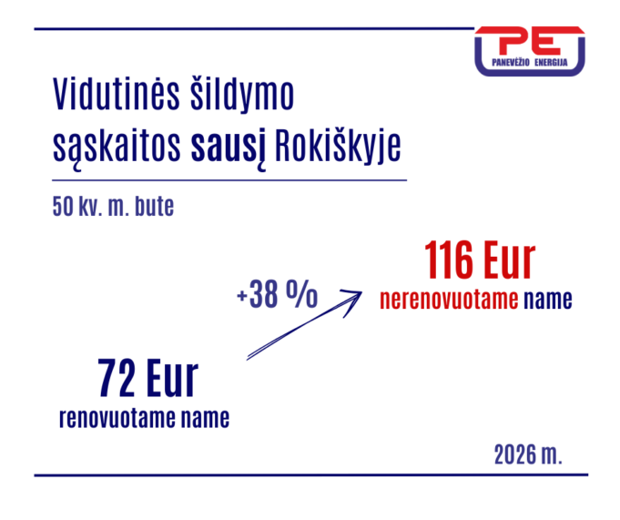 Rokiškio mieste renovuoti daugiabučiai šių metų sausį vidutiniškai suvartojo apie 39 proc. mažiau šilumos nei nerenovuoti, todėl šildymas renovuotų namų gyventojams kainavo mažiau. Naujuose ar renovuotuose daugiabučiuose 50 kv. m buto šildymo išlaidos vidutiniškai sudarė apie 72 Eur su 21 proc. PVM (1,43 Eur/m²). Už 2025 m. sausį buto šildymas vidutiniškai kainavo apie 37 Eur su 9 proc. PVM.