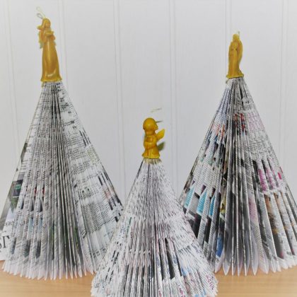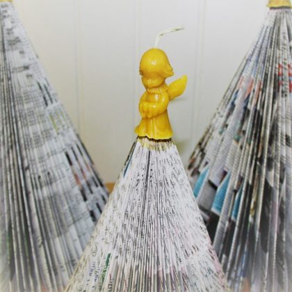 Kartu galėsite pamatyti kalėdines eglutes, kurias iš „Gimtojo…“ laikraščių mums sukūrė bitininkas Linas Jakubonis iš Tervydžių kaimo (Jūžintų sen.). Vienai eglutei pagaminti prireikė net 140 laikraščio puslapių. Eglutes L. Jakubonis papuošė paties nulietomis tikro bičių vaško žvakėmis – angelais.