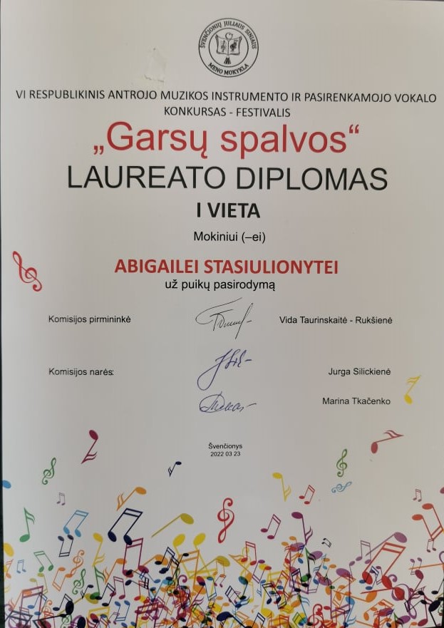 Konkurse pasirenkamojo vokalo kategorijoje pasirodė Rokiškio Rudolfo Lymano muzikos mokyklos mokytojos Redos Kazlauskienės mokinė Abigailė Stasiulionytė (koncertmeisterė Pasa Pletaitė-Junokienė). Abigailė tapo I vietos laureate.