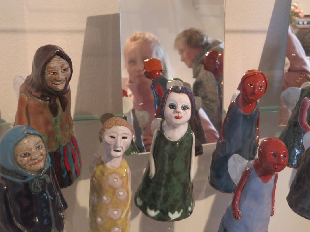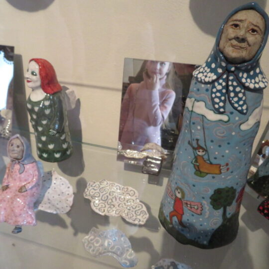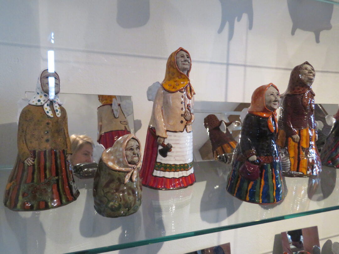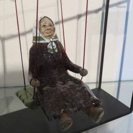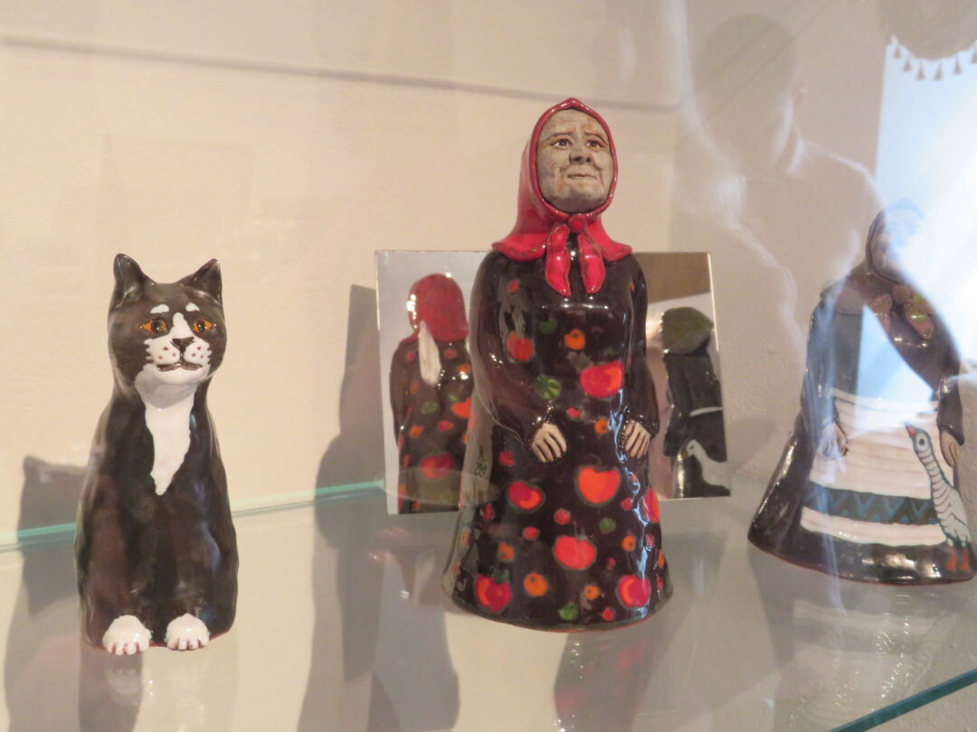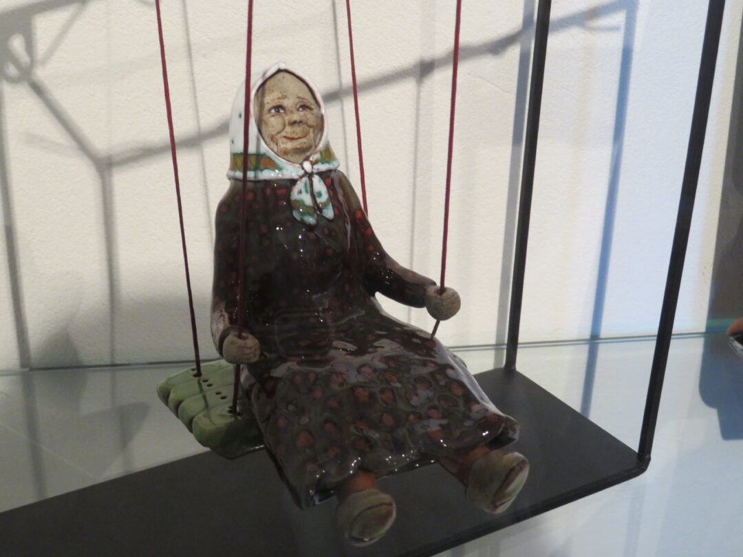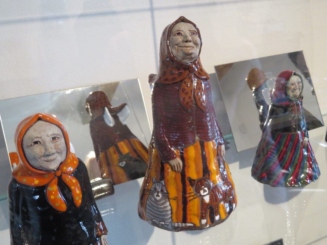 Stiklo vitrinose – beveik trys dešimtys spalvinga glazūra išpuoštų močiučių figūrėlių: besisupančių sūpuoklėse, mįslingai žvelgiančių į tolį, rankose laikančių rankinuką ir susiruošusių į bažnytėlę… Vienos iš jų rankose – kirvukas, o po pažastimi – vištelė. Kita, regis, seka lankytojų žvilgsnius ir gudriai šypsosi, tarsi kažką apie juos žinotų. „Tai paslapčių saugotoja, būrėja“, – įvardina autorė. Apie tai, kuo jos užsiima, galima spręsti iš išpieštų sijonų. Ant vienų sijonų žydi gėlės, kiti išmarginti naminių paukščių ar augintinių atvaizdais, tačiau visos močiutės sparnuotos tarsi angelai. Tose pačiose lentynose glaudžiasi ir spalvingi katinai. Juos taip pat nulipdė Eglė. Lankytojams ji palieka ranka surašytą savotišką atmintinę, pasakojančią apie tikruosius savo senelius ir keramines močiutes. Šiltus įspūdžius apie senolius ji atsinešė iš vaikystės.