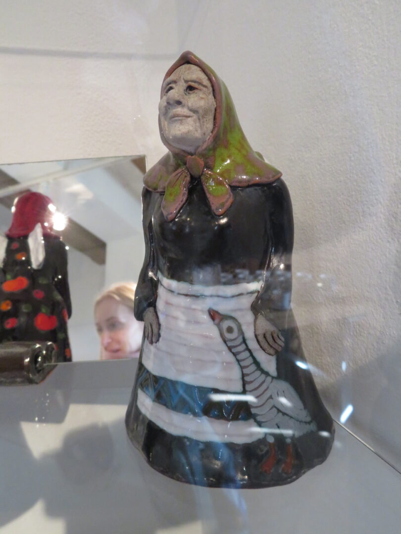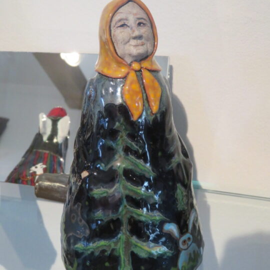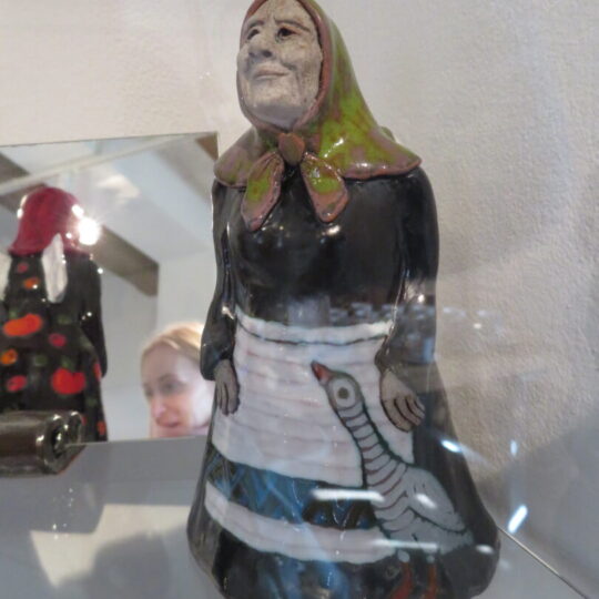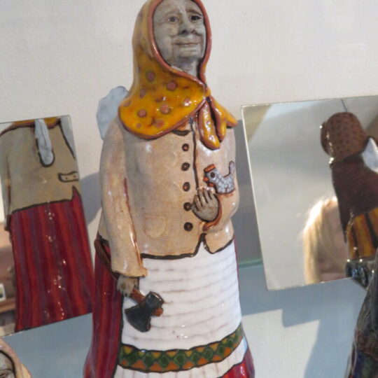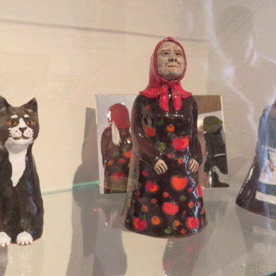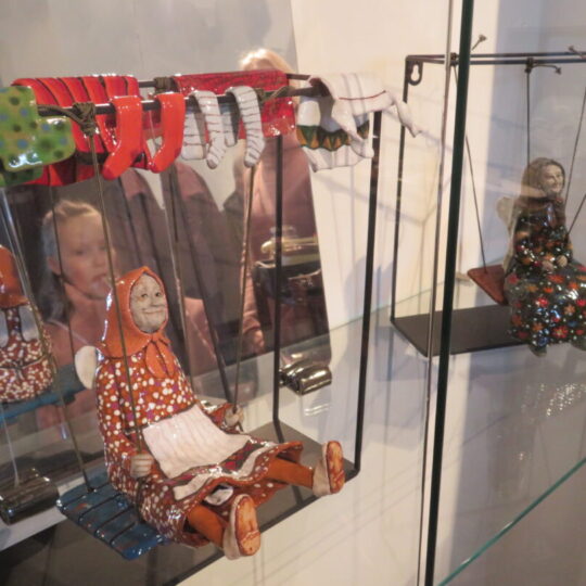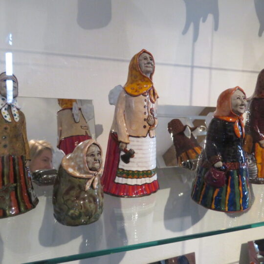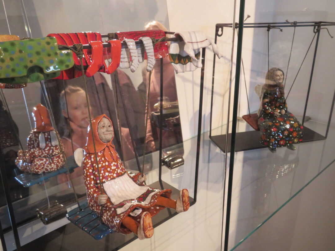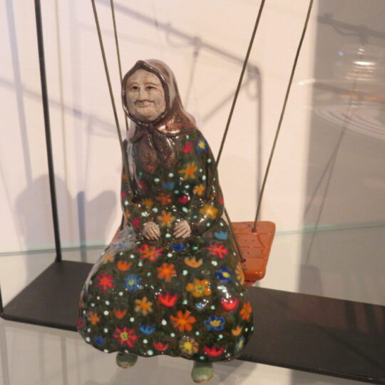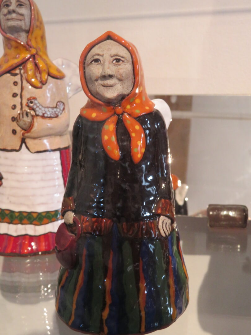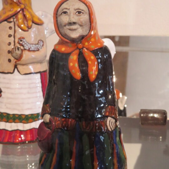 Stiklo vitrinose – beveik trys dešimtys spalvinga glazūra išpuoštų močiučių figūrėlių: besisupančių sūpuoklėse, mįslingai žvelgiančių į tolį, rankose laikančių rankinuką ir susiruošusių į bažnytėlę… Vienos iš jų rankose – kirvukas, o po pažastimi – vištelė. Kita, regis, seka lankytojų žvilgsnius ir gudriai šypsosi, tarsi kažką apie juos žinotų. „Tai paslapčių saugotoja, būrėja“, – įvardina autorė. Apie tai, kuo jos užsiima, galima spręsti iš išpieštų sijonų. Ant vienų sijonų žydi gėlės, kiti išmarginti naminių paukščių ar augintinių atvaizdais, tačiau visos močiutės sparnuotos tarsi angelai. Tose pačiose lentynose glaudžiasi ir spalvingi katinai. Juos taip pat nulipdė Eglė. Lankytojams ji palieka ranka surašytą savotišką atmintinę, pasakojančią apie tikruosius savo senelius ir keramines močiutes. Šiltus įspūdžius apie senolius ji atsinešė iš vaikystės.
