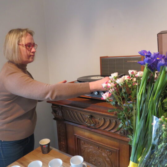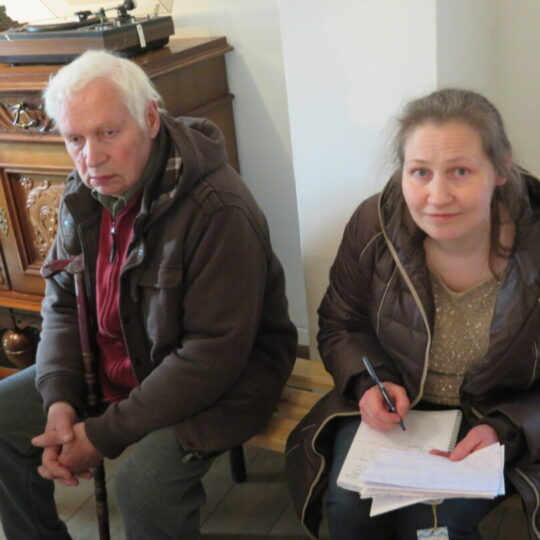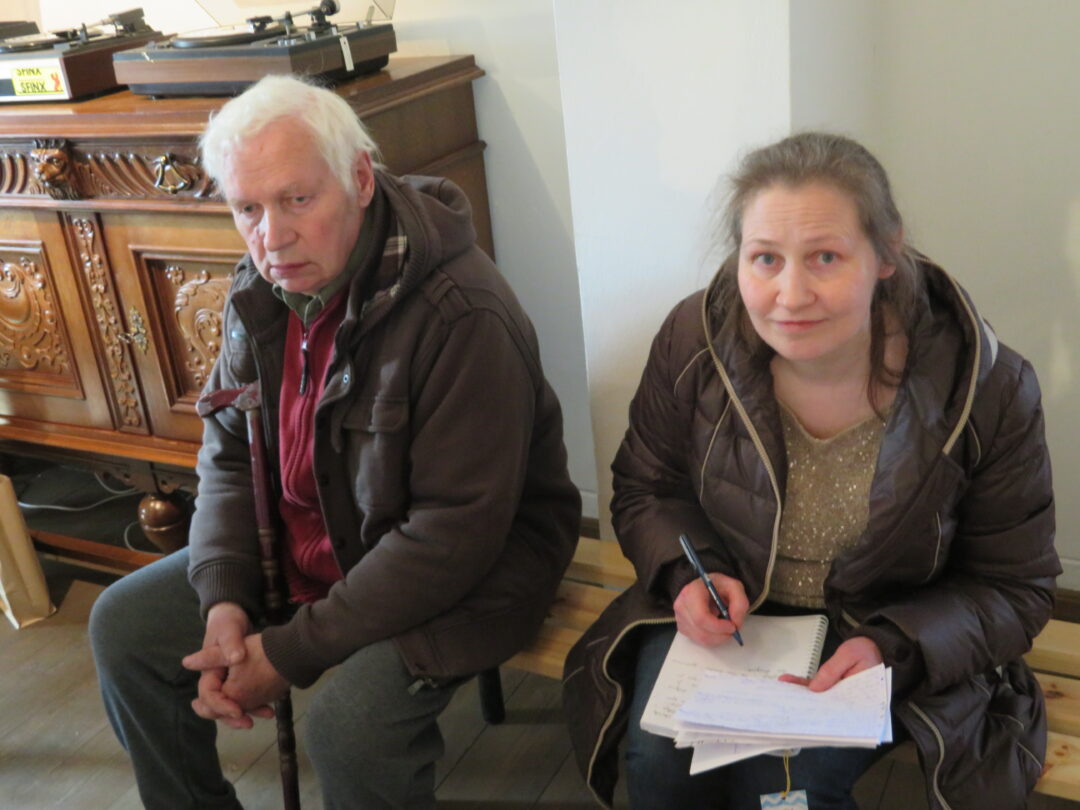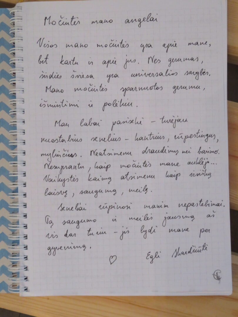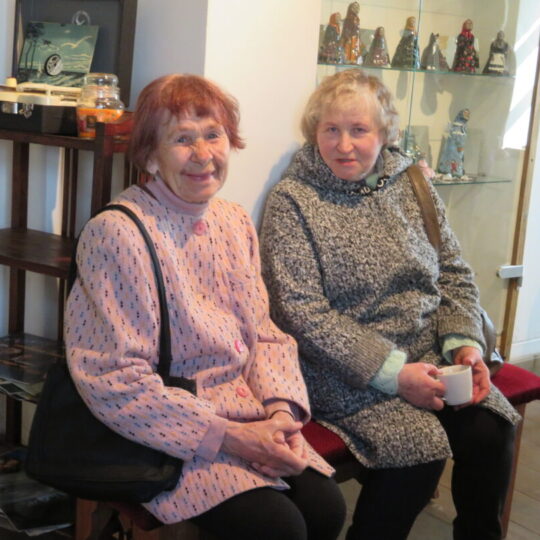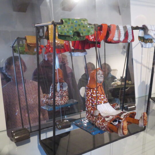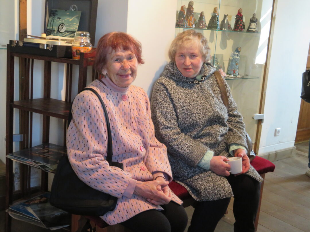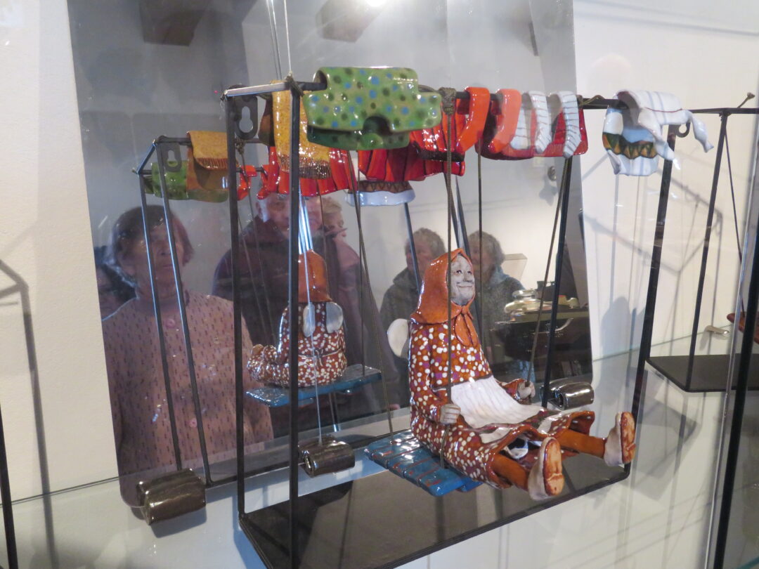 Stiklo vitrinose – beveik trys dešimtys spalvinga glazūra išpuoštų močiučių figūrėlių: besisupančių sūpuoklėse, mįslingai žvelgiančių į tolį, rankose laikančių rankinuką ir susiruošusių į bažnytėlę… Vienos iš jų rankose – kirvukas, o po pažastimi – vištelė. Kita, regis, seka lankytojų žvilgsnius ir gudriai šypsosi, tarsi kažką apie juos žinotų. „Tai paslapčių saugotoja, būrėja“, – įvardina autorė. Apie tai, kuo jos užsiima, galima spręsti iš išpieštų sijonų. Ant vienų sijonų žydi gėlės, kiti išmarginti naminių paukščių ar augintinių atvaizdais, tačiau visos močiutės sparnuotos tarsi angelai. Tose pačiose lentynose glaudžiasi ir spalvingi katinai. Juos taip pat nulipdė Eglė. Lankytojams ji palieka ranka surašytą savotišką atmintinę, pasakojančią apie tikruosius savo senelius ir keramines močiutes. Šiltus įspūdžius apie senolius ji atsinešė iš vaikystės.