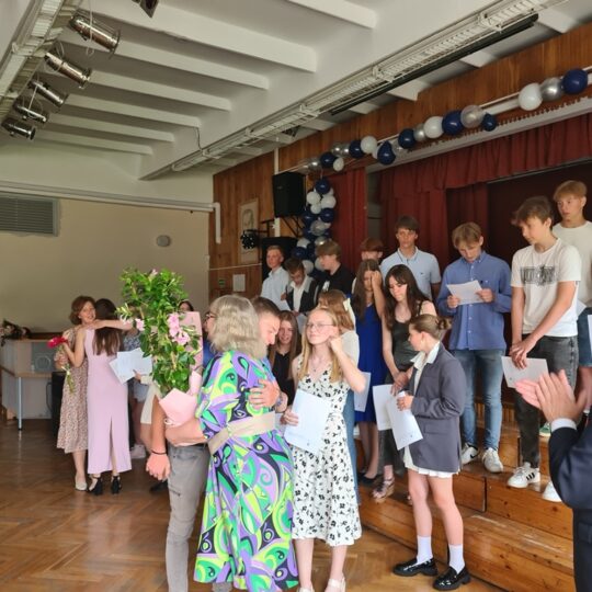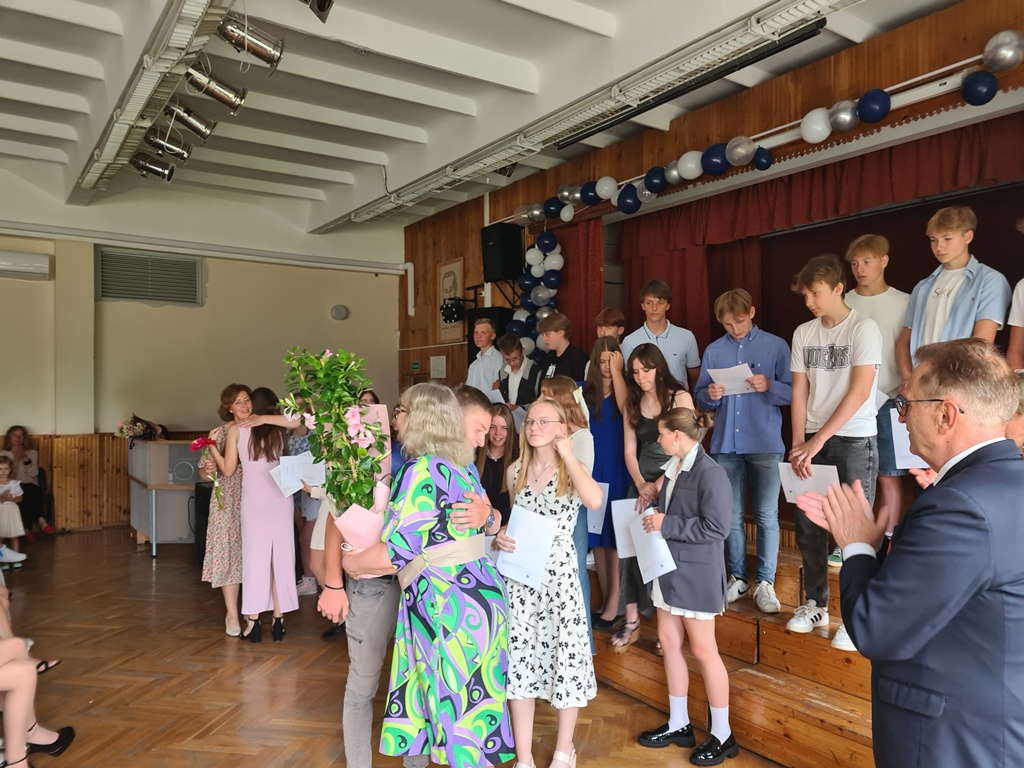 Su dainomis, šokiais ir glėbiais palinkėjimų tęsti mokslų į gimnaziją išlydėti aštuntokai savo ruožtu irgi neliko skolingi: dėkojo juos ugdžiusiems pedagogams, klasės auklėtojoms Linai Petrauskienei, Dianai Černiuvienei ir R. Čižauskienei, progimnazijos administracijai bei visam kolektyvui.