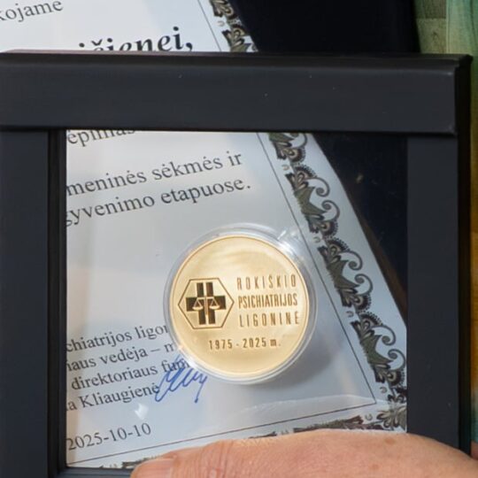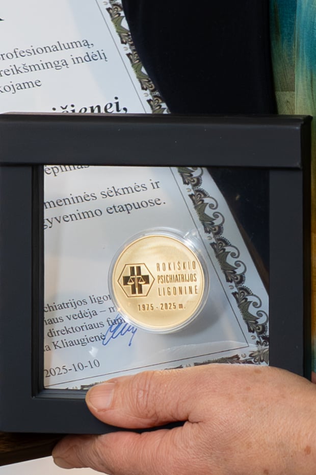 Ilgiausiai ligoninėje dirbusiems buvo įteikti padėkos raštai ir specialiai šiai progai Lietuvos monetų kalykloje nukaldintos sidabrinės paauksuotos monetos, kurių vienoje pusėje užrašas „Rokiškio psichiatrijos ligoninė 1975–2025“, o kitoje – lotyniškas įrašas „In servitium hominis et mentis“ („Žmogaus ir proto tarnystėje“). Gražu buvo klausyti, kai apdovanotieji vardino, kiek metų šioje ligoninėje išdirbo: 40, 42, 46, 49…