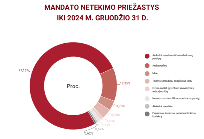 Į VRK, kuri atlieka ir mandatų komisijos funkcijas, dažniausiai kreipėsi tie savivaldybių tarybų nariai, kurie pageidavo palikti pareigas dėl to, kad pradėjo eiti su savivaldybės tarybos nario darbu nesuderinamas pareigas. Tokių prašymų fiksuota 125, iš jų 29 šių pareigų atsisakė 2024 m. lapkričio mėnesį, po to, kai jie buvo išrinkti į Seimą.