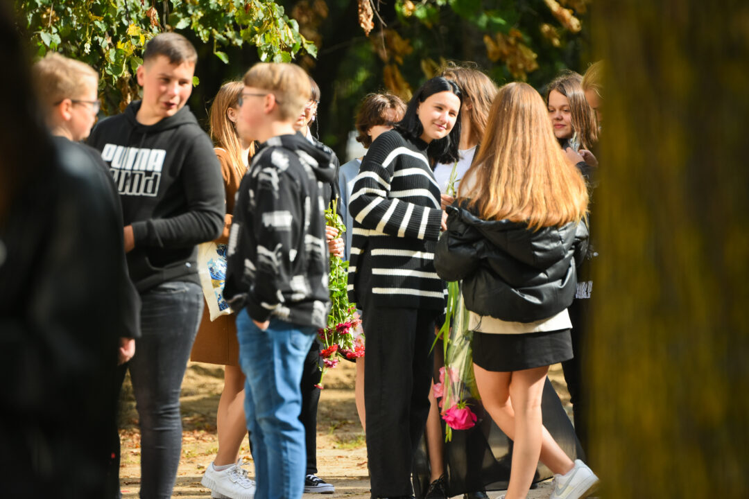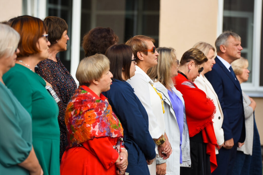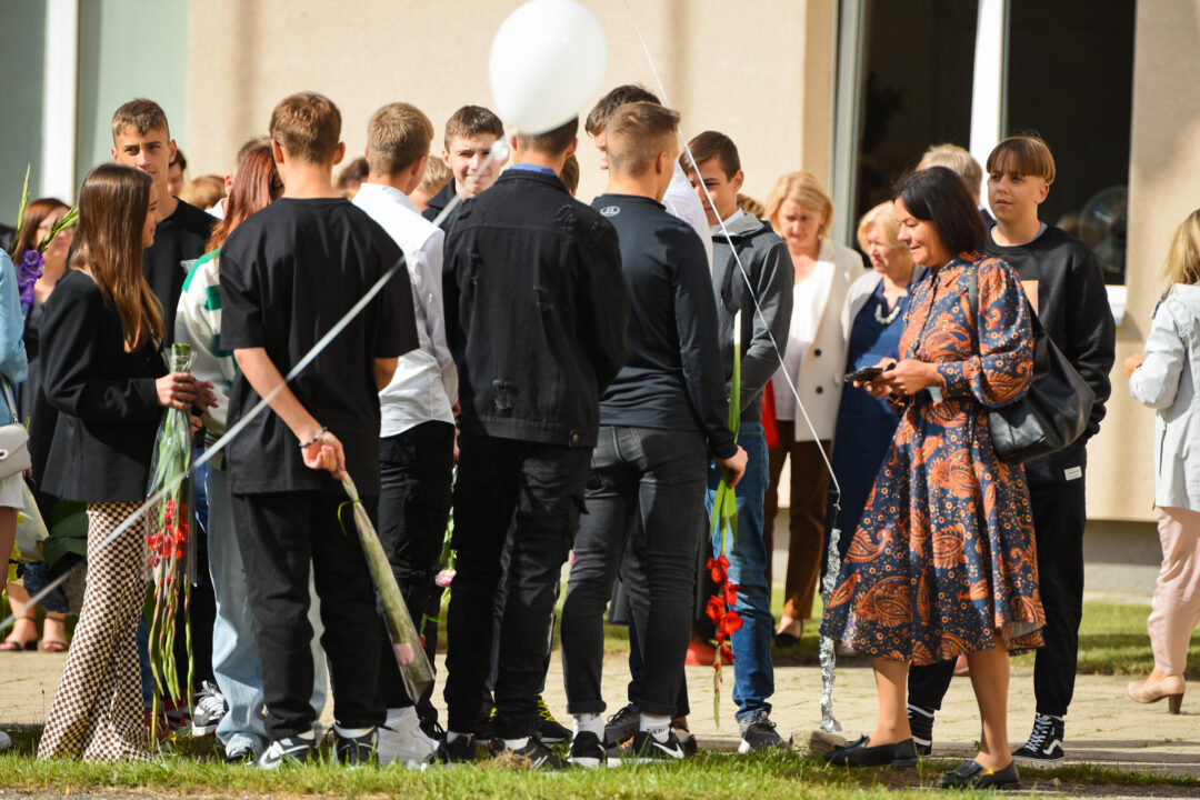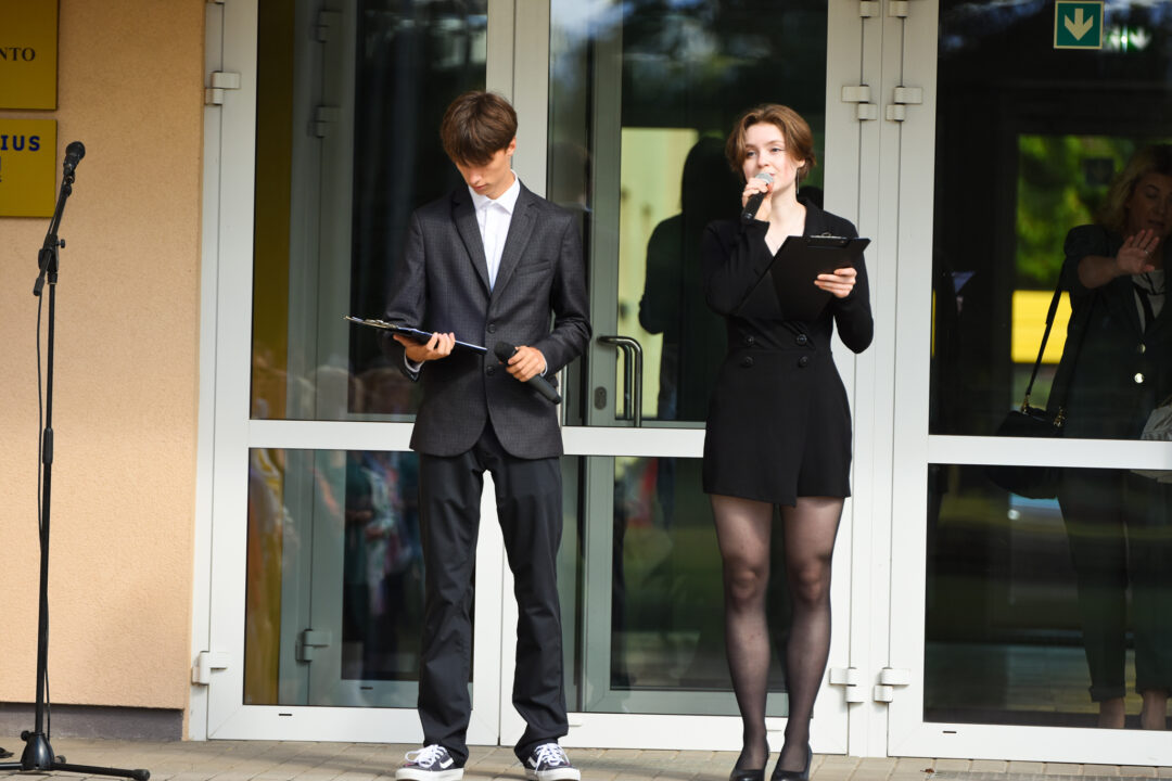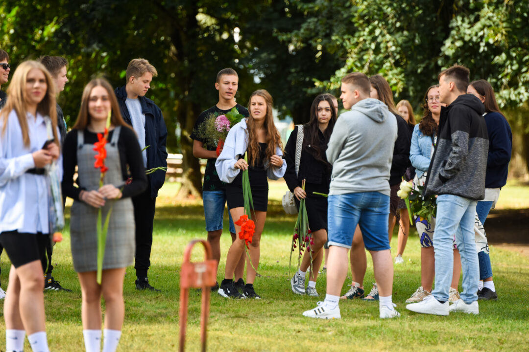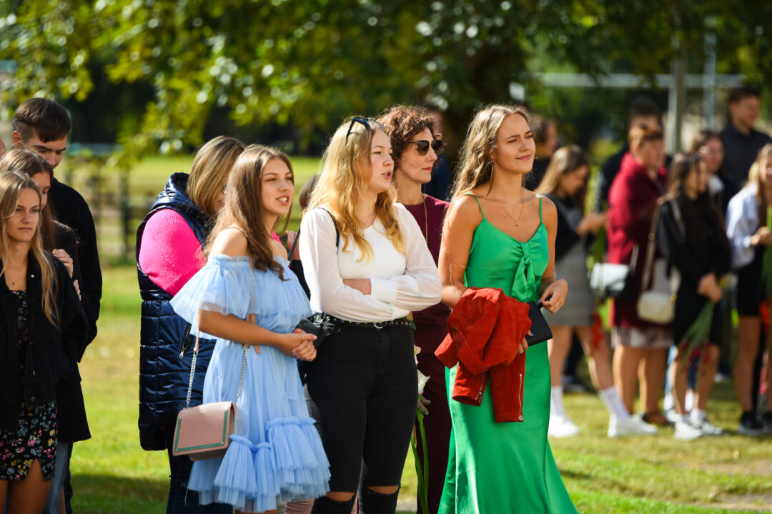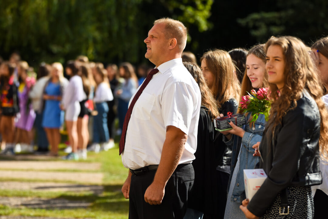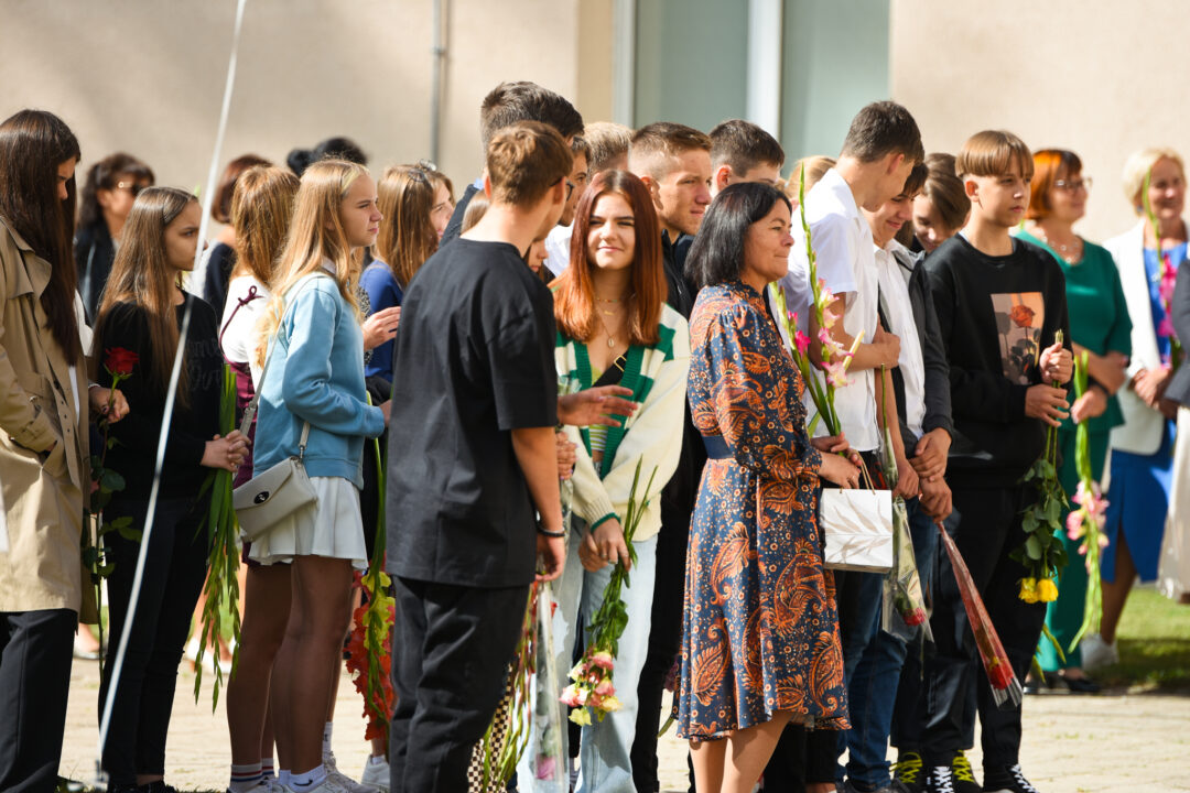 Tarp jų sklandė įvairiausių kalbų: užsiminta apie pačias nelaukiamiausias pamokas, dalintasi vasaros kelionių įspūdžiais, paliestos karo niokojamos Ukrainos temos. Vienuoliktą valandą į mokyklos teritoriją atėjo ir būrys abiturientų. Šventėje sveikino bmokyklos direktoriaus pavaduotoja J. Juodinytė bei Švietimo, kultūros ir sporto skyriaus vedėjas A. Laužadis. Jis prisiminė, kad šioje mokykloje buvo jau penkiasdešimt Rugsėjo 1-osios švenčių. „Man labiausiai įstrigo tai, kaip Paskutinio skambučio metu elgiasi abiturientai, kokie jie tada būna. Ir tada ypač matyti tai, kad jie tikrai mylėjo savo mokyklą. Noriu palinkėti visiems, kad meilę savo mokyklai jaustumėte ir tuomet, kai joje dar esate“, – linkėjo A. Laužadis.