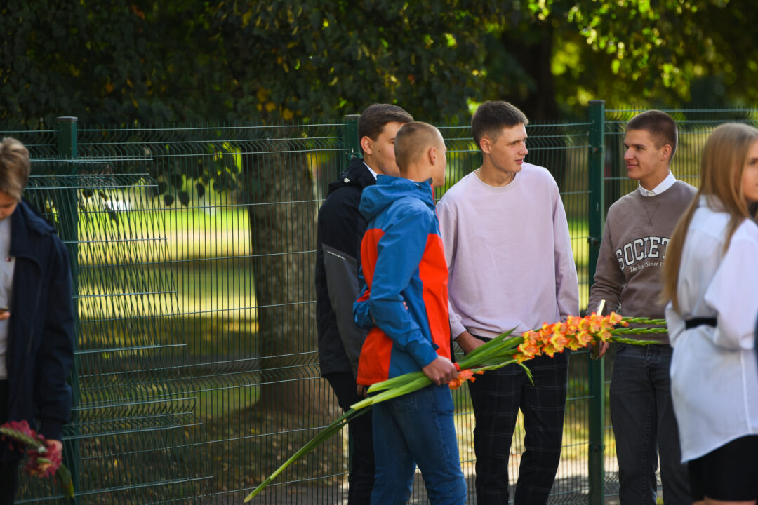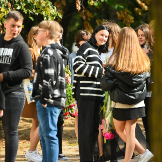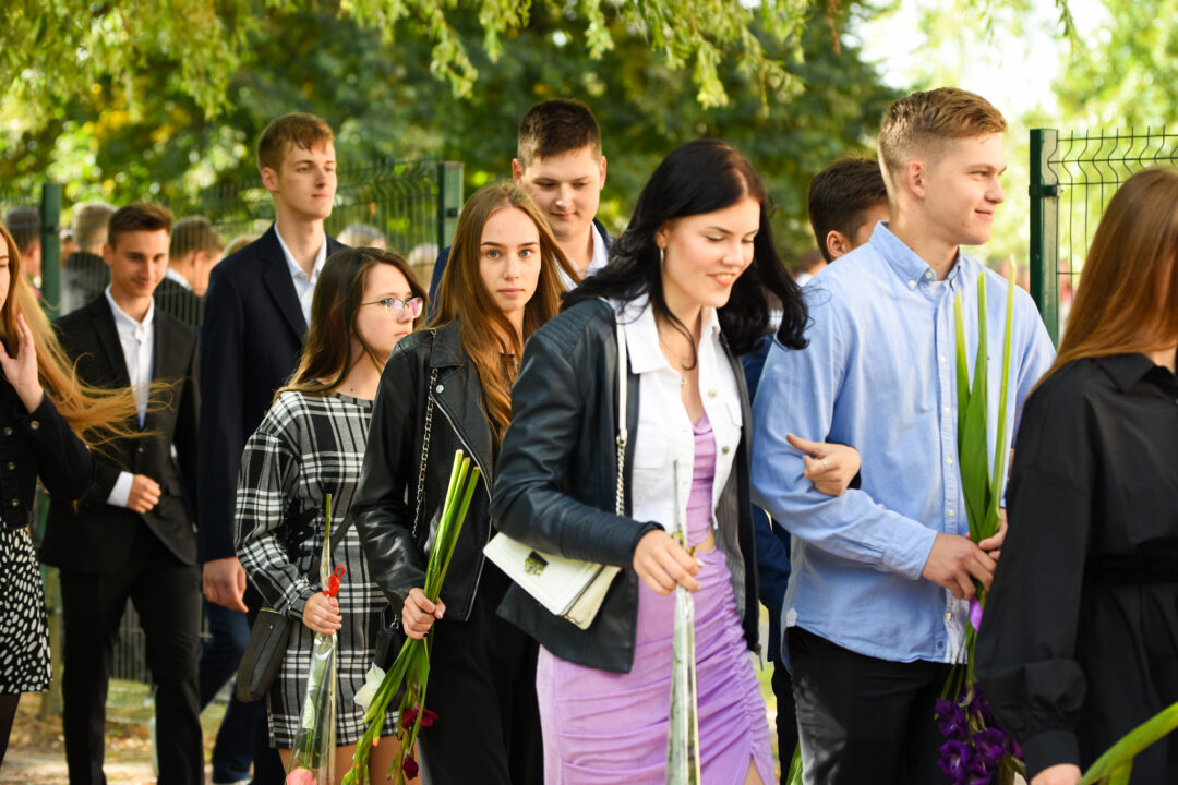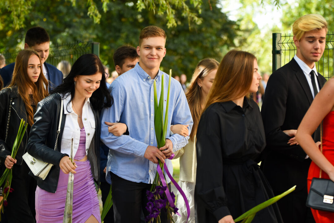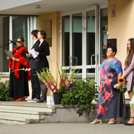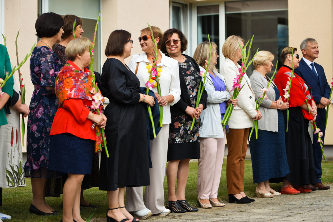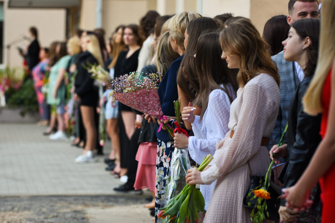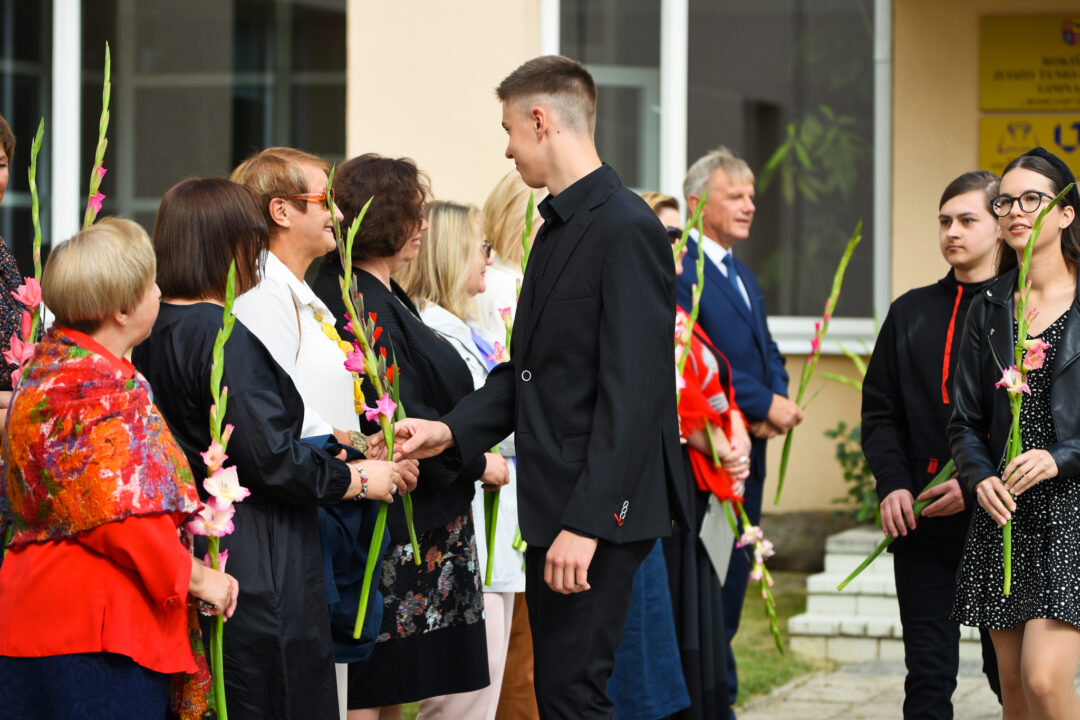 Tarp jų sklandė įvairiausių kalbų: užsiminta apie pačias nelaukiamiausias pamokas, dalintasi vasaros kelionių įspūdžiais, paliestos karo niokojamos Ukrainos temos. Vienuoliktą valandą į mokyklos teritoriją atėjo ir būrys abiturientų. Šventėje sveikino bmokyklos direktoriaus pavaduotoja J. Juodinytė bei Švietimo, kultūros ir sporto skyriaus vedėjas A. Laužadis. Jis prisiminė, kad šioje mokykloje buvo jau penkiasdešimt Rugsėjo 1-osios švenčių. „Man labiausiai įstrigo tai, kaip Paskutinio skambučio metu elgiasi abiturientai, kokie jie tada būna. Ir tada ypač matyti tai, kad jie tikrai mylėjo savo mokyklą. Noriu palinkėti visiems, kad meilę savo mokyklai jaustumėte ir tuomet, kai joje dar esate“, – linkėjo A. Laužadis.