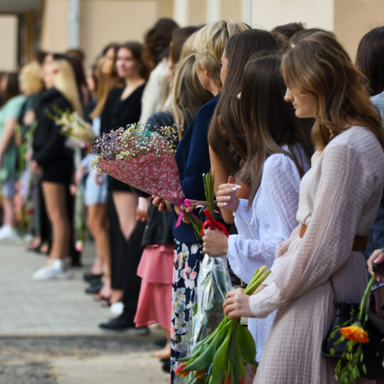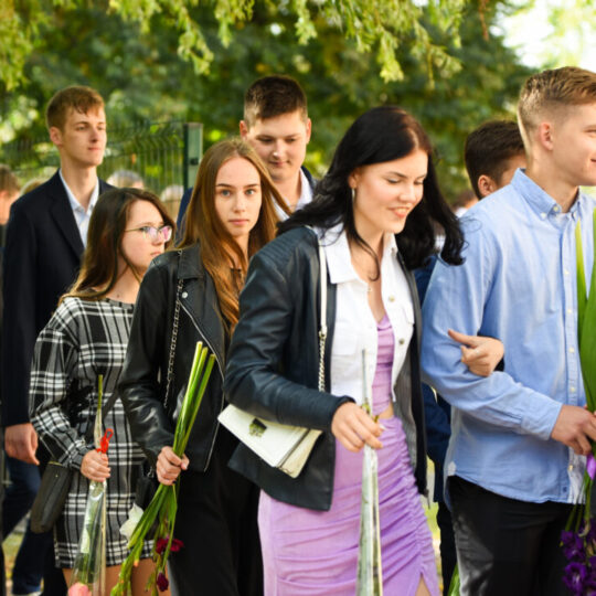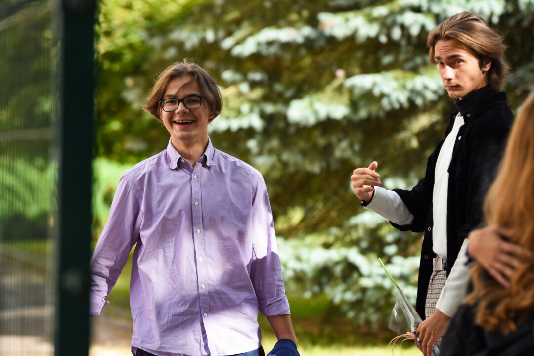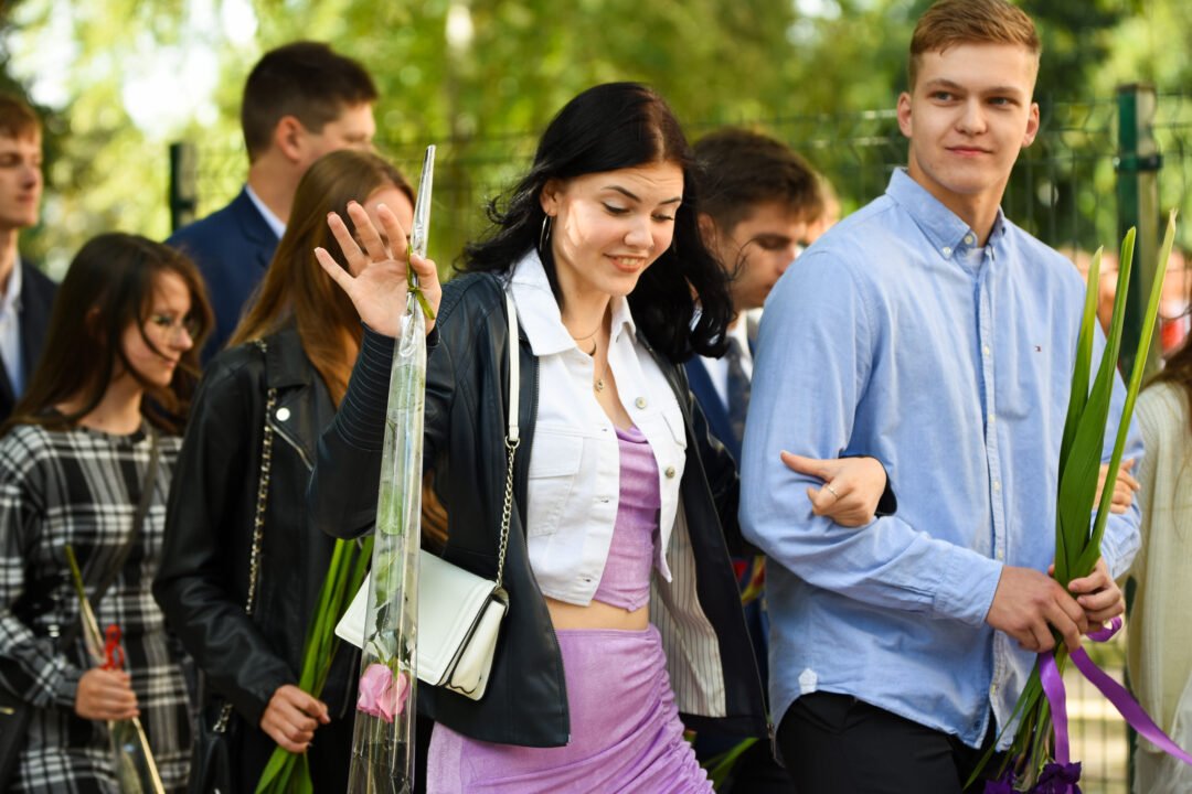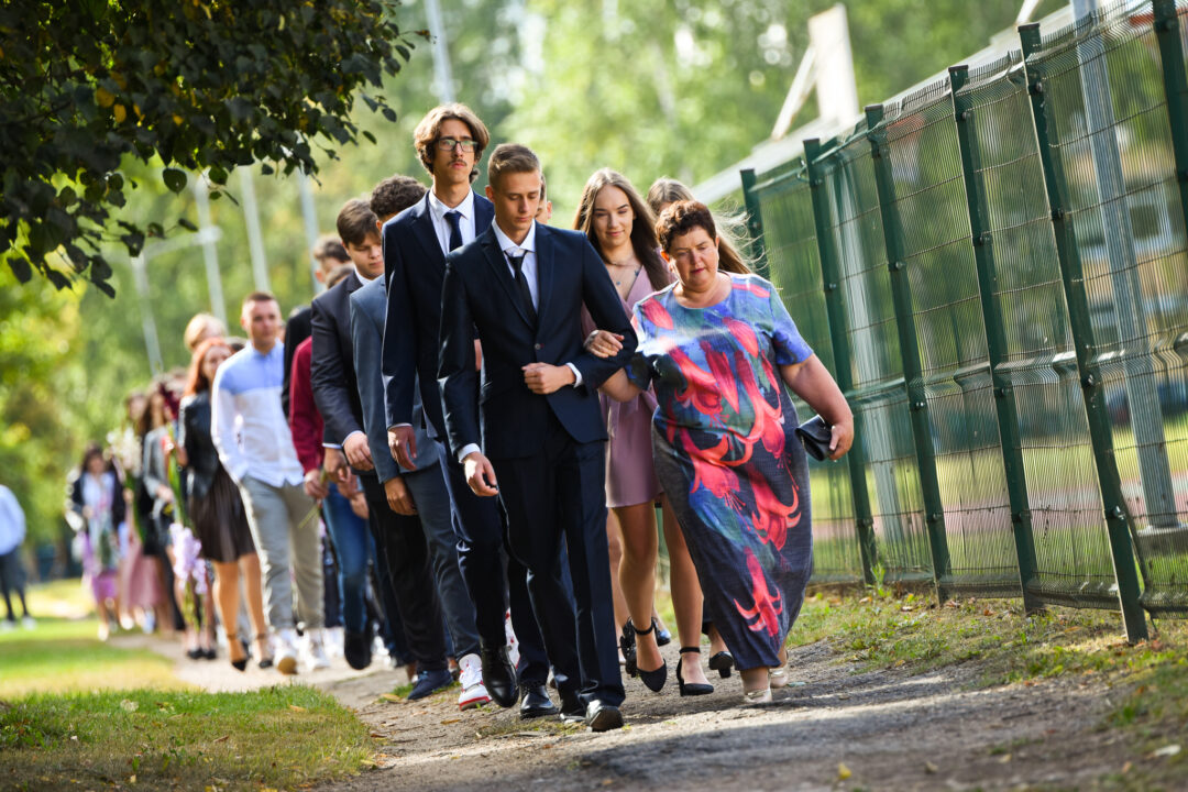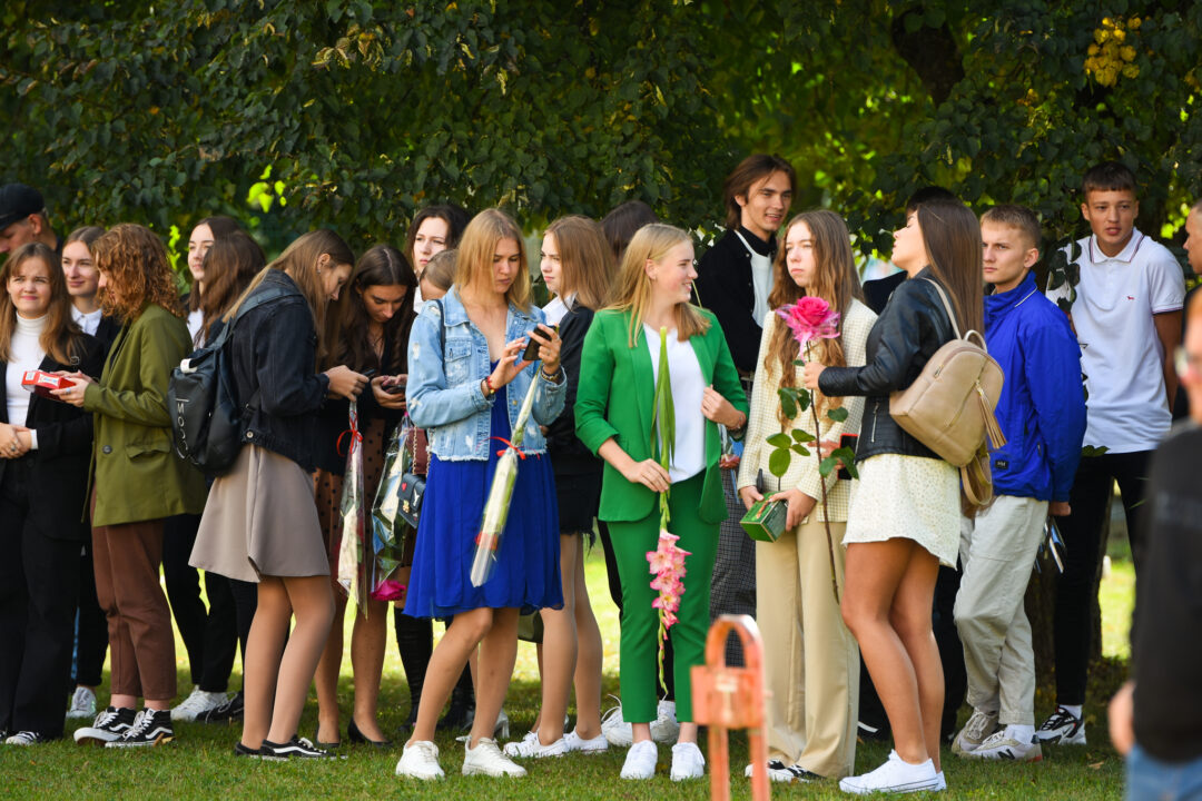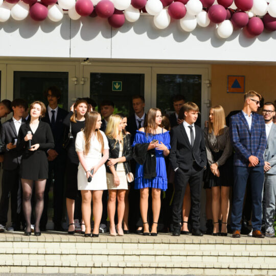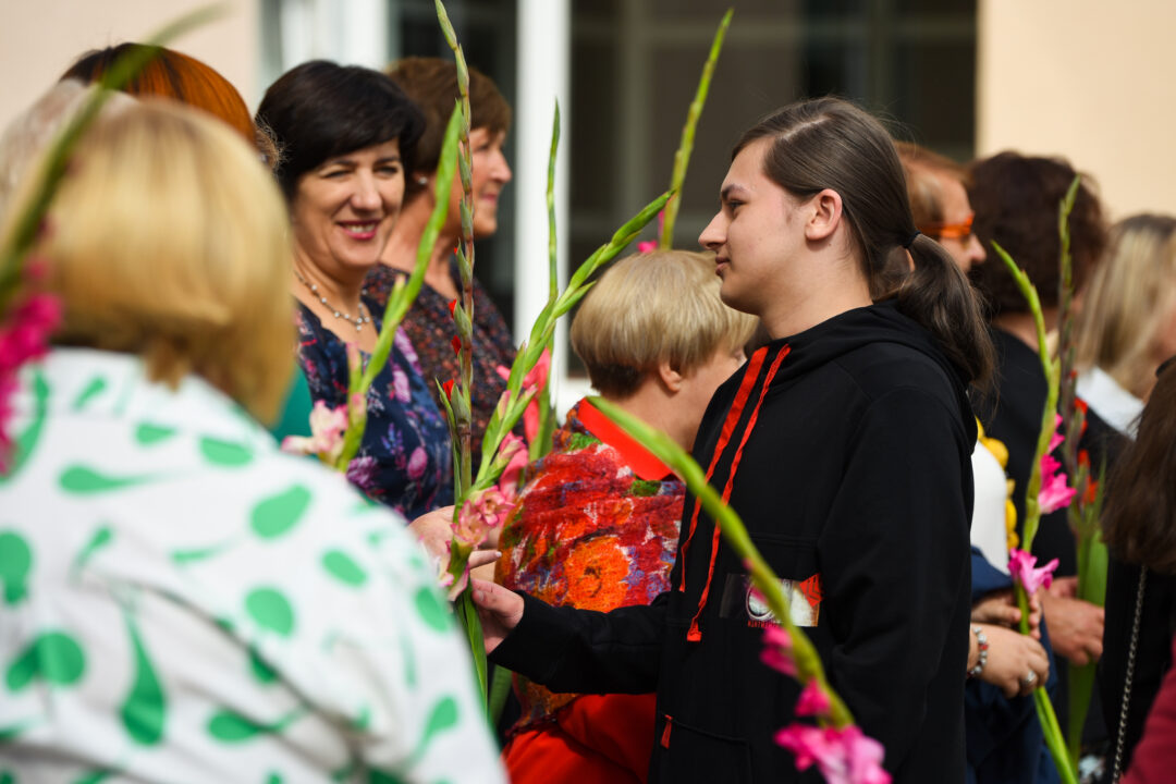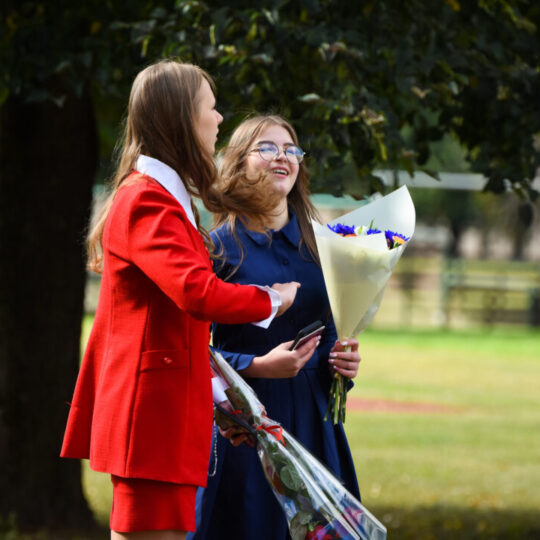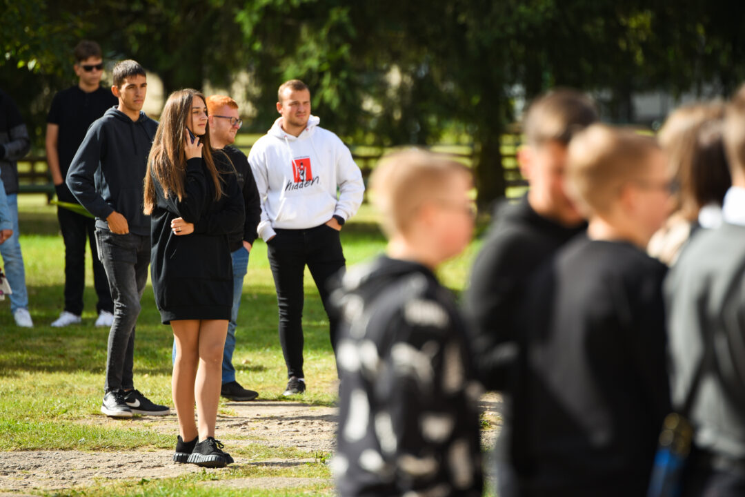 Tarp jų sklandė įvairiausių kalbų: užsiminta apie pačias nelaukiamiausias pamokas, dalintasi vasaros kelionių įspūdžiais, paliestos karo niokojamos Ukrainos temos. Vienuoliktą valandą į mokyklos teritoriją atėjo ir būrys abiturientų. Šventėje sveikino bmokyklos direktoriaus pavaduotoja J. Juodinytė bei Švietimo, kultūros ir sporto skyriaus vedėjas A. Laužadis. Jis prisiminė, kad šioje mokykloje buvo jau penkiasdešimt Rugsėjo 1-osios švenčių. „Man labiausiai įstrigo tai, kaip Paskutinio skambučio metu elgiasi abiturientai, kokie jie tada būna. Ir tada ypač matyti tai, kad jie tikrai mylėjo savo mokyklą. Noriu palinkėti visiems, kad meilę savo mokyklai jaustumėte ir tuomet, kai joje dar esate“, – linkėjo A. Laužadis.