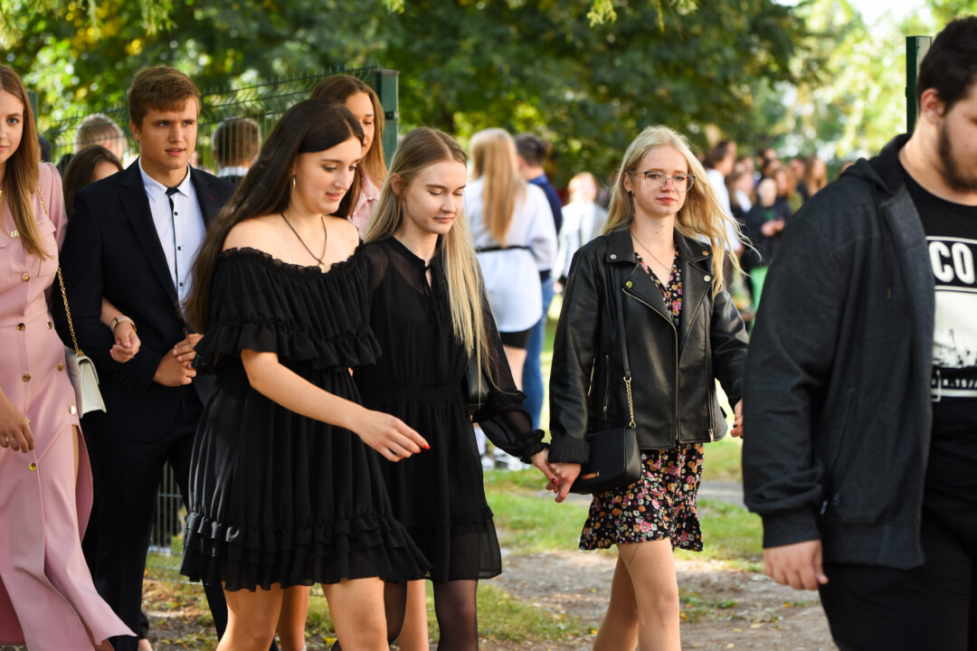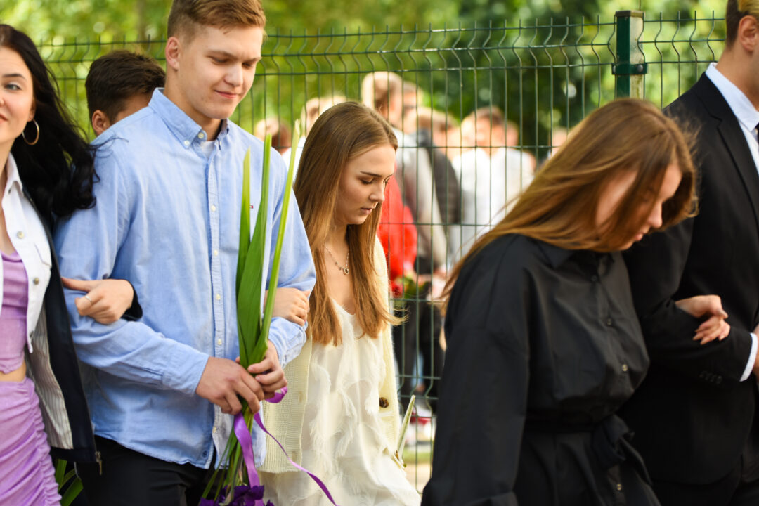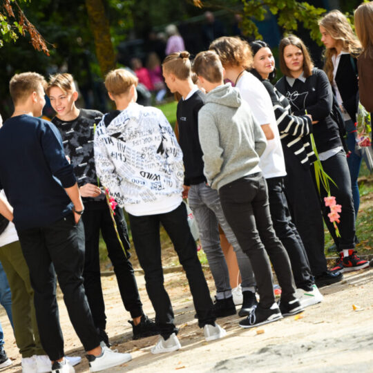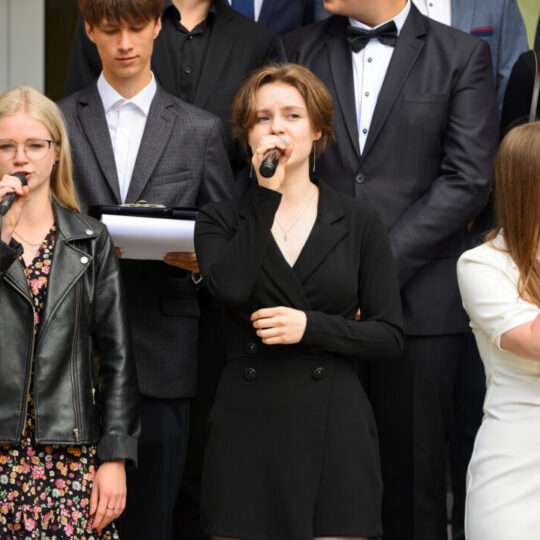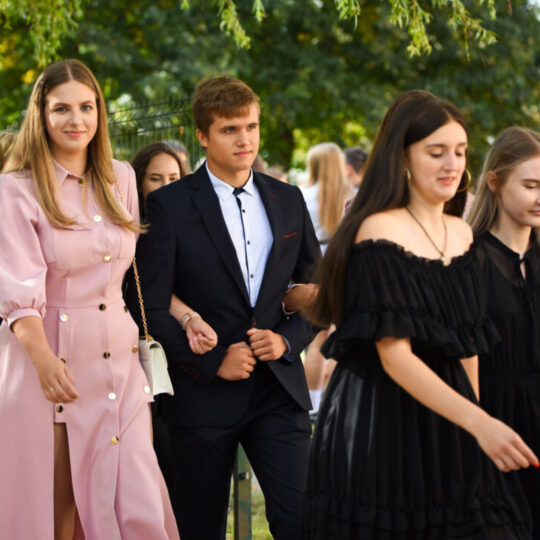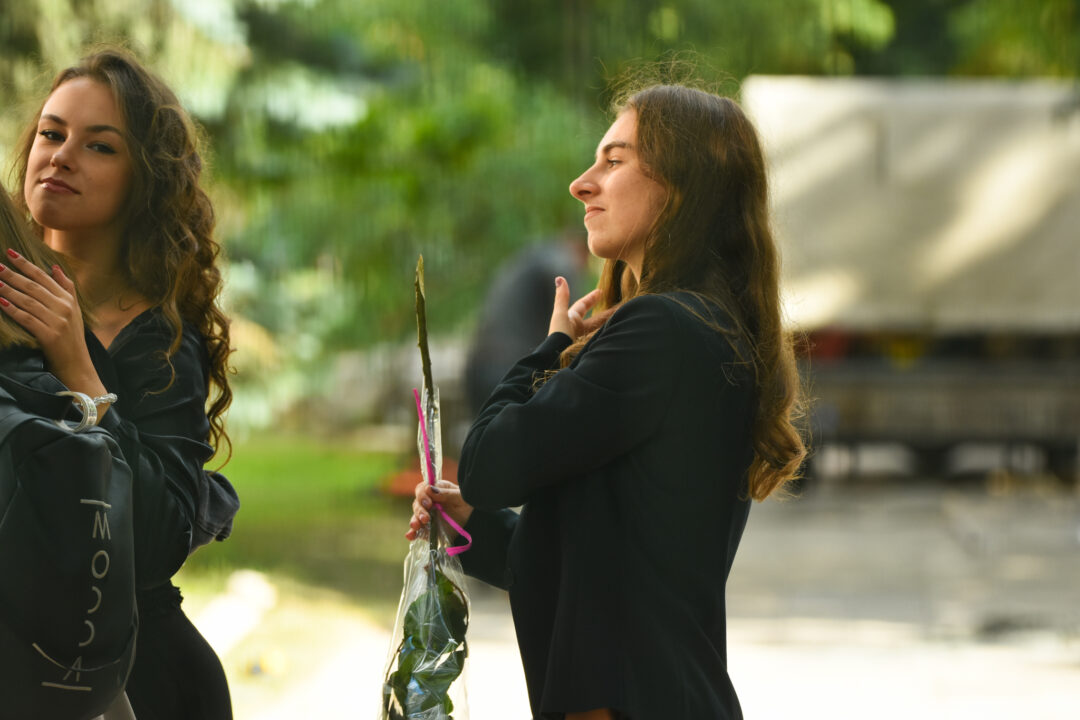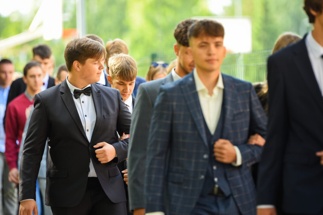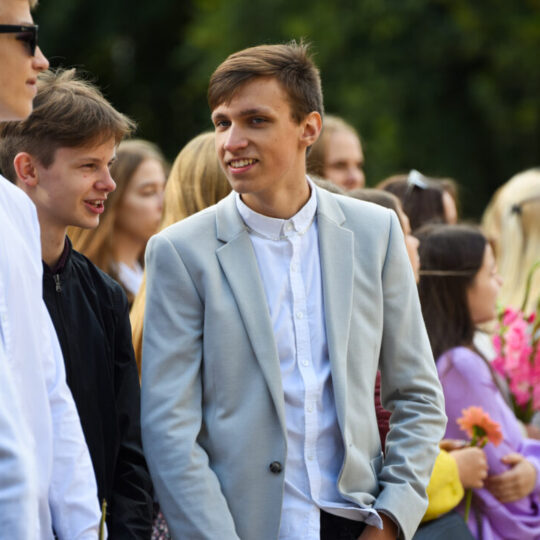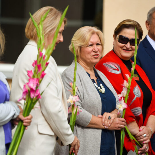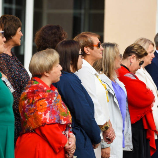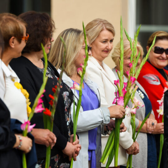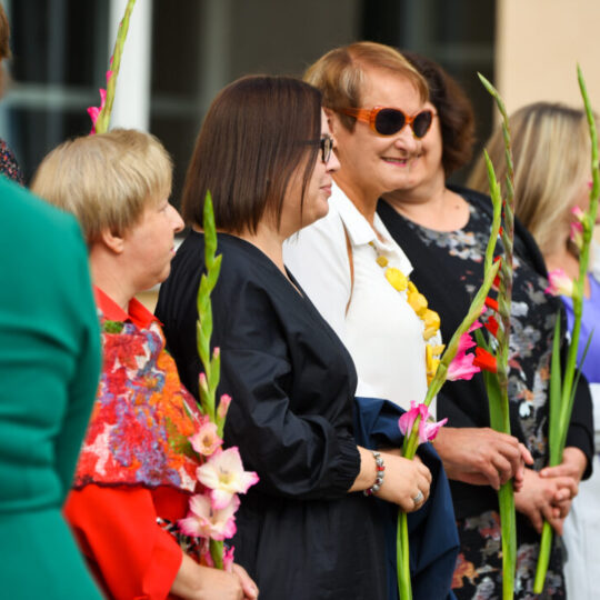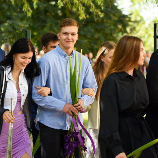 Tarp jų sklandė įvairiausių kalbų: užsiminta apie pačias nelaukiamiausias pamokas, dalintasi vasaros kelionių įspūdžiais, paliestos karo niokojamos Ukrainos temos. Vienuoliktą valandą į mokyklos teritoriją atėjo ir būrys abiturientų. Šventėje sveikino bmokyklos direktoriaus pavaduotoja J. Juodinytė bei Švietimo, kultūros ir sporto skyriaus vedėjas A. Laužadis. Jis prisiminė, kad šioje mokykloje buvo jau penkiasdešimt Rugsėjo 1-osios švenčių. „Man labiausiai įstrigo tai, kaip Paskutinio skambučio metu elgiasi abiturientai, kokie jie tada būna. Ir tada ypač matyti tai, kad jie tikrai mylėjo savo mokyklą. Noriu palinkėti visiems, kad meilę savo mokyklai jaustumėte ir tuomet, kai joje dar esate“, – linkėjo A. Laužadis.