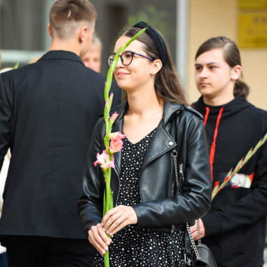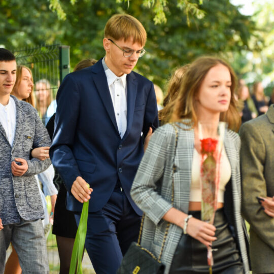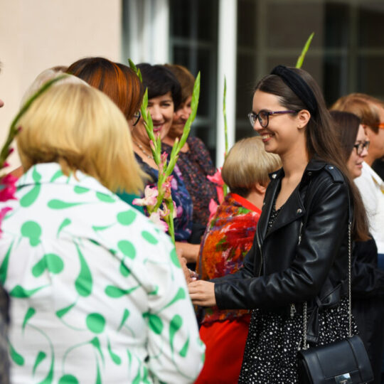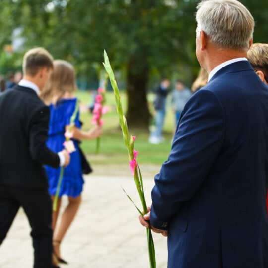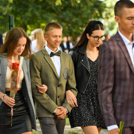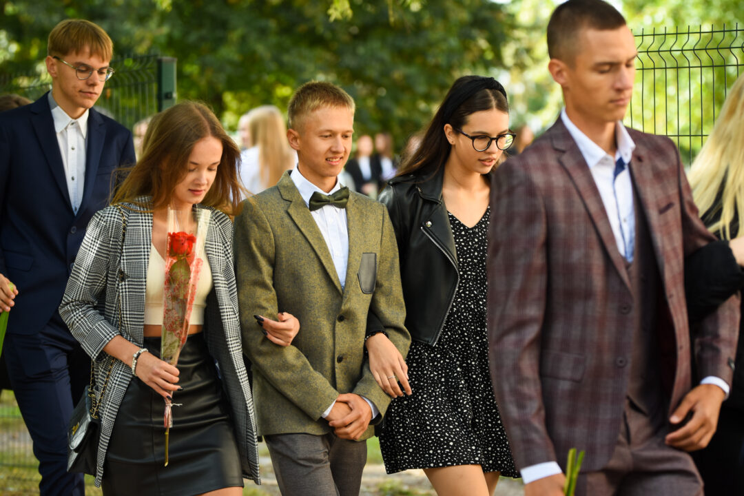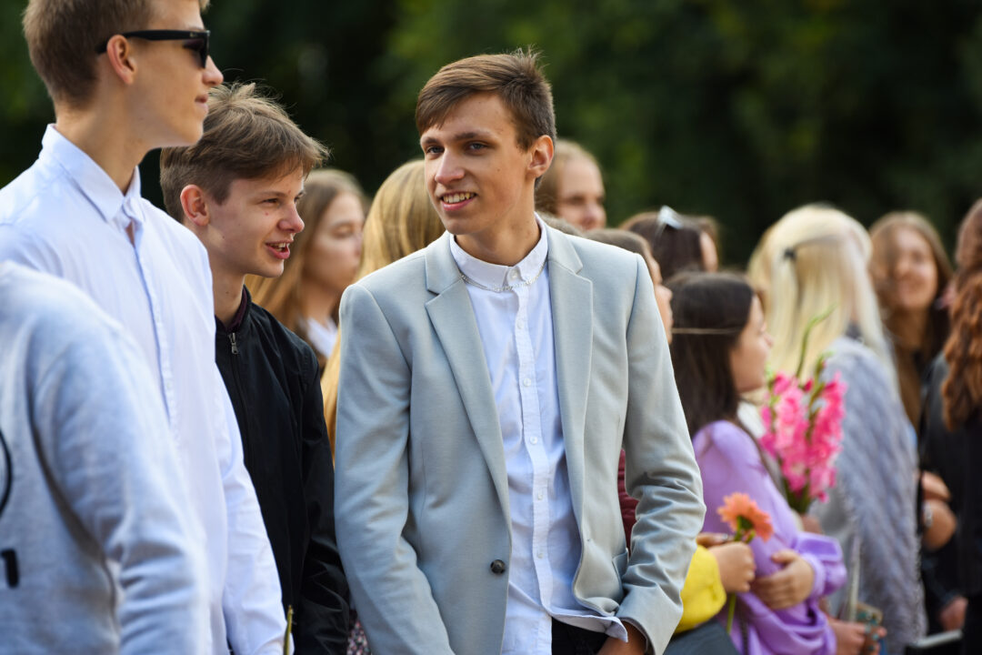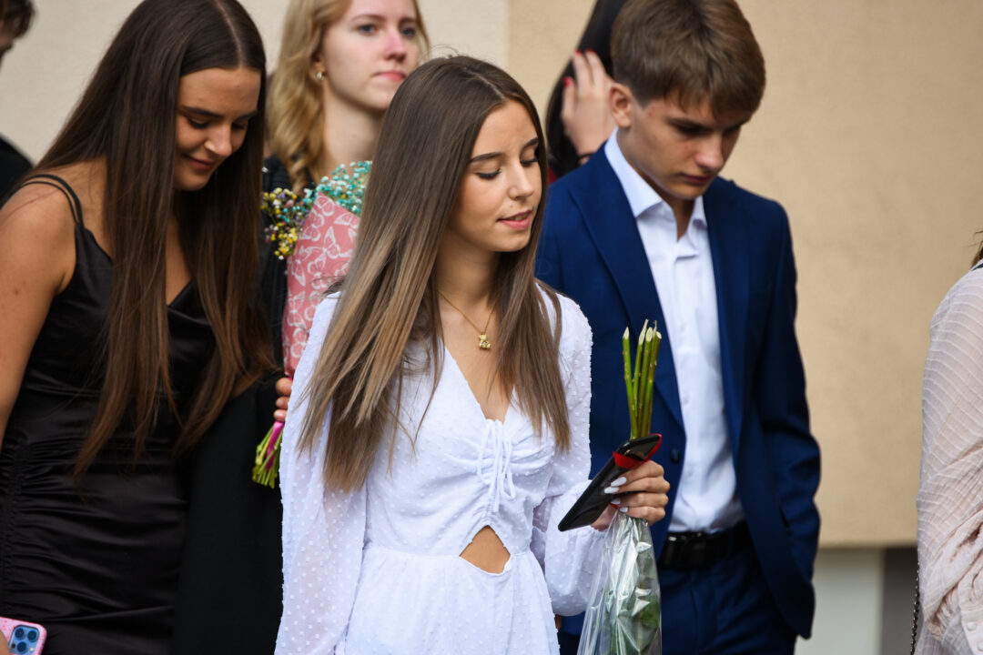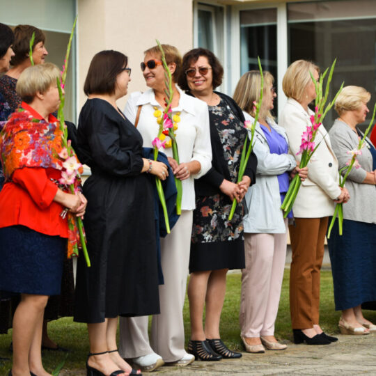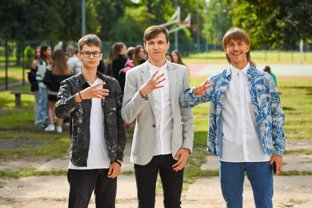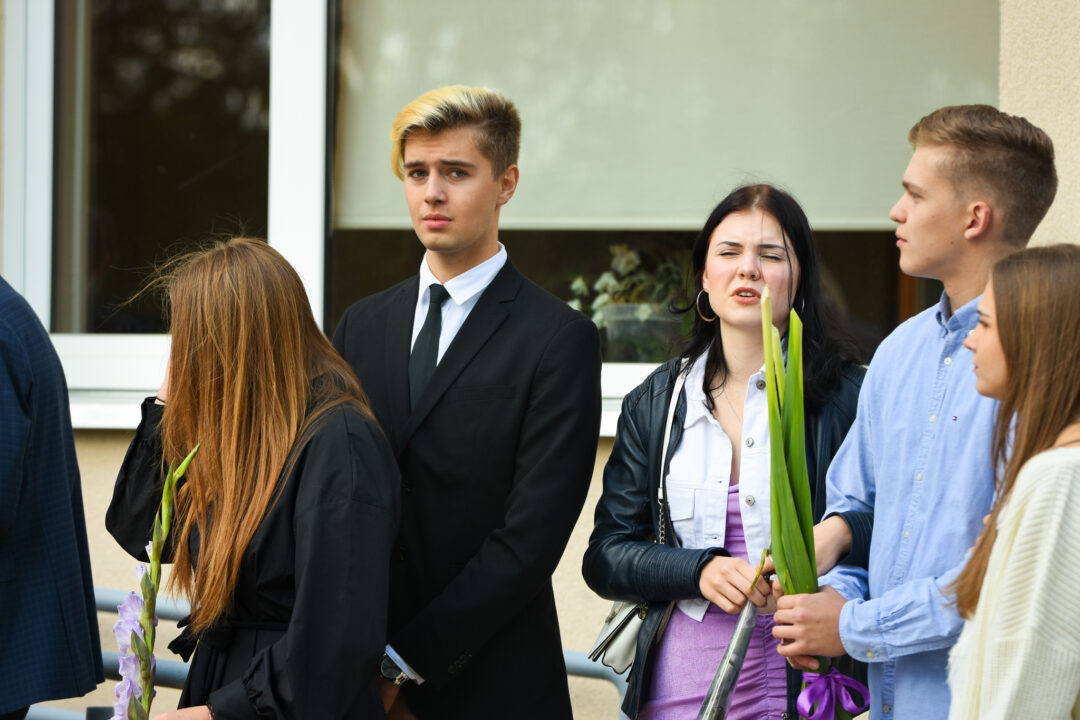 Tarp jų sklandė įvairiausių kalbų: užsiminta apie pačias nelaukiamiausias pamokas, dalintasi vasaros kelionių įspūdžiais, paliestos karo niokojamos Ukrainos temos. Vienuoliktą valandą į mokyklos teritoriją atėjo ir būrys abiturientų. Šventėje sveikino bmokyklos direktoriaus pavaduotoja J. Juodinytė bei Švietimo, kultūros ir sporto skyriaus vedėjas A. Laužadis. Jis prisiminė, kad šioje mokykloje buvo jau penkiasdešimt Rugsėjo 1-osios švenčių. „Man labiausiai įstrigo tai, kaip Paskutinio skambučio metu elgiasi abiturientai, kokie jie tada būna. Ir tada ypač matyti tai, kad jie tikrai mylėjo savo mokyklą. Noriu palinkėti visiems, kad meilę savo mokyklai jaustumėte ir tuomet, kai joje dar esate“, – linkėjo A. Laužadis.
