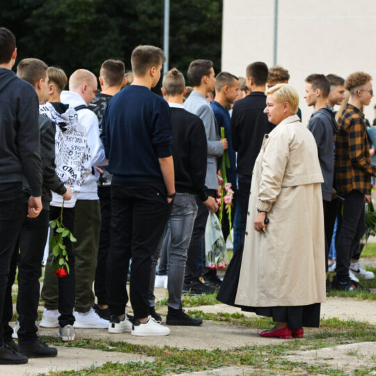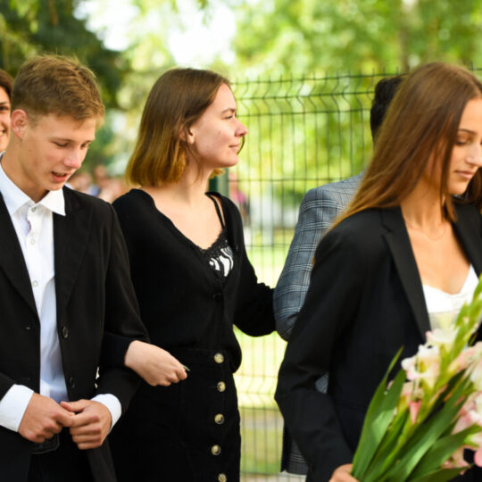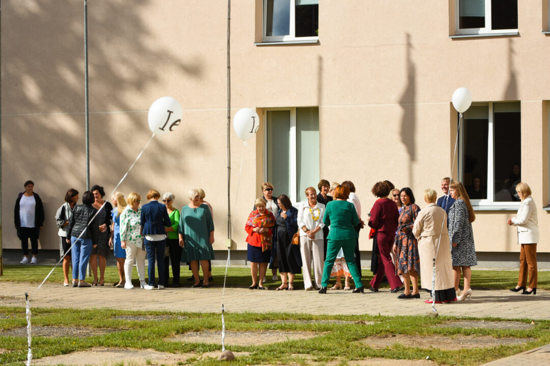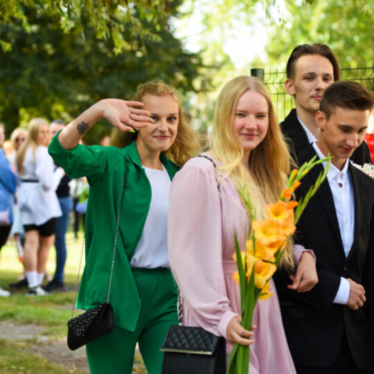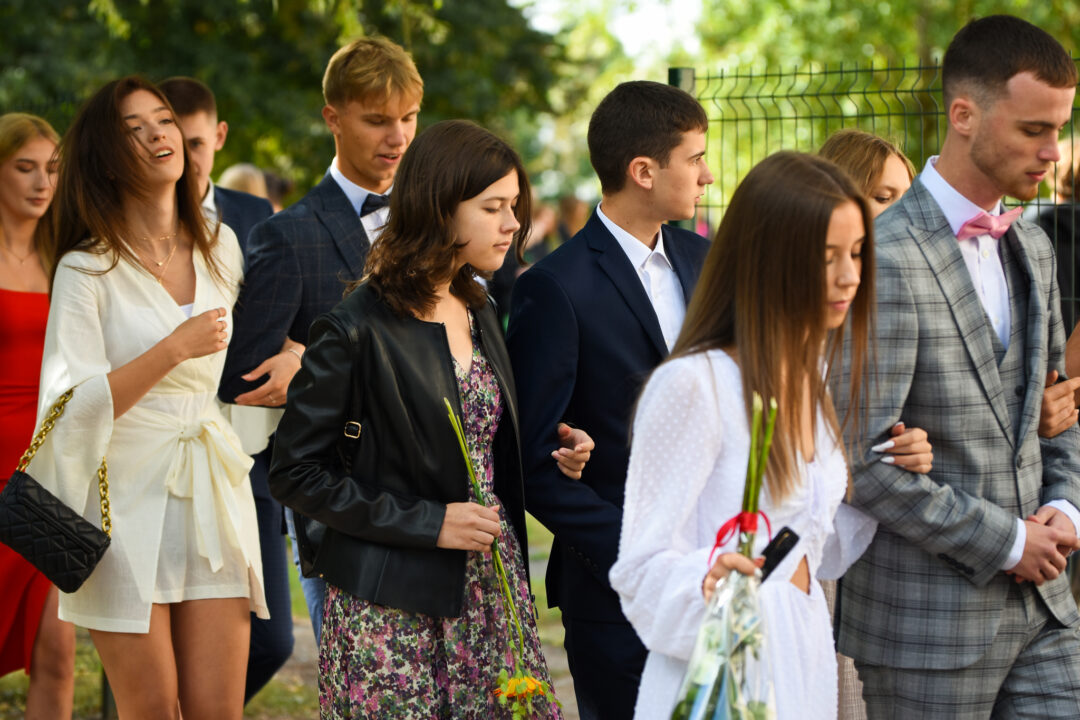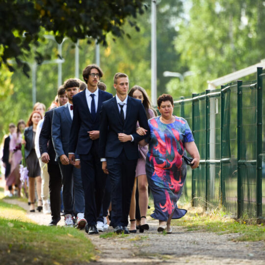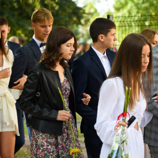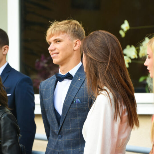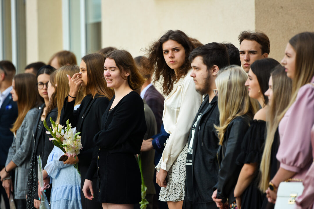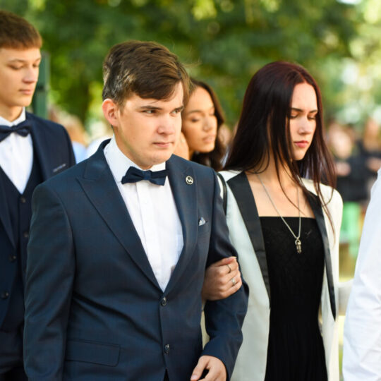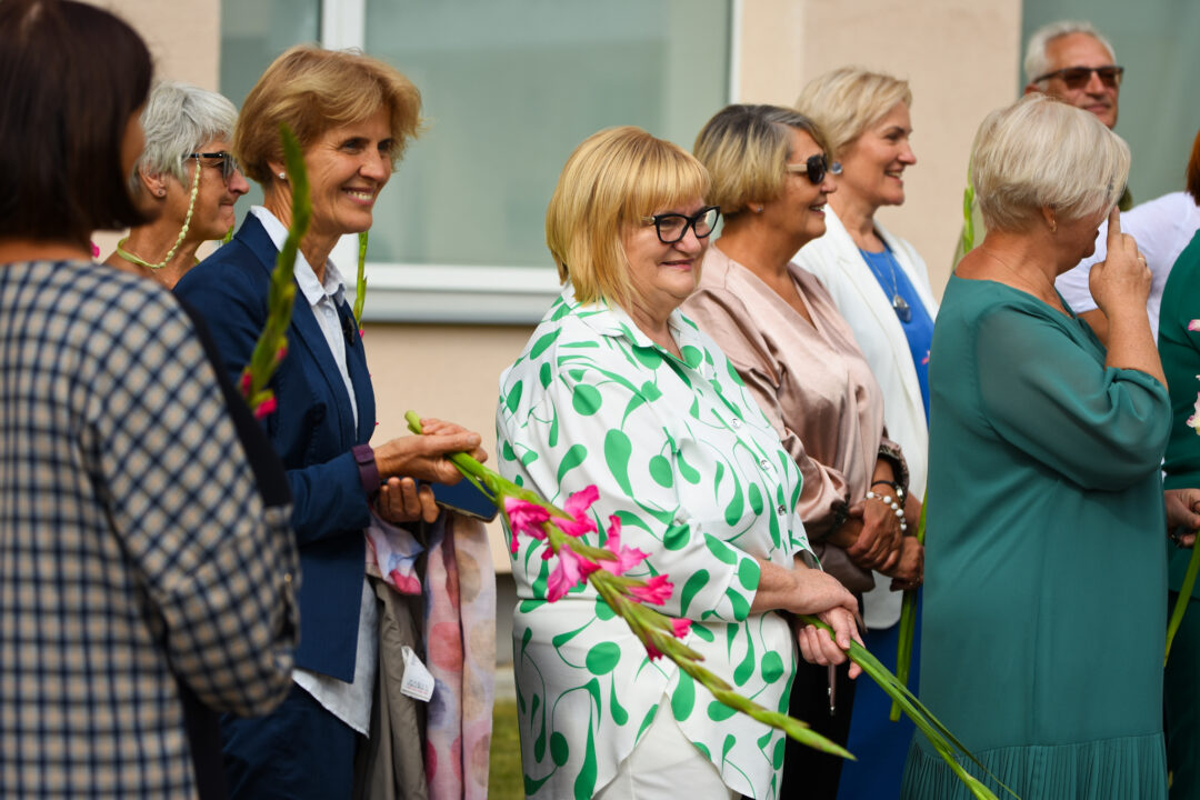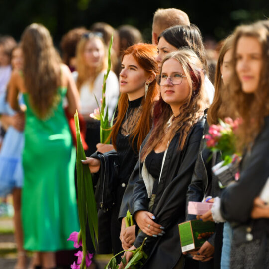 Tarp jų sklandė įvairiausių kalbų: užsiminta apie pačias nelaukiamiausias pamokas, dalintasi vasaros kelionių įspūdžiais, paliestos karo niokojamos Ukrainos temos. Vienuoliktą valandą į mokyklos teritoriją atėjo ir būrys abiturientų. Šventėje sveikino bmokyklos direktoriaus pavaduotoja J. Juodinytė bei Švietimo, kultūros ir sporto skyriaus vedėjas A. Laužadis. Jis prisiminė, kad šioje mokykloje buvo jau penkiasdešimt Rugsėjo 1-osios švenčių. „Man labiausiai įstrigo tai, kaip Paskutinio skambučio metu elgiasi abiturientai, kokie jie tada būna. Ir tada ypač matyti tai, kad jie tikrai mylėjo savo mokyklą. Noriu palinkėti visiems, kad meilę savo mokyklai jaustumėte ir tuomet, kai joje dar esate“, – linkėjo A. Laužadis.
