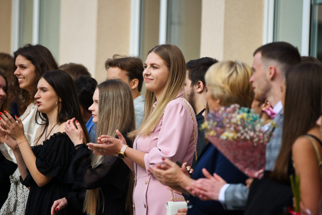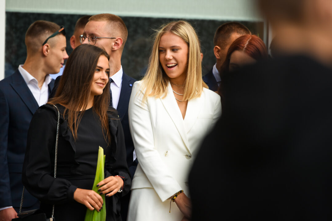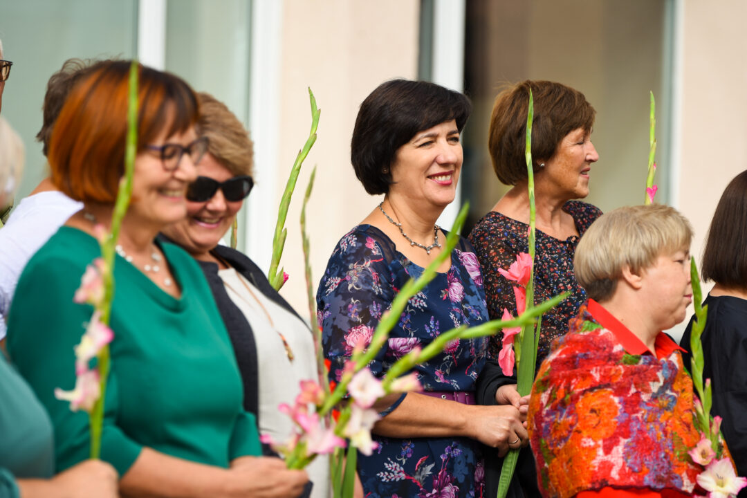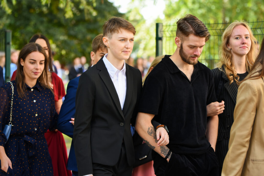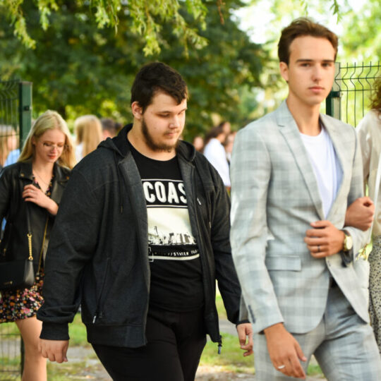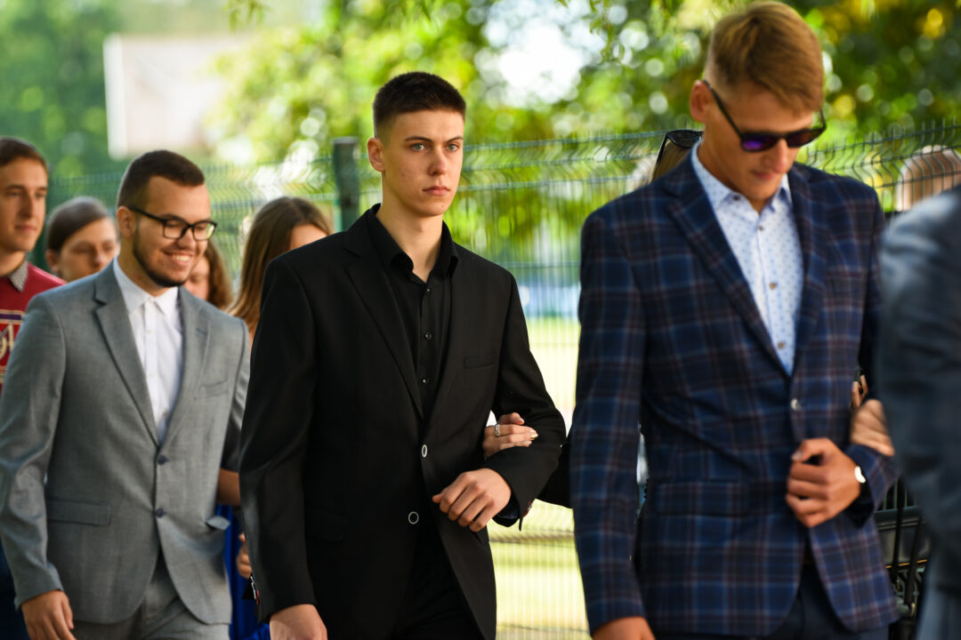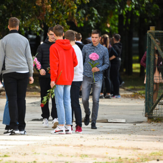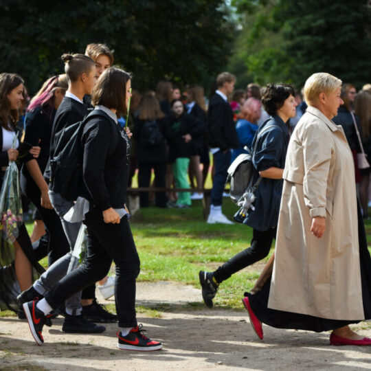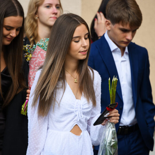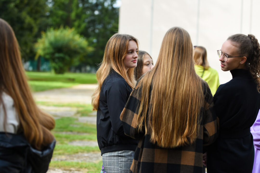 Tarp jų sklandė įvairiausių kalbų: užsiminta apie pačias nelaukiamiausias pamokas, dalintasi vasaros kelionių įspūdžiais, paliestos karo niokojamos Ukrainos temos. Vienuoliktą valandą į mokyklos teritoriją atėjo ir būrys abiturientų. Šventėje sveikino bmokyklos direktoriaus pavaduotoja J. Juodinytė bei Švietimo, kultūros ir sporto skyriaus vedėjas A. Laužadis. Jis prisiminė, kad šioje mokykloje buvo jau penkiasdešimt Rugsėjo 1-osios švenčių. „Man labiausiai įstrigo tai, kaip Paskutinio skambučio metu elgiasi abiturientai, kokie jie tada būna. Ir tada ypač matyti tai, kad jie tikrai mylėjo savo mokyklą. Noriu palinkėti visiems, kad meilę savo mokyklai jaustumėte ir tuomet, kai joje dar esate“, – linkėjo A. Laužadis.