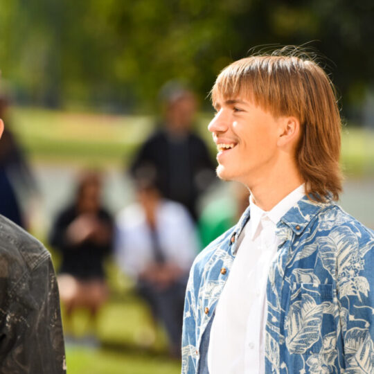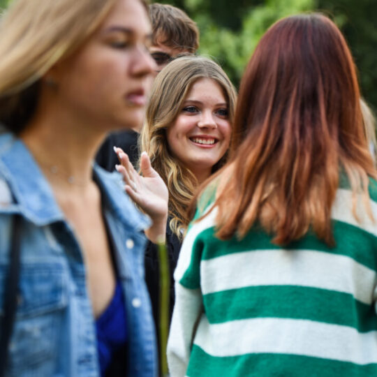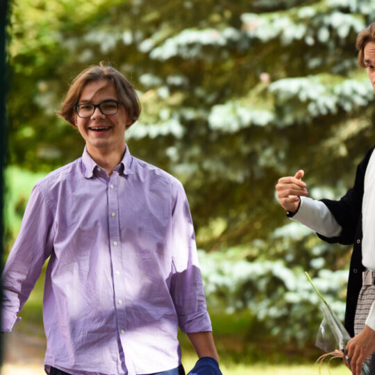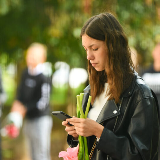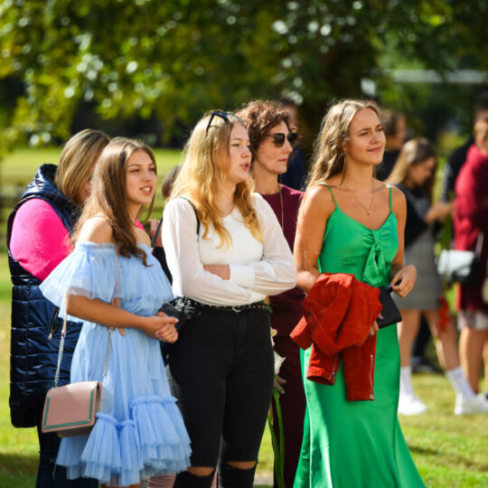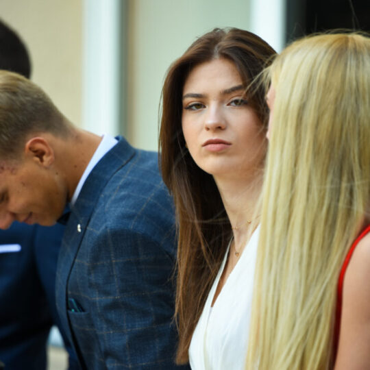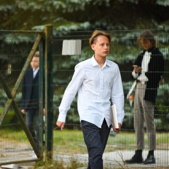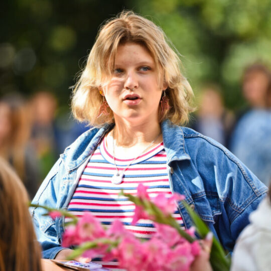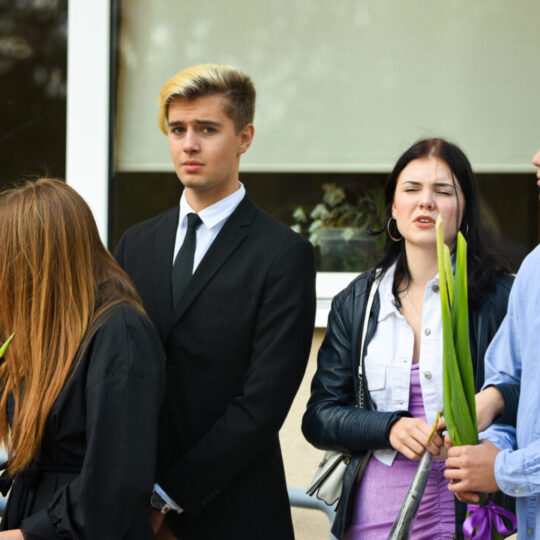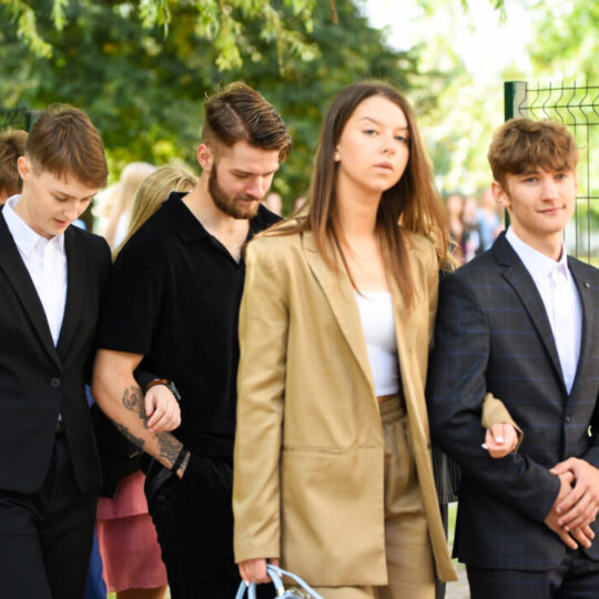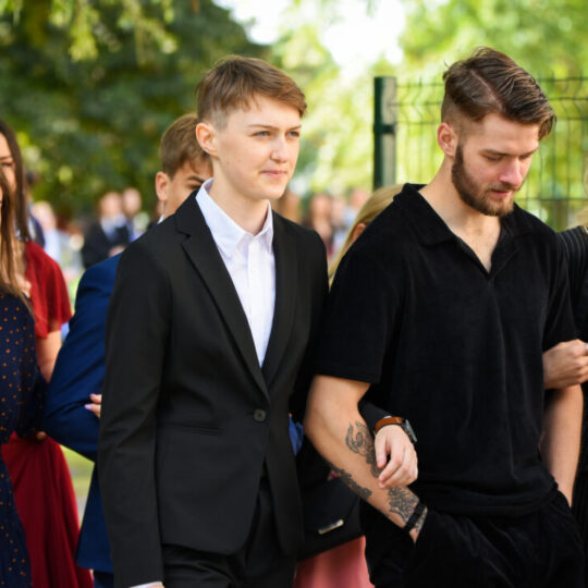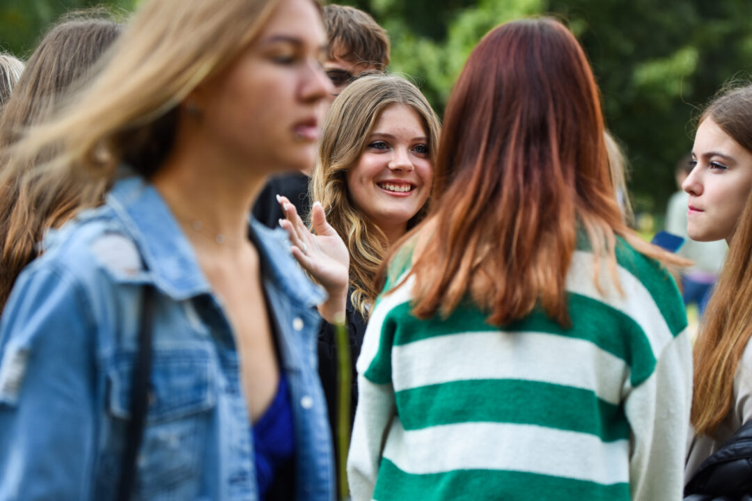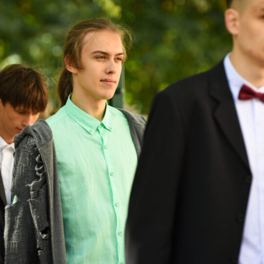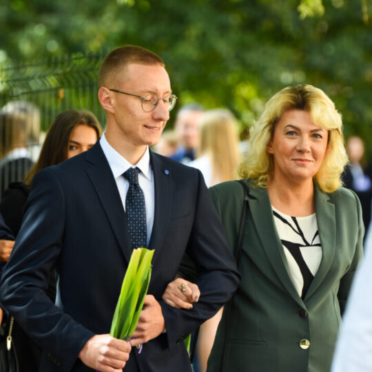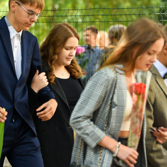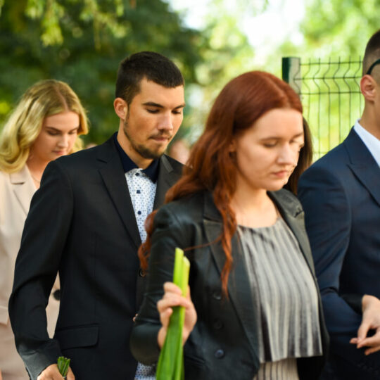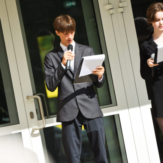 Tarp jų sklandė įvairiausių kalbų: užsiminta apie pačias nelaukiamiausias pamokas, dalintasi vasaros kelionių įspūdžiais, paliestos karo niokojamos Ukrainos temos. Vienuoliktą valandą į mokyklos teritoriją atėjo ir būrys abiturientų. Šventėje sveikino bmokyklos direktoriaus pavaduotoja J. Juodinytė bei Švietimo, kultūros ir sporto skyriaus vedėjas A. Laužadis. Jis prisiminė, kad šioje mokykloje buvo jau penkiasdešimt Rugsėjo 1-osios švenčių. „Man labiausiai įstrigo tai, kaip Paskutinio skambučio metu elgiasi abiturientai, kokie jie tada būna. Ir tada ypač matyti tai, kad jie tikrai mylėjo savo mokyklą. Noriu palinkėti visiems, kad meilę savo mokyklai jaustumėte ir tuomet, kai joje dar esate“, – linkėjo A. Laužadis.