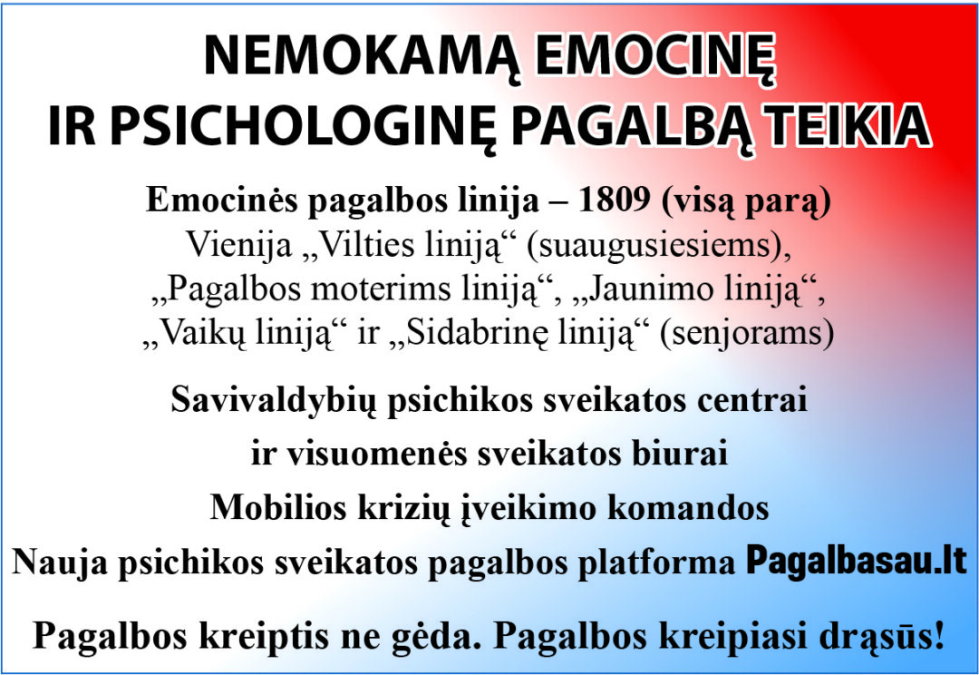 Taip pat primenama, kad šalyje veikia nemokama emocinės paramos telefonu linija 1809, todėl piliečiai raginami nedelsti ir kreiptis pagalbos.
