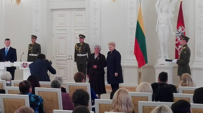 Šventinis momentas. Prezidentė Dalia Grybauskaitė ir Liudgarda Karpavičienė. A.Kulio nuotr.