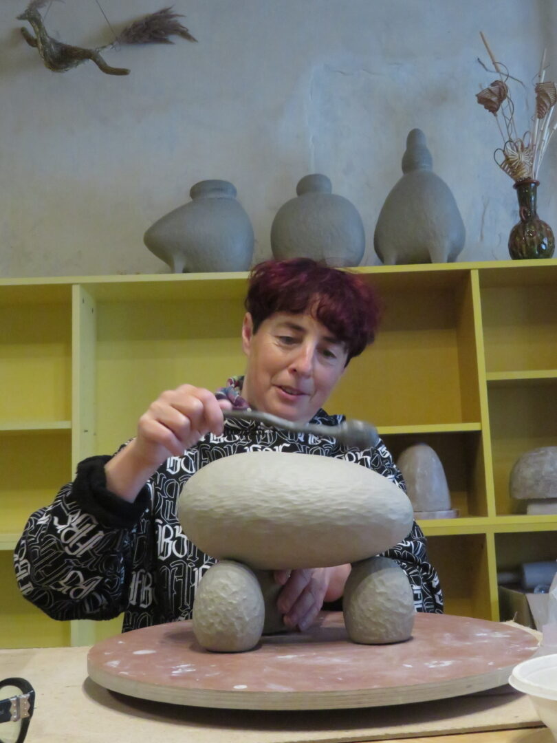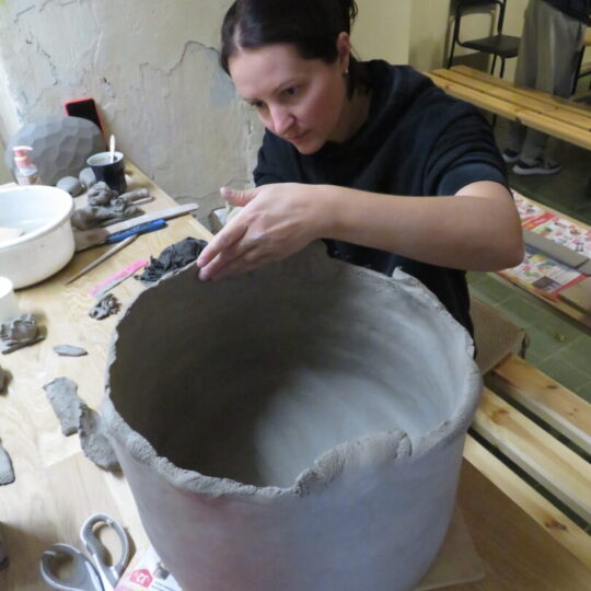 Viena iš jų, latvė Anda Svarane, atvažiavusi iš Zase miestelio, Lietuvoje jau nebe naujokė. Pasak jos, ilga, net 20 metų draugystė sieja ją ir Igorį Kovalevskį, Arūną Augutį, Egidijų Radvenską. „Į plenerus kviečiamės vieni kitus, nes žinom, kad bus darbų kokybė. Pasikvietus nepažįstamą menininką, pasitaiko netikėtumų tiek į gerąją, tiek į blogąją pusę. Man svarbiausia išraiškinga faktūra, o įkvėpimo semiuosi iš gamtos“, – dailindama abstrakčios formos lipdinį kalbėjo Anda. Ji pristato interjerui skirtas monumentalias vazas – indus, kurie subtiliai dekoruoti pasikartojančiomis faktūromis.