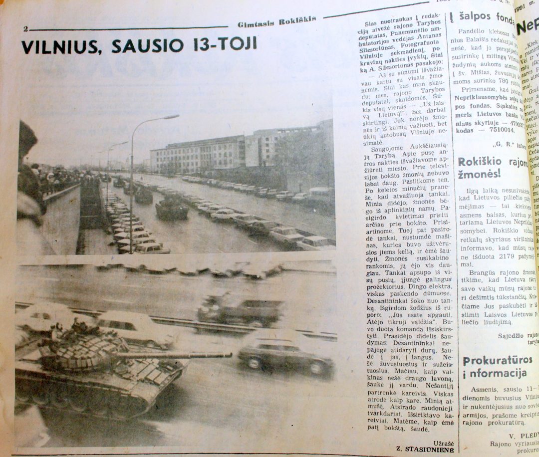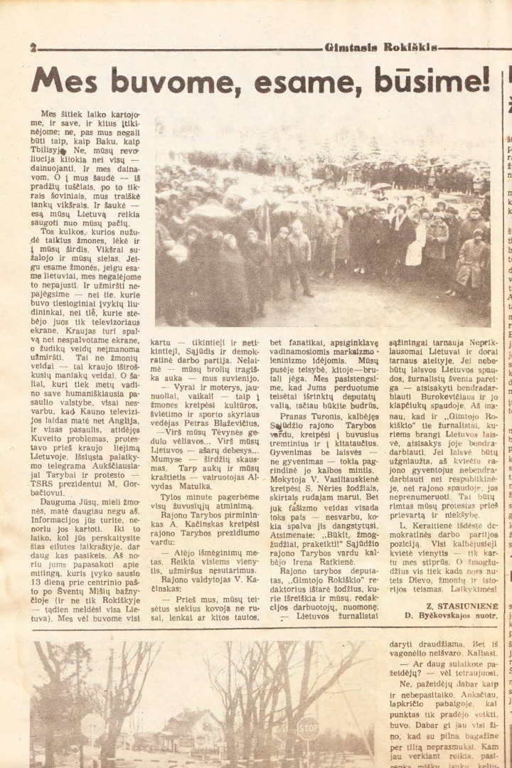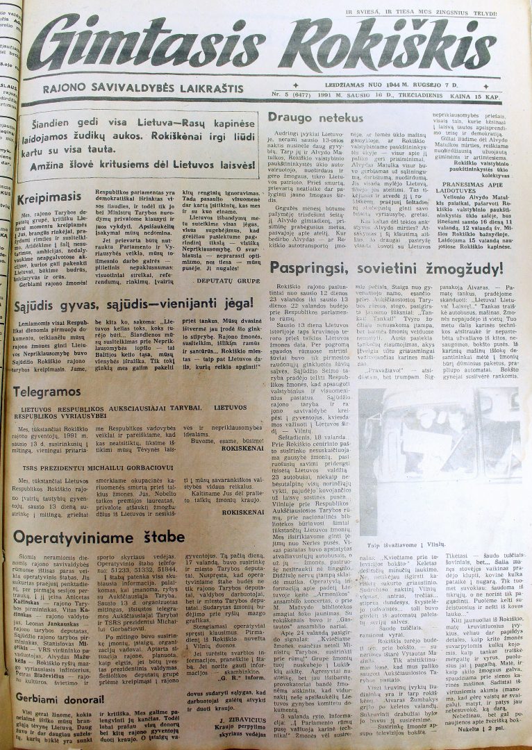 „Dauguma Jūsų, mieli žmonės, matė daugiau negu aš. Informacijos jūs turite, nenoriu jos kartoti. Iki to laiko, kol jūs perskaitysite šias eilutes laikraštyje, dar daug kas pasikeis. Aš noriu jums papasakoti apie mitingą, kuris įvyko sausio 13 dieną prie centrinio pašto po šventų Mišių bažnyčioje (ir ne tik Rokiškyje – tądien meldėsi visa Lietuva), – mes vėl buvome visi kartu – tikintieji ir netikintieji, Sąjūdis ir Demokratinė darbo partija. Nelaimė – mūsų brolių tragiška auka – mus suvienijo.