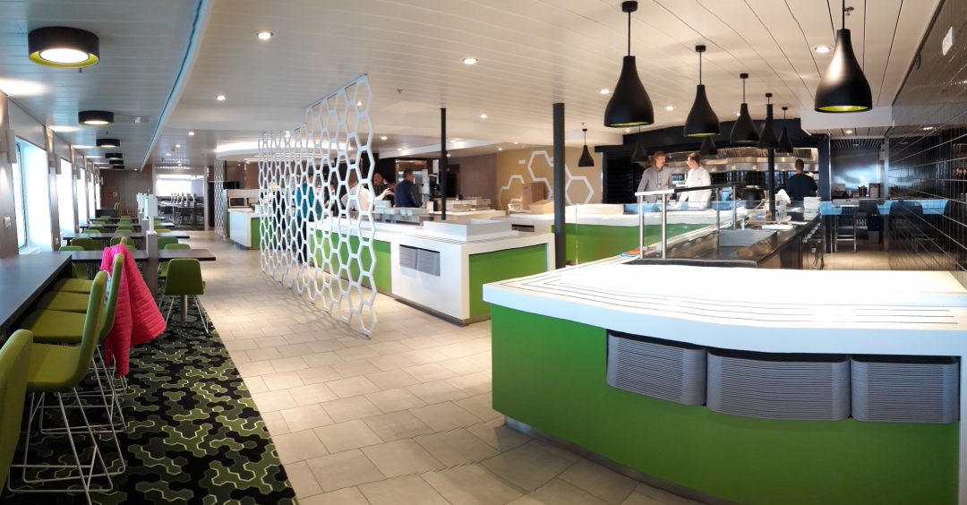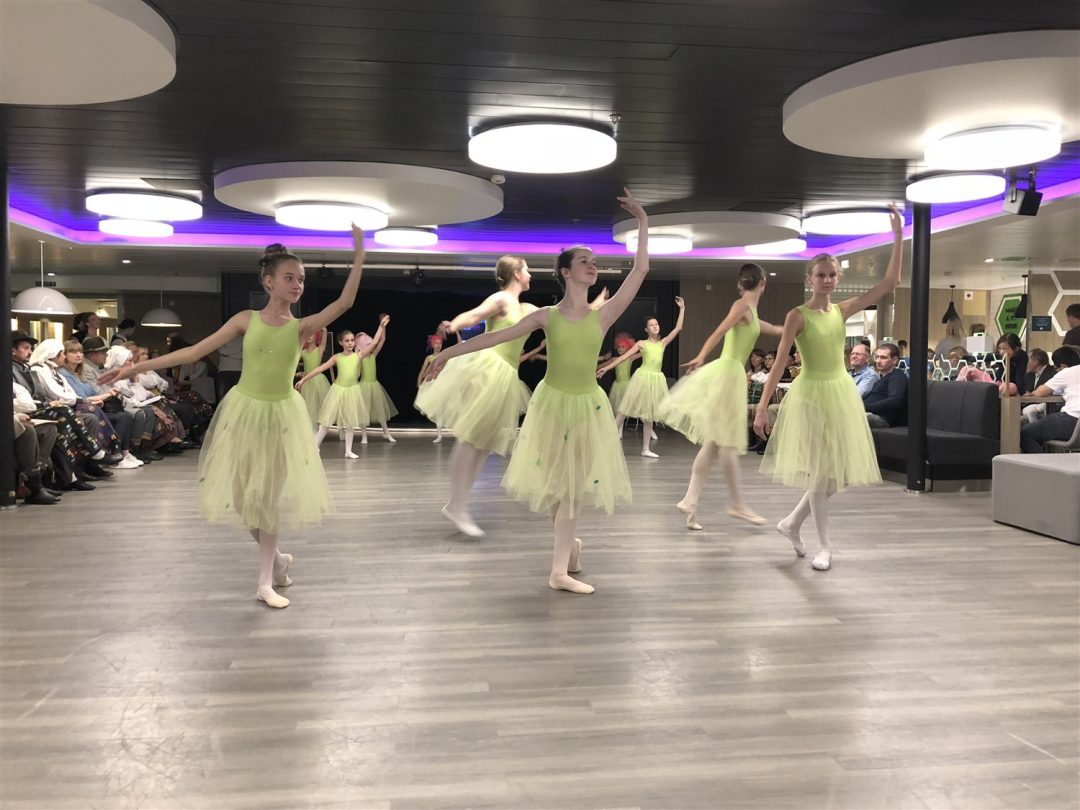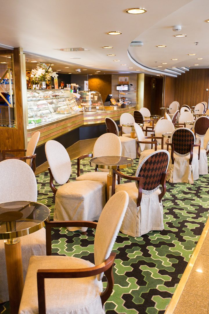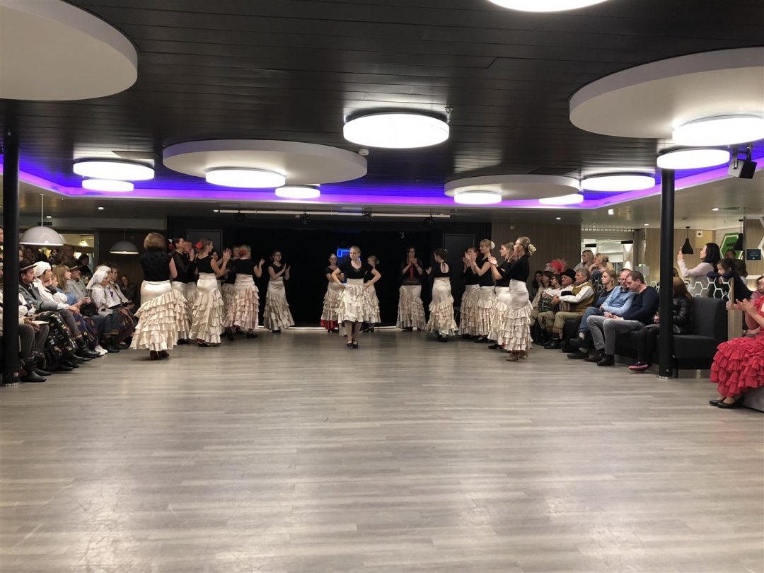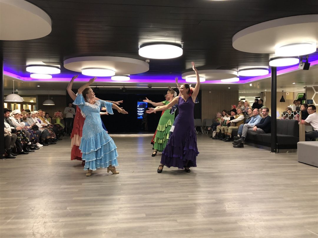 Laivas išties didingas, tad be Kotrynos pagalbos neišsiverčiau. Čia visko apstu: parduotuvių, kavinių, sauna, nestinga visų kitų patogumų, prie kurių įpratęs šiuolaikinis žmogus. Kartu buvo surengtas šokių kruizas – įvairiausi Lietuvos meniniai kolektyvai visą savaitgalį linksmino laivo keleivius. Kaip pasakojo Kotryna, kaskart keliautojus pasitinka vis kitoks teminis kruizas.