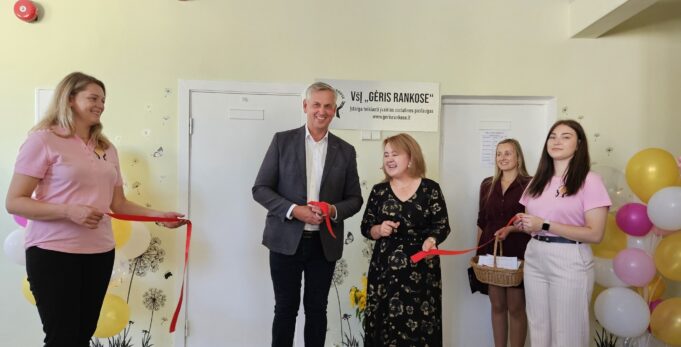 Atidarymo juostelę kartu su įstaigos vadove D. Kietiene kirpdamas rajono meras R. Godeliauskas pajuokavo, kad jau nesuskaičiuoja, kiek juostelių sukarpė.
