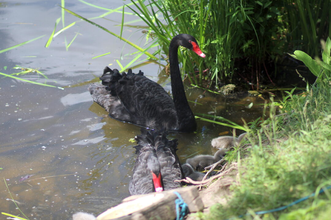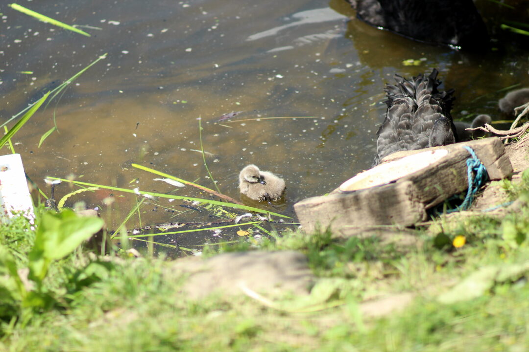 Juodųjų gulbių šeimyna vėl pagausėjo. Išperėti net penki gulbiukai. Lizde dar likę du kiaušiniai, ar prie jų gulbė grįš – nežinia. Visą dėmesį šiuo metu pora skiria naujoms atžaloms.